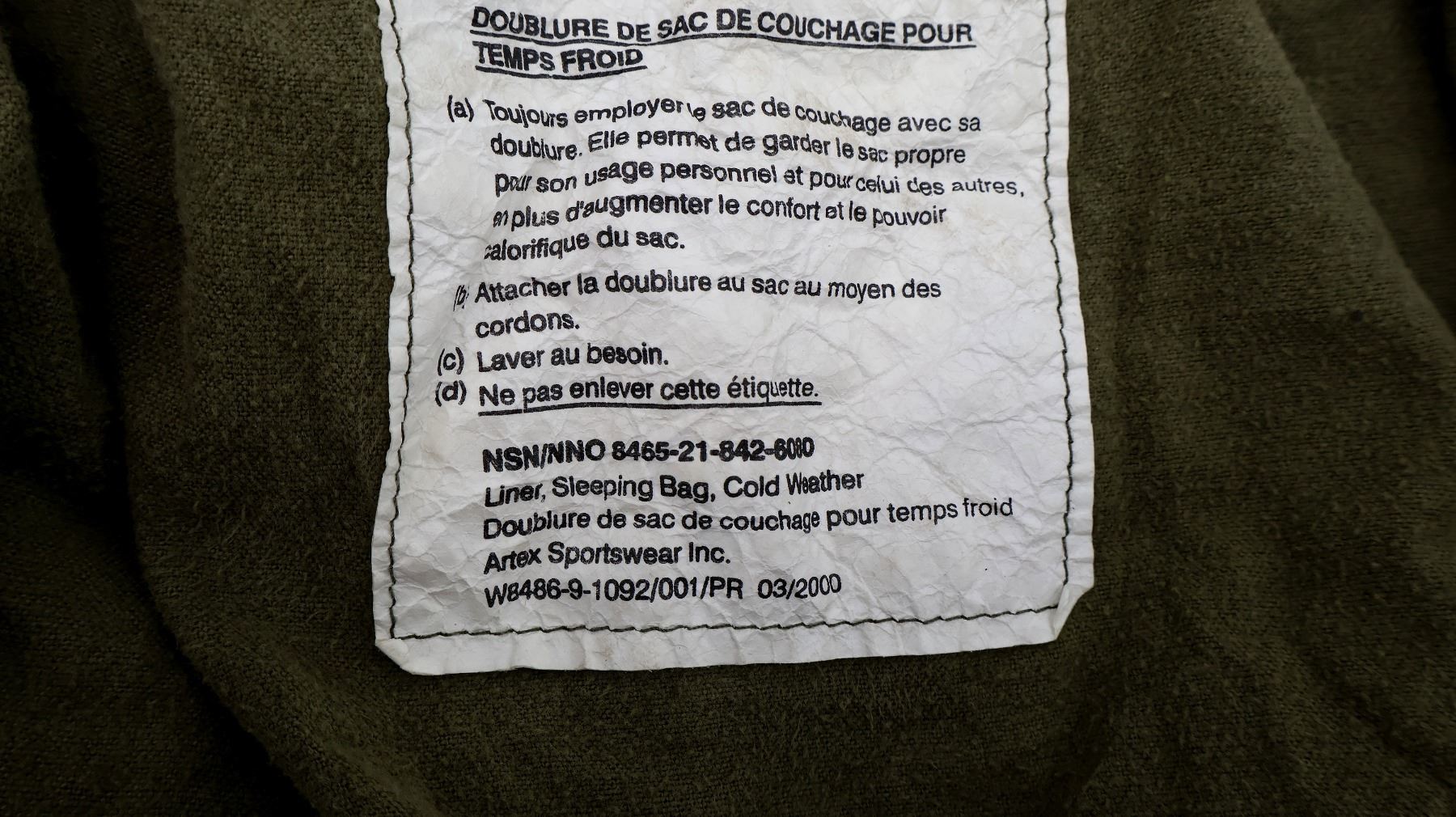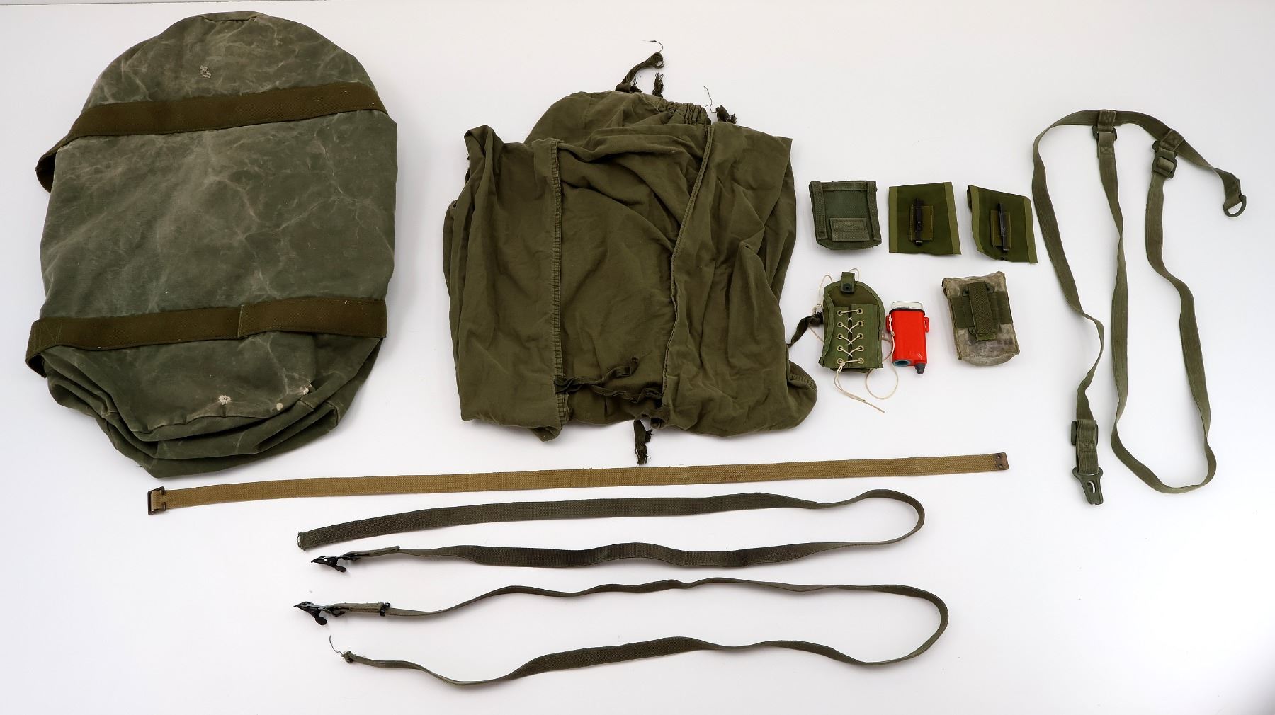 LOT INCLUDES; (1) CANADIAN MILITARY STYLE DUFFLE BAG, FAINT / UN-CLEAR INK STAMP MARKING ON SIDE OF BAG, BUTTON / ZIPPERED CLOSURE, (WORKS), CANVAS CARRY HANDLES, SHOWS AGE / WEAR / TEAR, (1) CANADIAN MILITARY COLD WEATHER SLEEPING BAG LINER, MARKED: "NSN/NNO 8465-21-842-6080, LINER, SLEEPING BAG, COLD WEATHER" ETC., VARIOUS CANVAS TIES, SECTION CUT OUT, SHOWS AGE / WEAR / TEAR, APPROX. 76" X 24", (4) ASSORTED STYLE TAN / GREEN CANVAS STRAPS, NO VISIBLE MARKINGS, THREE APPEAR TO BE FOR CARGO, OALS APPROX. 43" TO 70", (2) MILITARY STYLE GREEN NYLON AMMO POUCHES, MARKED: "MADE IN KOREA", METAL BELT CLIPS, (1) CANADIAN MILITARY STYLE GREEN CANVAS AMMO POUCH, VARIOUS FAINT / UN-CLEAR MARKINGS, BELT LOOP, SHOWS AGE / WEAR, (1) U.S. MILITARY DISTRESS LIGHT MARKER WITH GREEN NYLON POUCH, LIGHT MARKED: "US", "MODEL NO. FED SDU-5/E, SERIAL NO. 011164, TYPE LIGHT MARKER, DISTRESS, NSN 6230-00-067-5209" ETC., MISSING CAP FOR BATTERY COMPARTMENT, UN-TESTED, ETC. SEE PHOTOS.