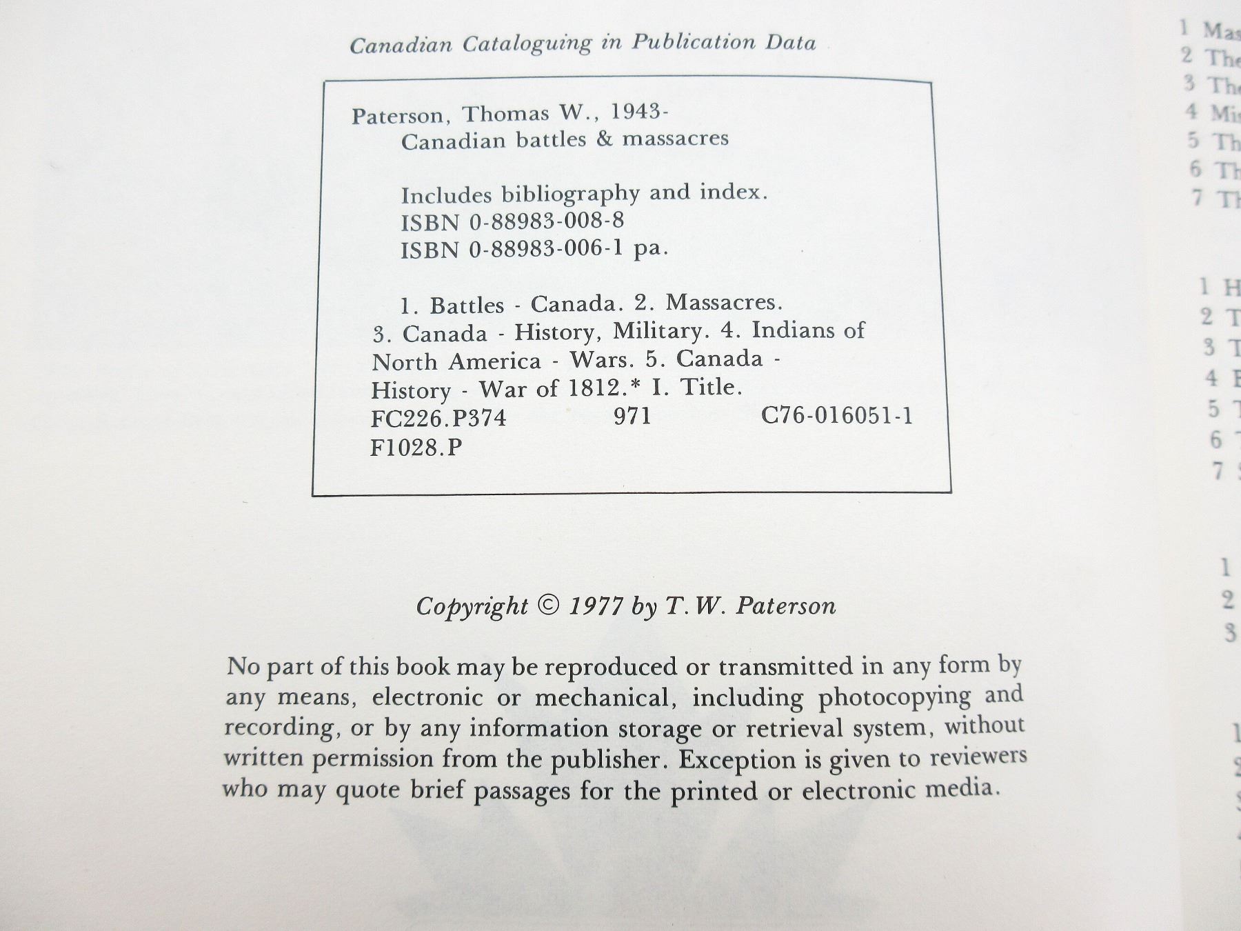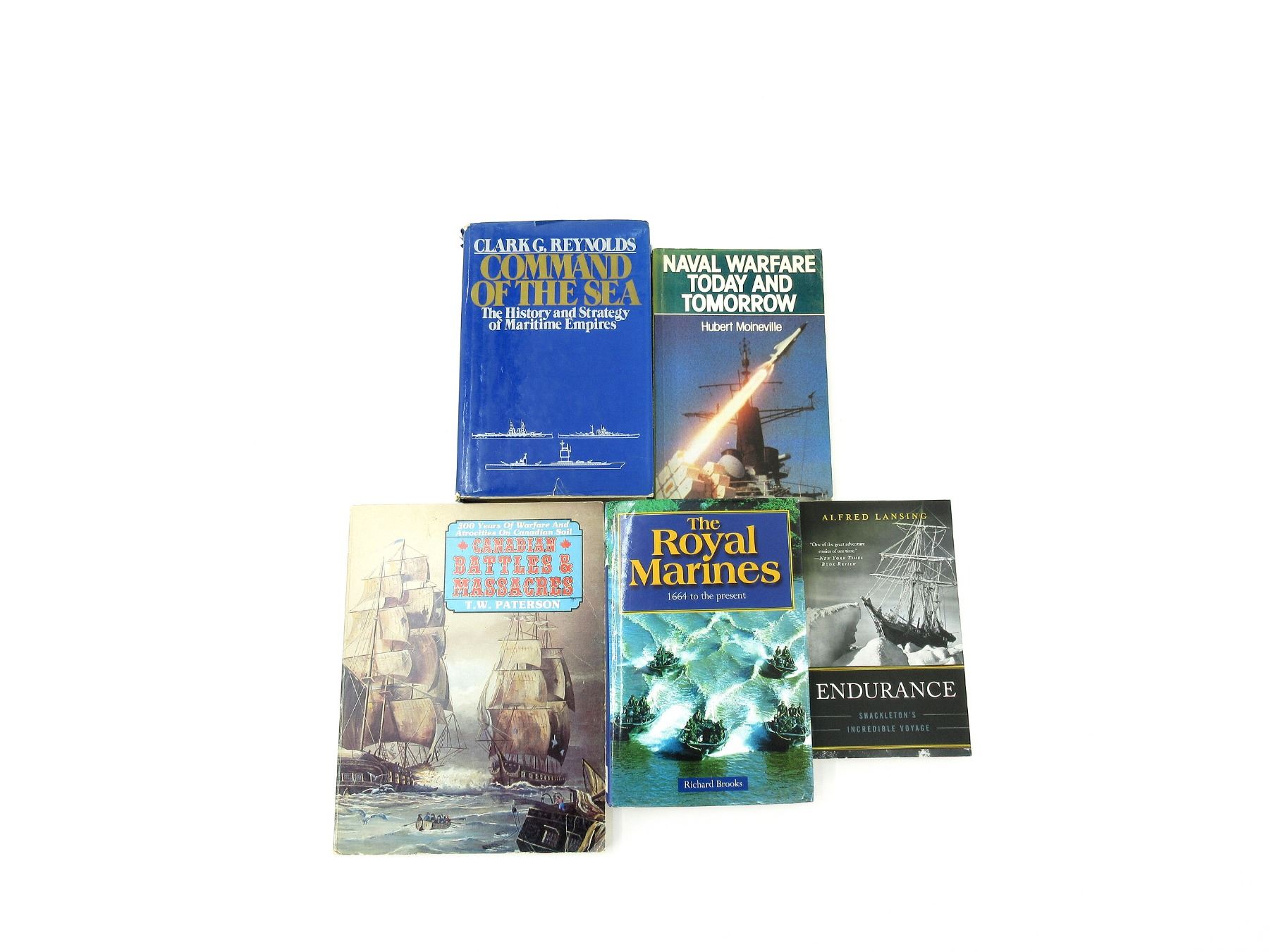 LOT INCLUDES; (1) "COMMAND OF THE SEA, THE HISTORY AND STRATEGY OF MARITIME EMPIRES" BOOK BY CLARK G. REYNOLDS, HARD COVER WITH DUST COVER, ISBN: 0-688-00267-6, (1) "NAVAL WARFARE TODAY AND TOMORROW" BOOK BY HUBERT MOINEVILLE, SOFT COVER, ISBN: 0-631-13291-0, (1) "THE ROYAL MARINES, 1664 TO THE PRESENT" BOOK BY RICHARD BROOKS, HARD COVER WITH DUST COVER, ISBN: 1-55750-007-X, (1) "CANADIAN BATTLES & MASSACRES" BOOK BY T.W. PATERSON, SOFT COVER, COPYRIGHT 1977 & (1) "ENDURANCE, SHACKLETON'S INCREDIBLE VOYAGE" BOOK BY ALFRED LANSING, SOFT COVER, ISBN: 978-0-78670-621-1. SEE PHOTOS.