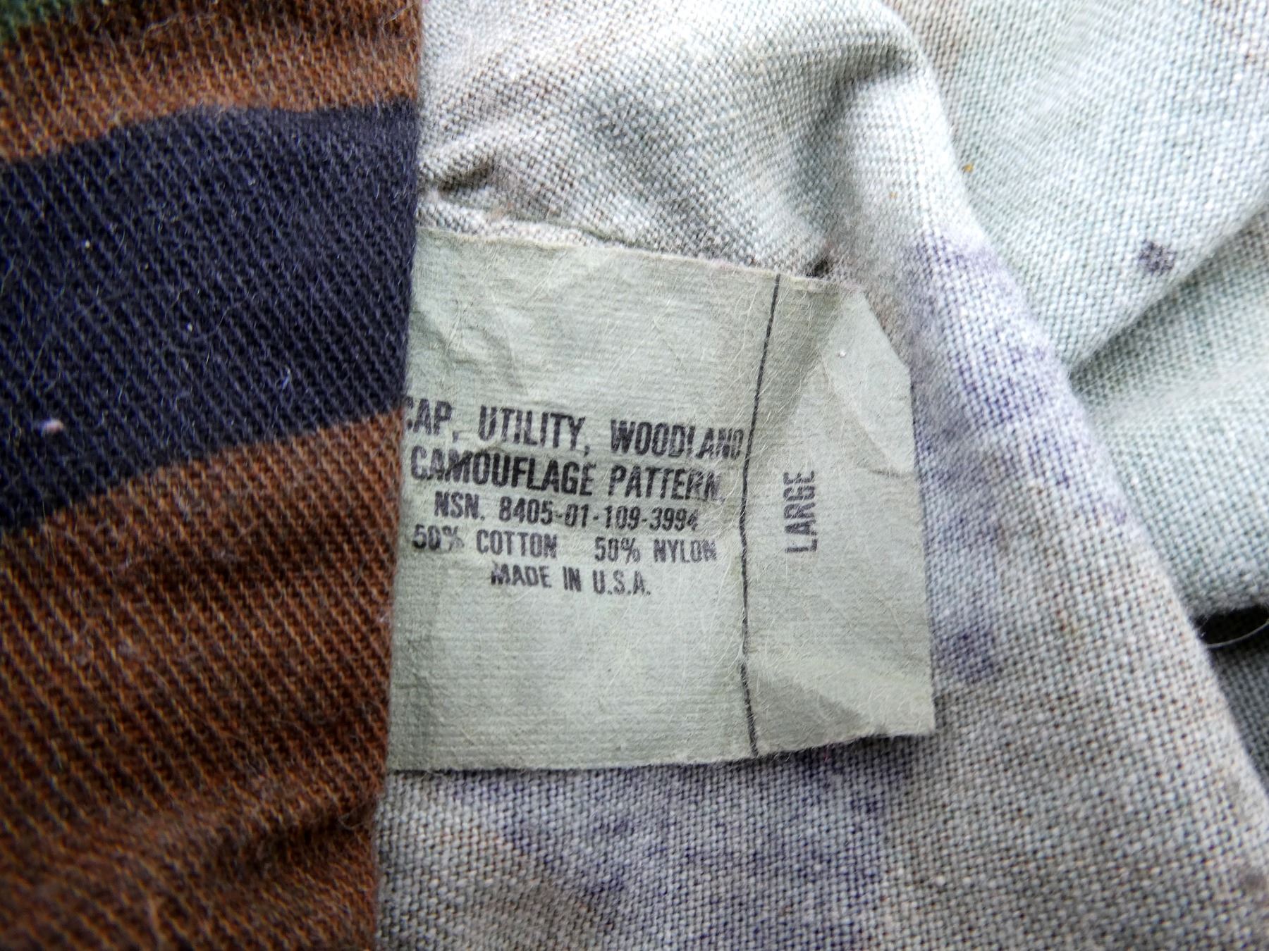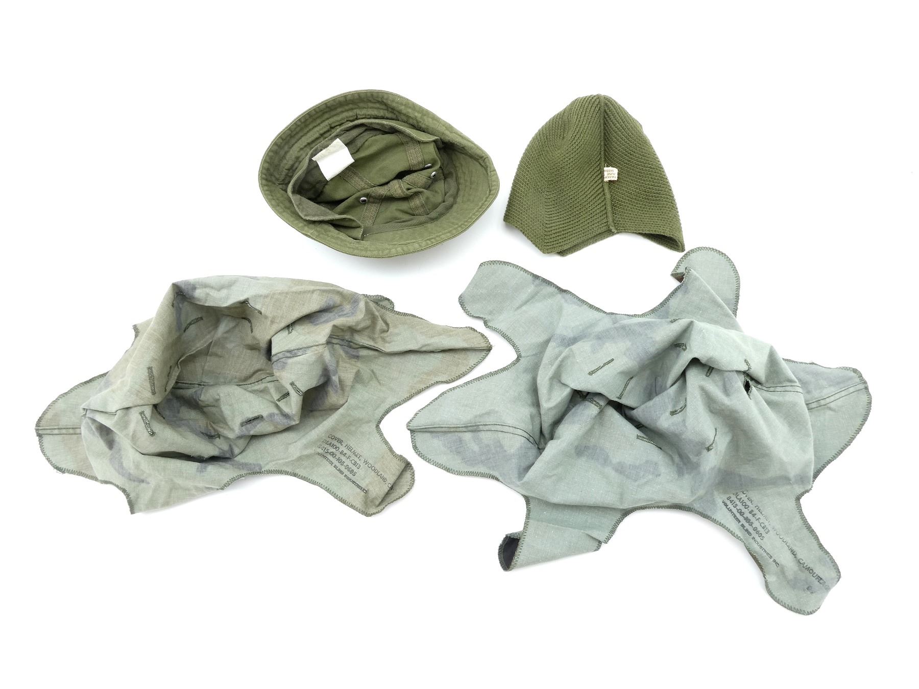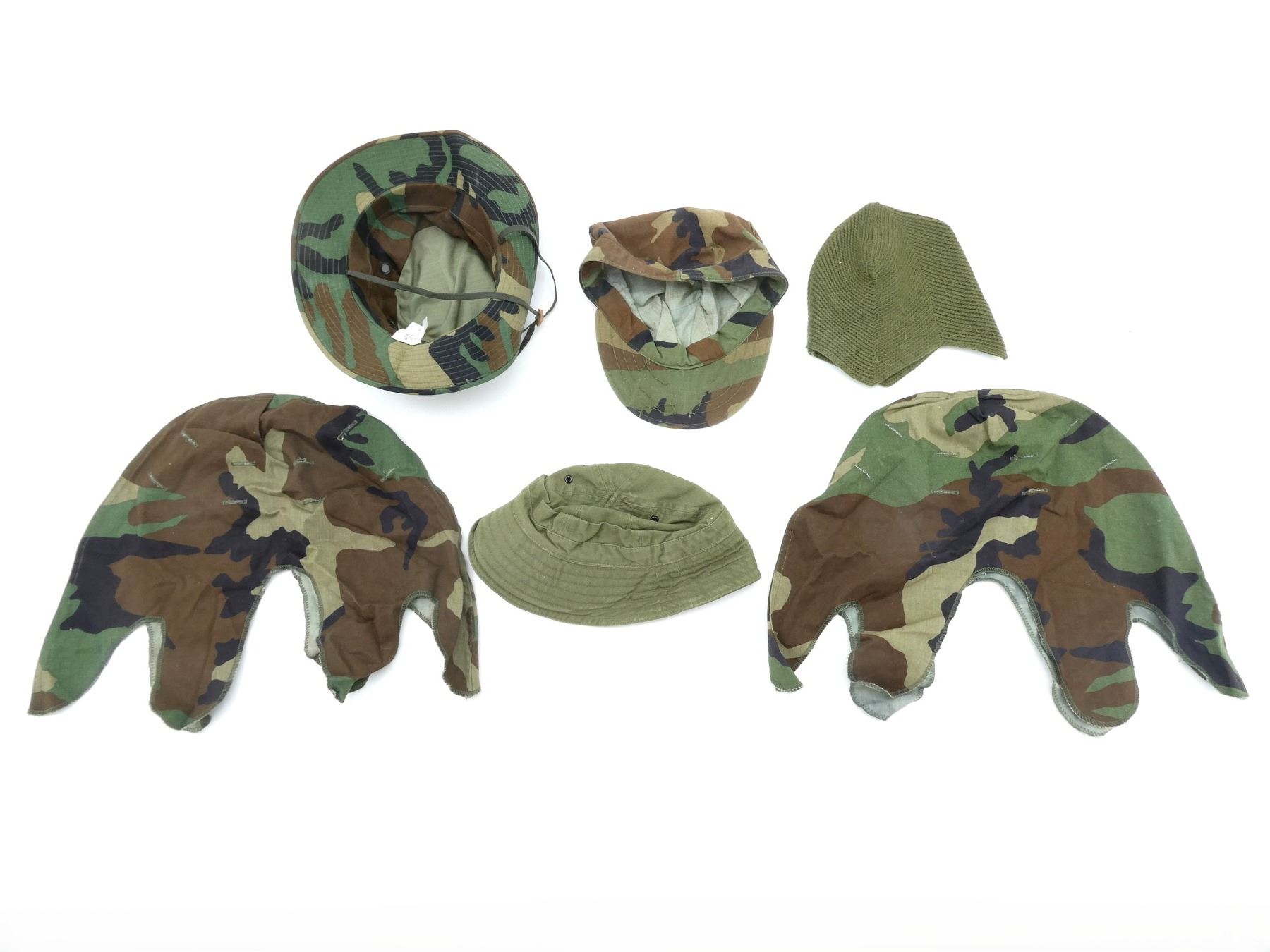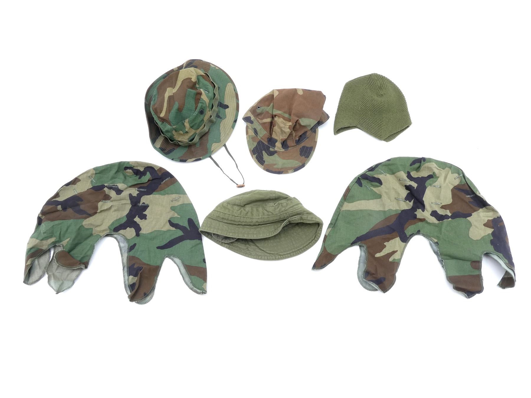 LOT INCLUDES; (2) U.S. MILITARY WOODLAND CAMO HELMET COVERS, VARIOUS INK STAMP MARKINGS, APPEARS NEW OLD STOCK, (1) U.S. MILITARY WOODLAND CAMO SUN HAT, SIZE 6 7/8", VARIOUS LABELS / MARKINGS, APPEARS NEW OLD STOCK, (1) U.S. MILITARY WOODLAND CAMO UTILITY CAP, SIZE LARGE, VARIOUS LABELS / MARKINGS, SHOWS WEAR / TEAR, (1) CANADIAN MILITARY GREEN CANVAS UTILITY COMBAT CAP "QUARPEL", SIZE 6 7/8, VARIOUS MARKINGS ON LABEL, SHOWS AGE / WEAR & (1) UNKNOWN MILITARY GREEN KNIT HAT, MARKED: "PARKHURST, JUNE 1971, MEDIUM". SEE PHOTOS.