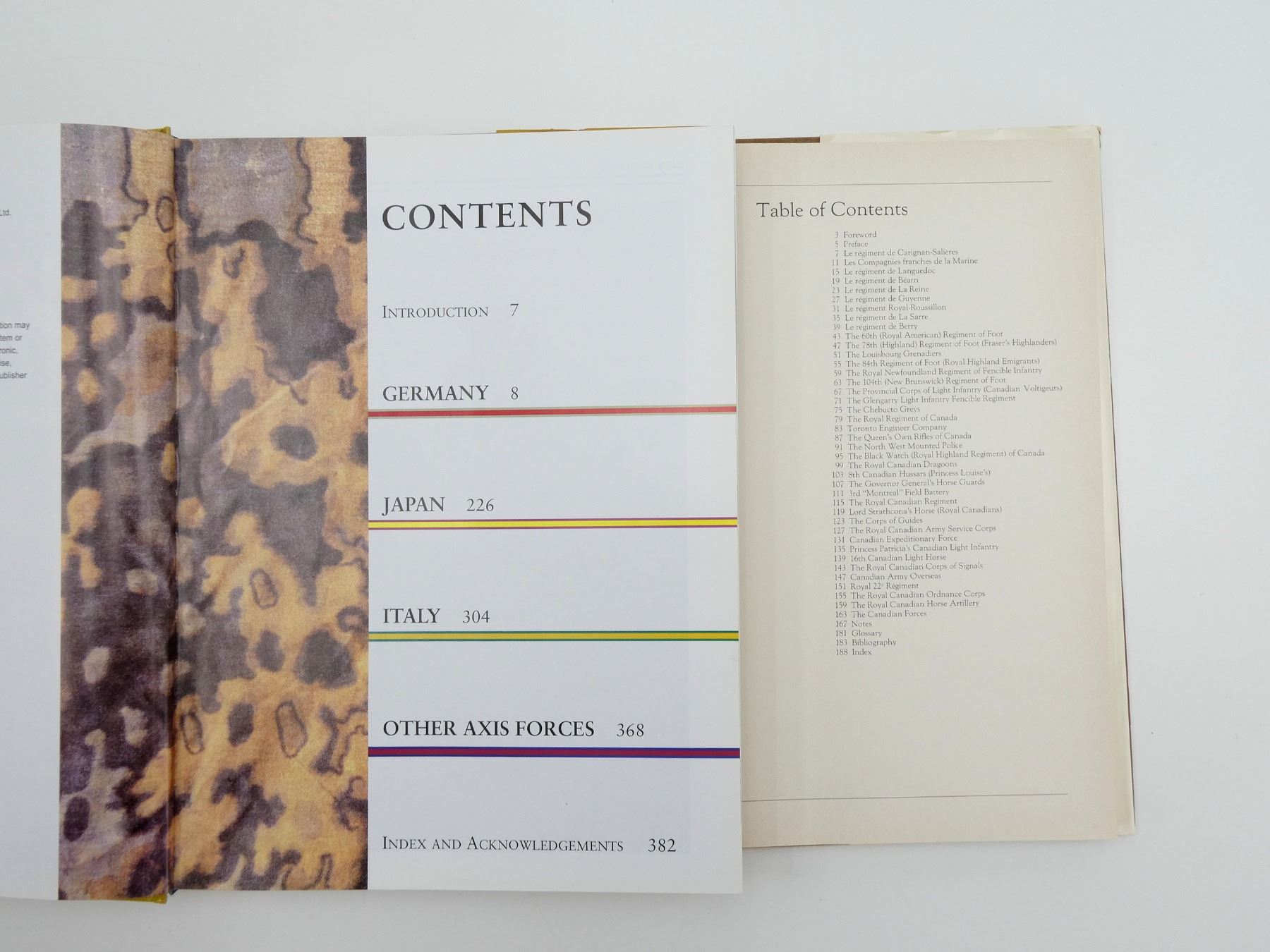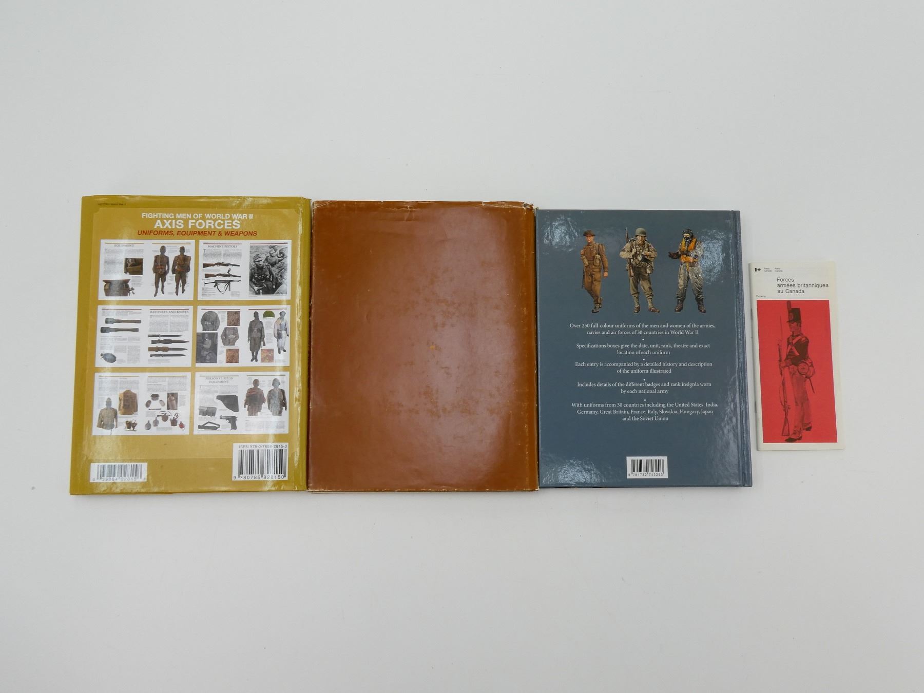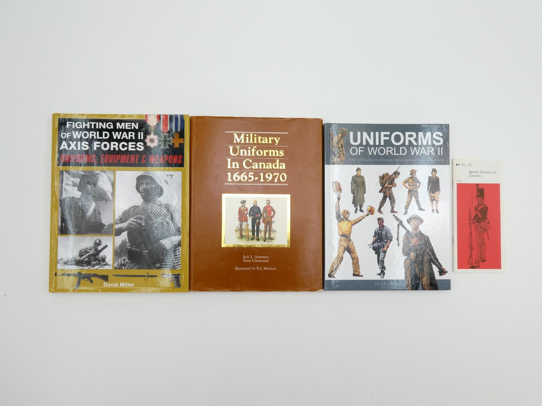 LOT INCLUDES; (1) "FIGHTING MEN OF WORLD WAR II AXIS FORCES" BOOK BY DAVID MILLER, HARD COVER WITH DUST COVER, ISBN-13: 978-0-7858-2815-0, (1) "MILITARY UNIFORMS IN CANADA 1665-1970" BOOK BY JACK L. SUMMERS & RENE CHARTRAND, HARD COVER WITH DUST COVER, ISBN: 0-660-10346-X, (1) "UNIFORMS OF WORLD WAR II" BOOK BY PETER DARMAN, HARD COVER, ISBN: 978-1-78274-329-3 & (1) "BRITISH SOLDIERY IN CANADA" BOOKLET, SOFT COVER. SEE PHOTOS.