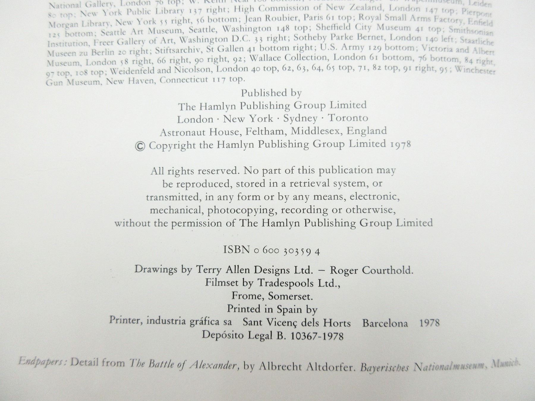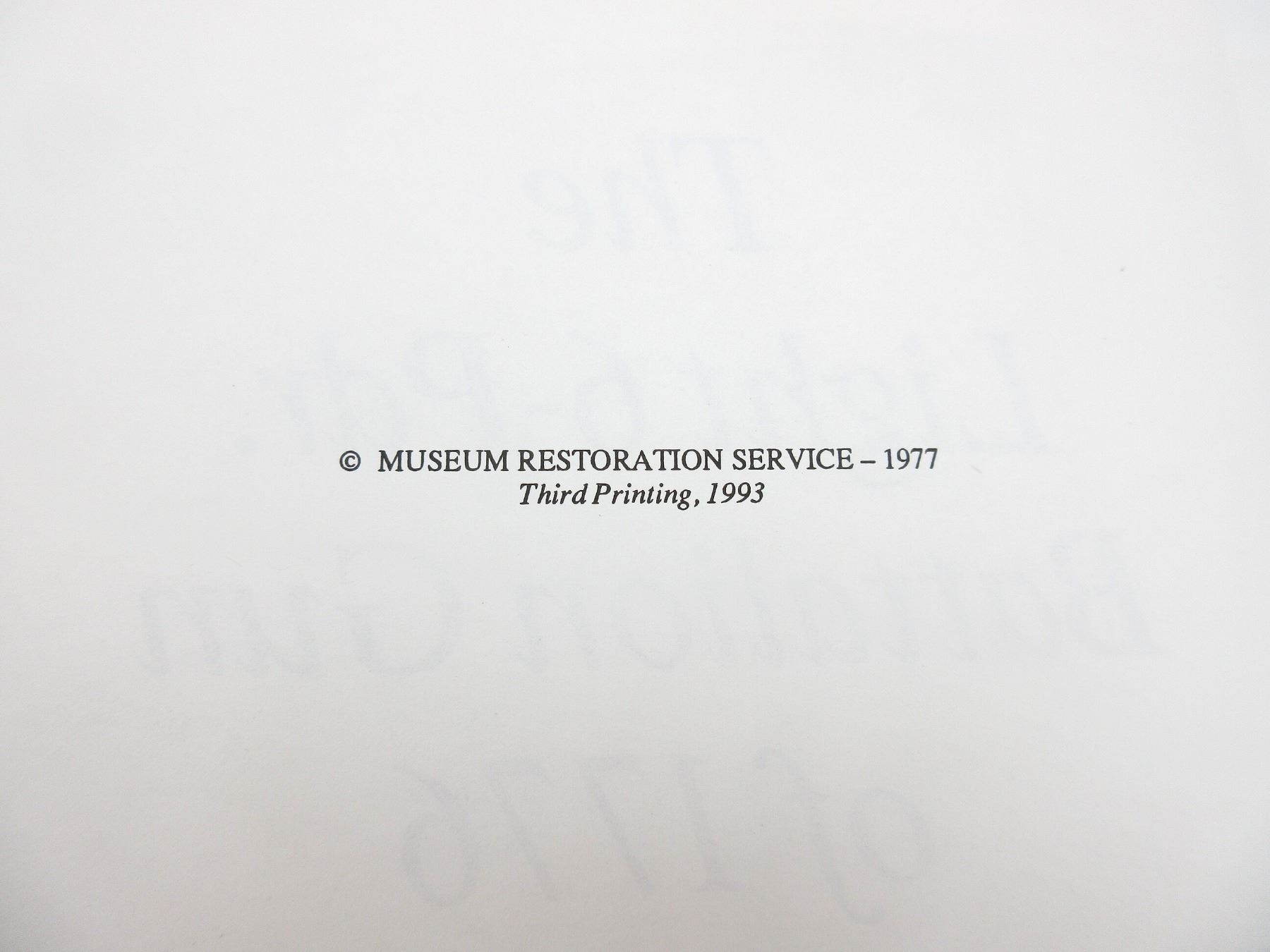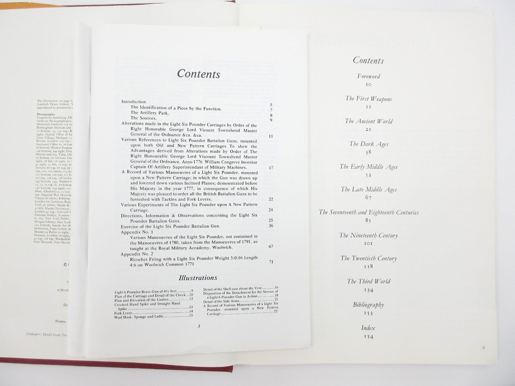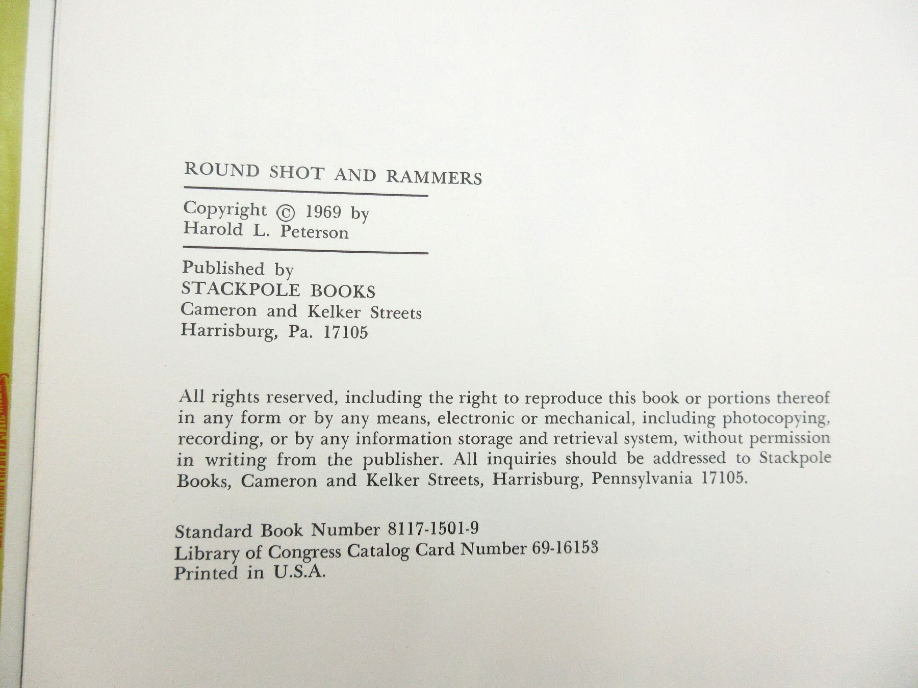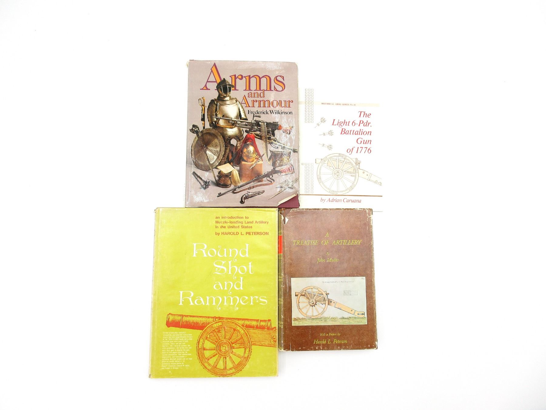 LOT INCLUDES; (1) "ROUND SHOT AND RAMMERS" BOOK BY HAROLD L. PETERSON, HARD COVER WITH DUST COVER, SBN: 8117-1501-9, (1) "ARMS AND ARMOUR" BOOK BY FREDERICK WILKINSON, HARD COVER WITH DUST COVER, ISBN: 0-600-30359-4, (1) "A TREATISE OF ARTILLERY" BOOK BY JOHN MULLER, PRINT 672 / 850 COPIES, HARD COVER WITH DUST COVER, COPYRIGHT 1965 & (1) "HISTORICAL ARMS SERIES NO. 16, THE LIGHT 6-PDR. BATTALION GUN OF 1776" BOOK BY ADRIAN CARUANA, SOFT COVER, THIRD PRINT, 1973. SEE PHOTOS.