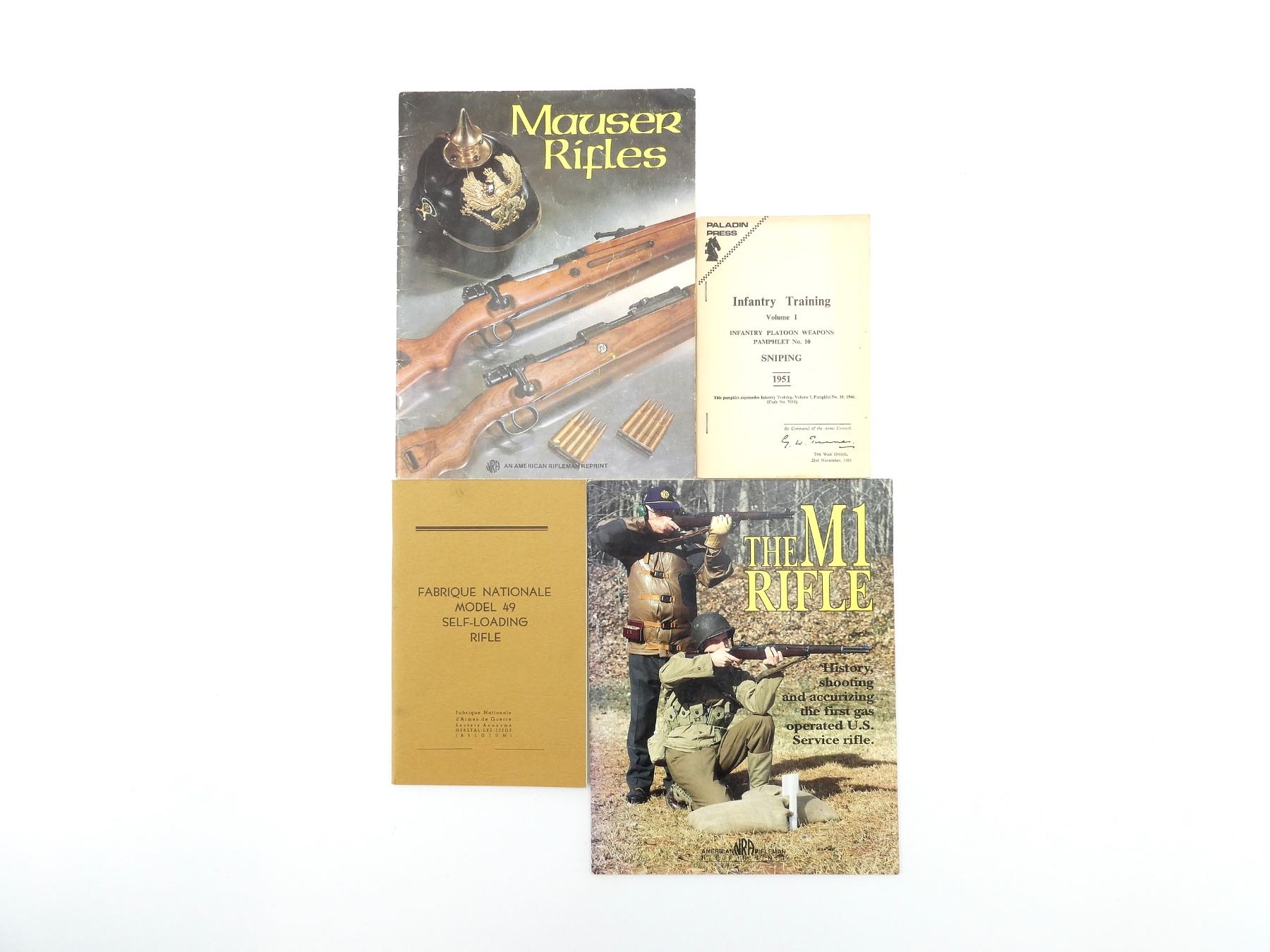 LOT INCLUDES; (1) "THE M1 RIFLE" AMERICAN RIFLEMAN MAGAZINE, THIRD EDITION, SECOND PRINTING, SOFT COVER, COPYRIGHT 1993, (1) "MAUSER RIFLES" AMERICAN RIFLEMAN MAGAZINE, REVISED EDITION, FOURTH PRINTING, SOFT COVER, COPYRIGHT 1985, (1) "FABRIQUE NATIONALE MODEL 49 SELF-LOADING RIFLE" MANUAL, SOFT COVER & (1) "INFANTRY TRAINING, VOLUME 1, INFANTRY PLATOON WEAPONS, PAMPHLET NO. 10, SNIPING, 1951" MANUAL, SOFT COVER, 1951. SEE PHOTOS.