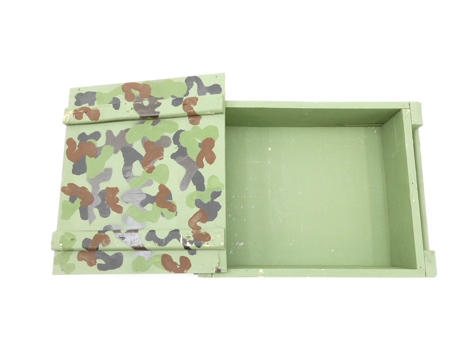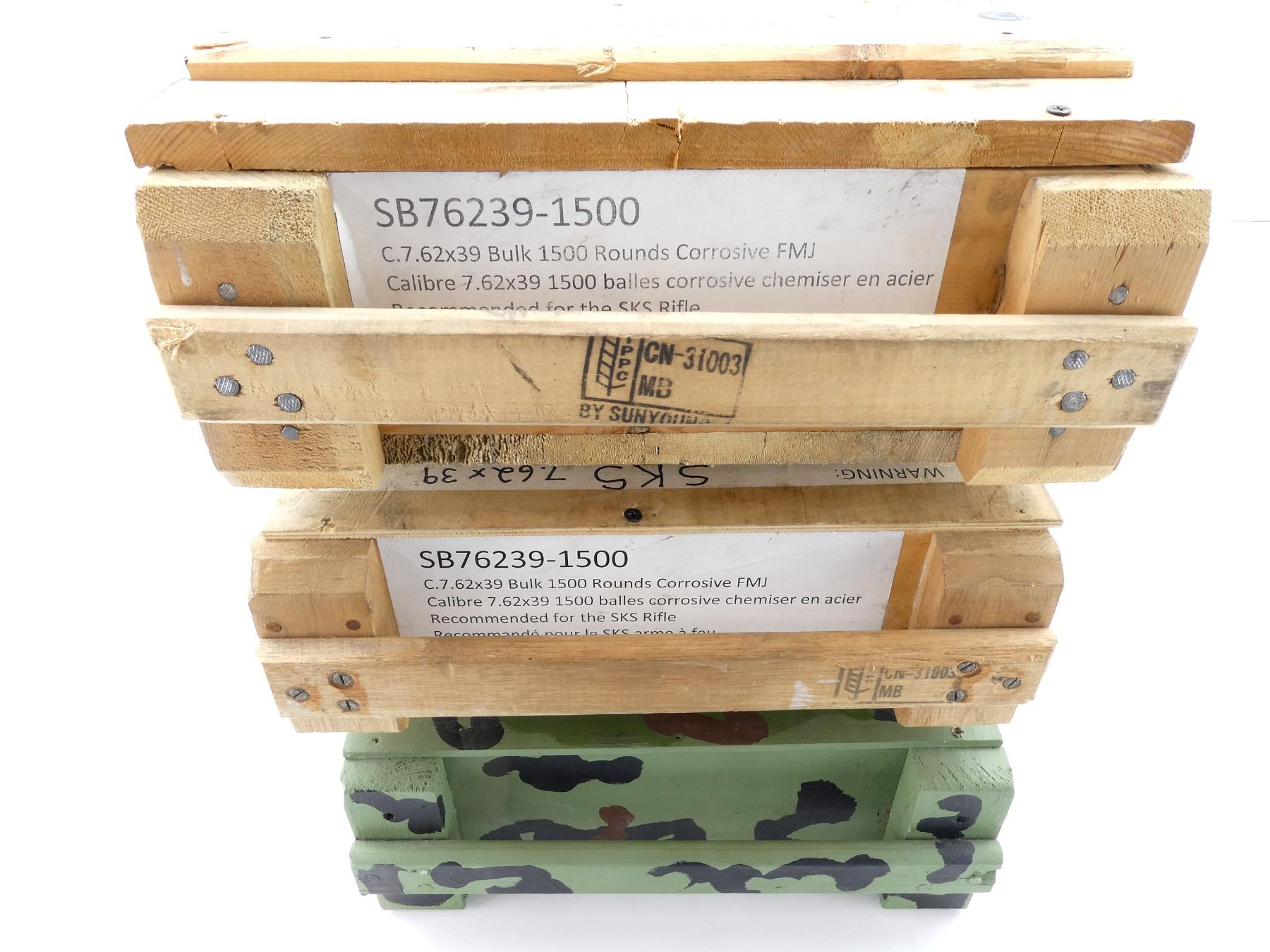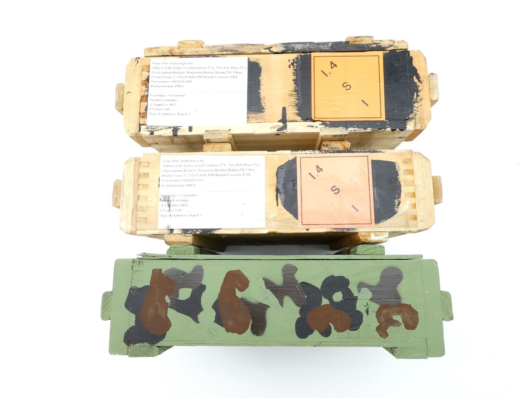 LOT INCLUDES; (2) WOODEN AMMO CRATES WITH LIDS (EMPTY) & (1) GREEN PAINTED WOODEN AMMO CRATE WITH LID (EMPTY), VARIOUS MARKINGS, APPROX. 18.25" X 13.25" X 6.25". SEE PHOTOS.