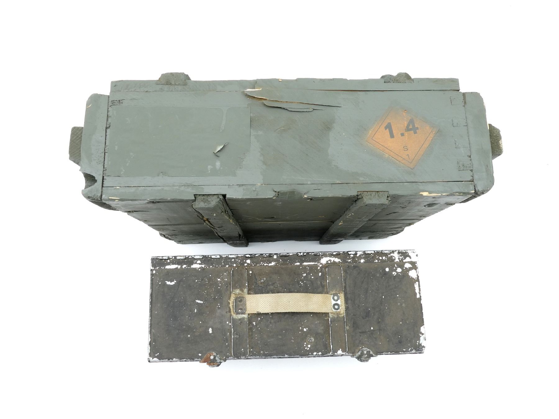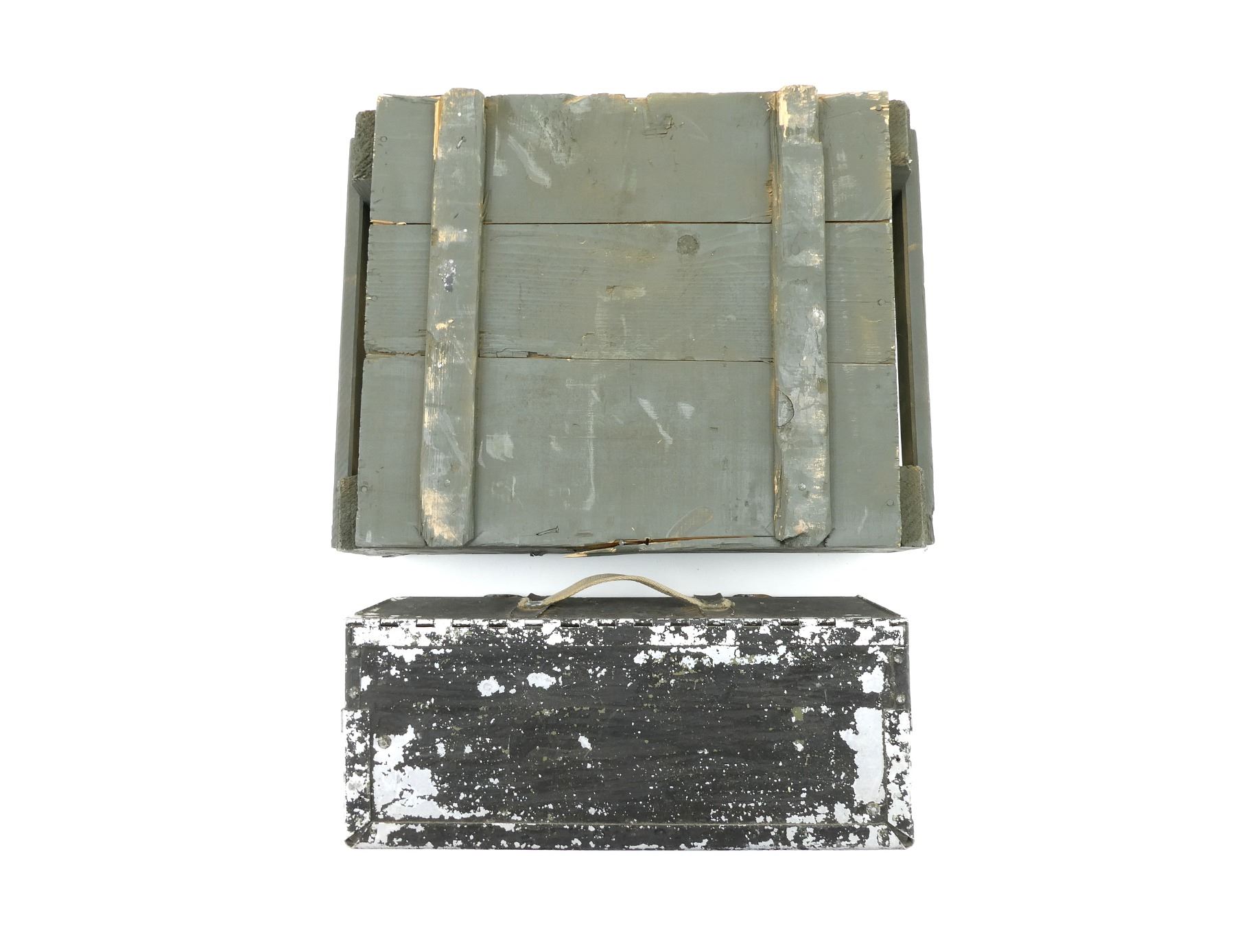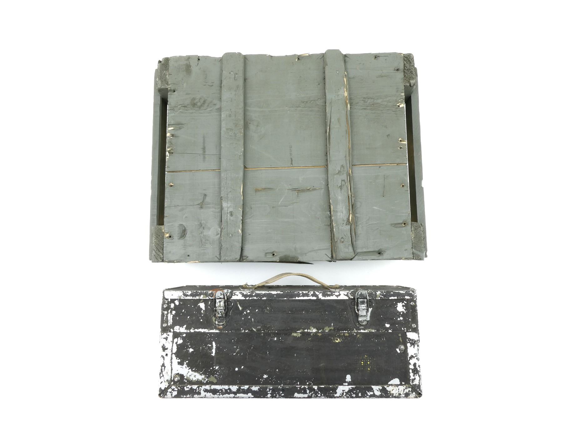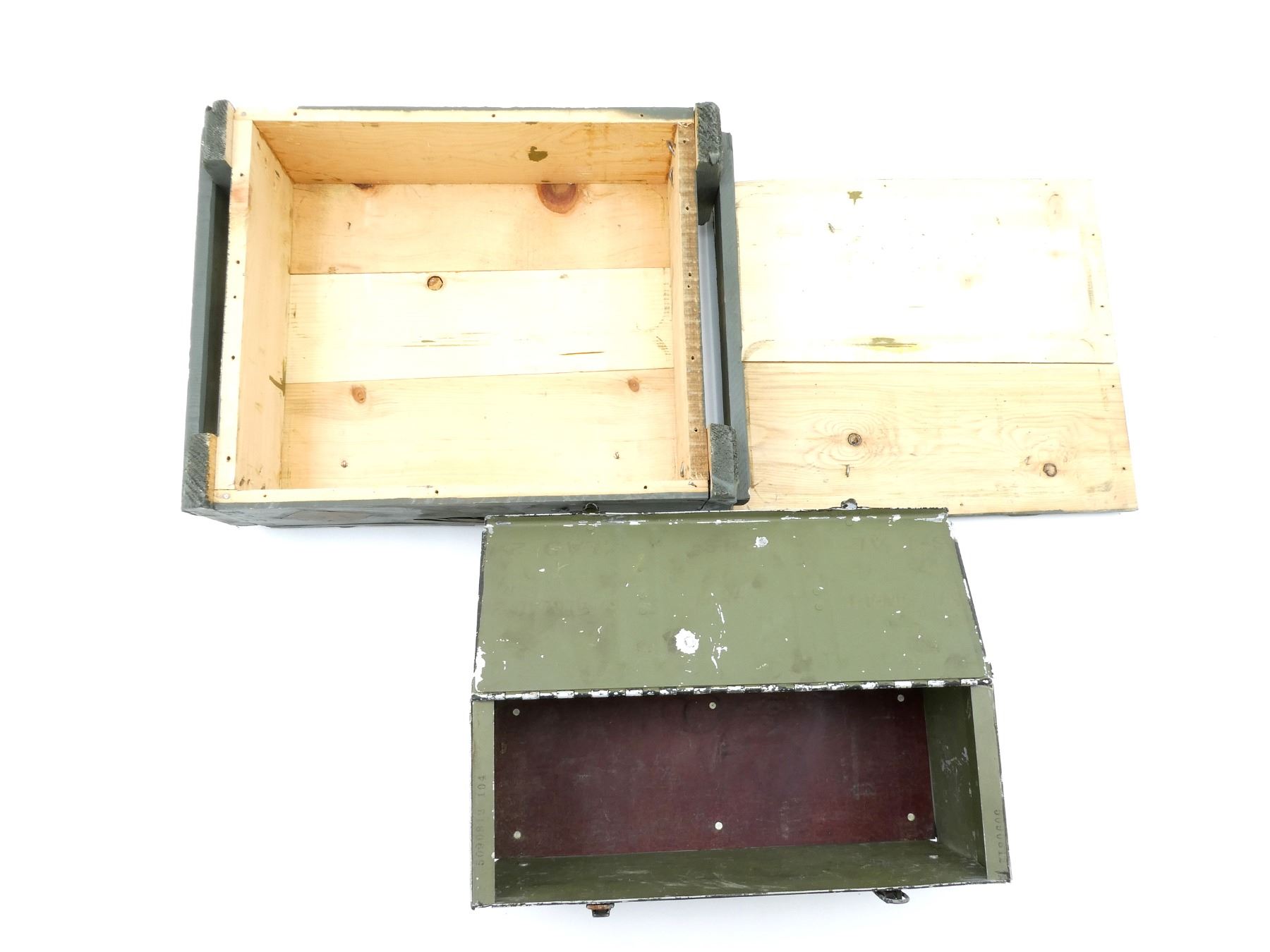 LOT INCLUDES; (1) GREEN PAINTED WOOD AMMO CRATE WITH LID (CRATE ONLY), NO VISIBLE MARKINGS (PAINTED OVER), APPROX. 18 5/8" X 13 5/8" X 6" & (1) RCAF STYLE METAL AMMO TIN, VARIOUS MARKINGS INSIDE, PAINTED BLACK, LATCH CLOSURE, CANVAS CARRY HANDLE, APPROX. 15 5/8" X 6" X 6.5". SEE PHOTOS.