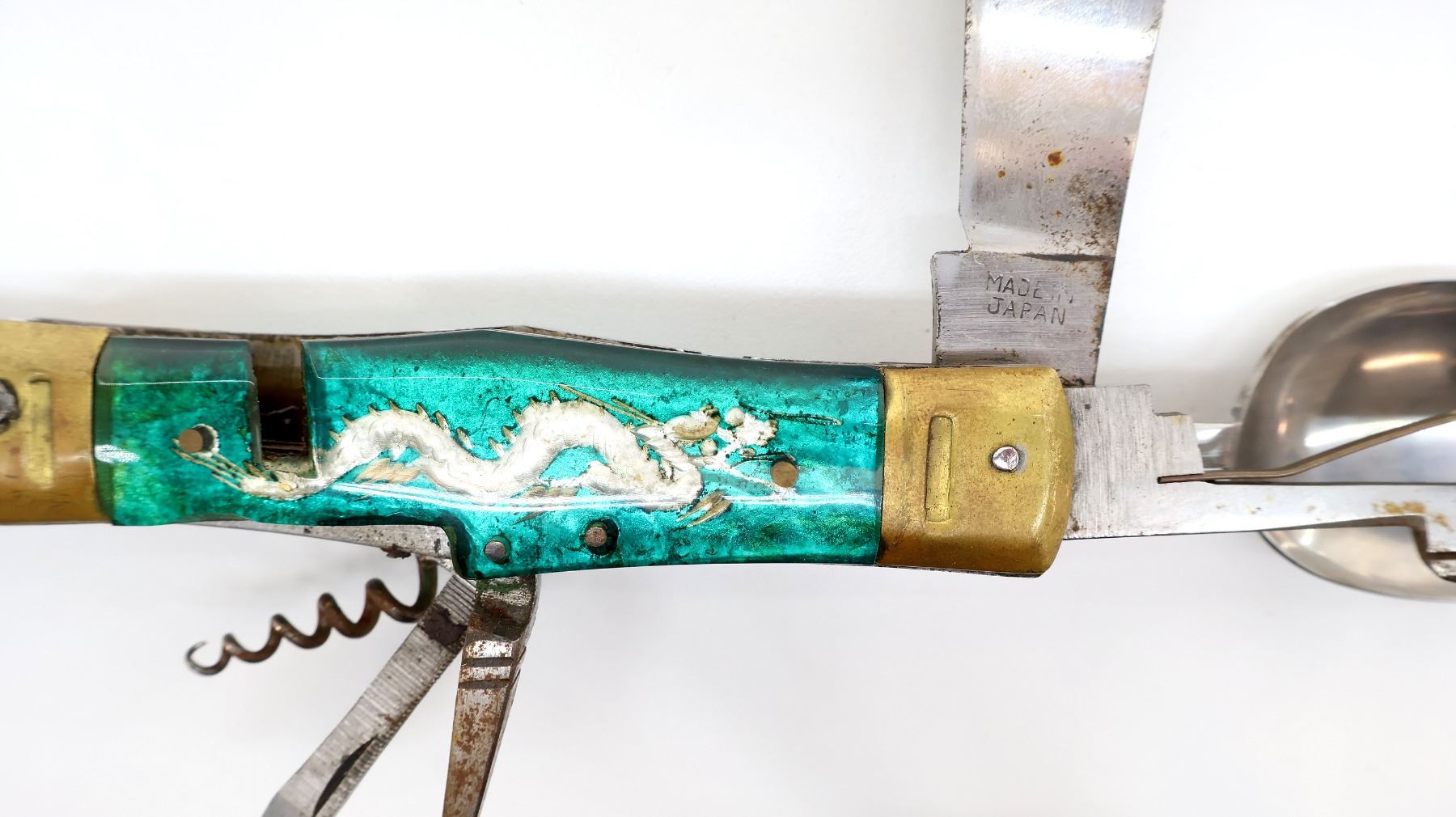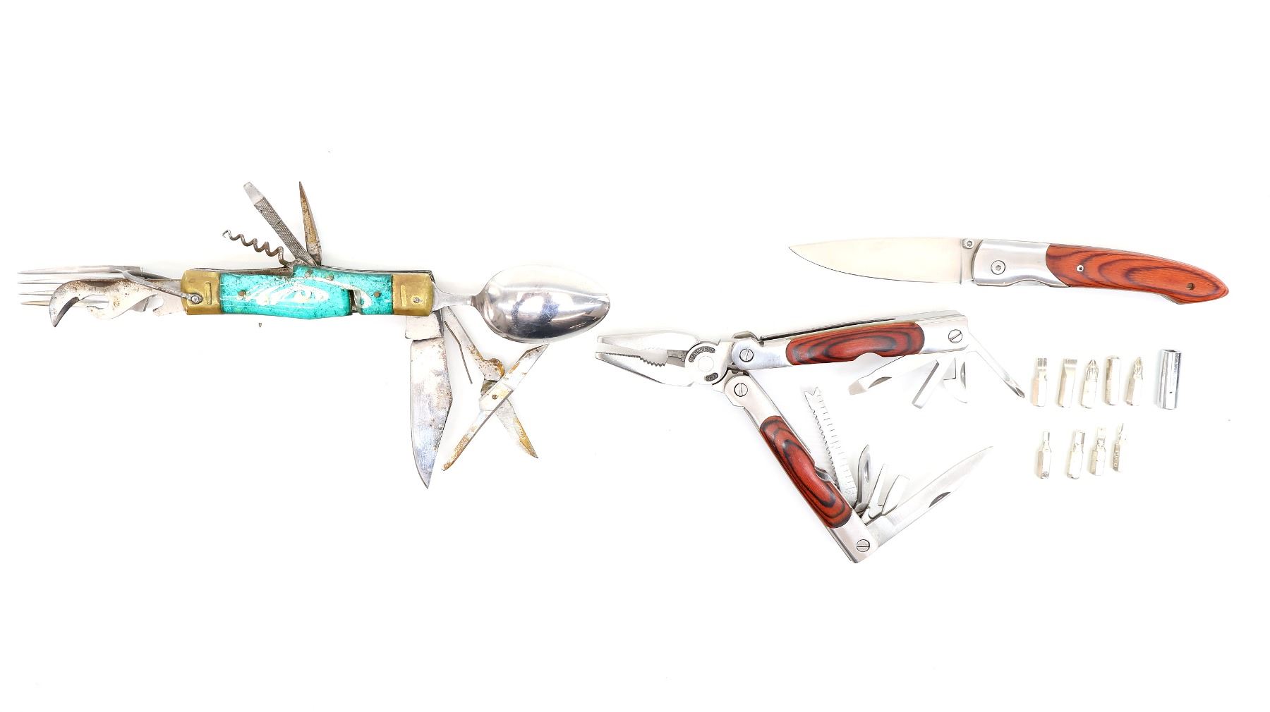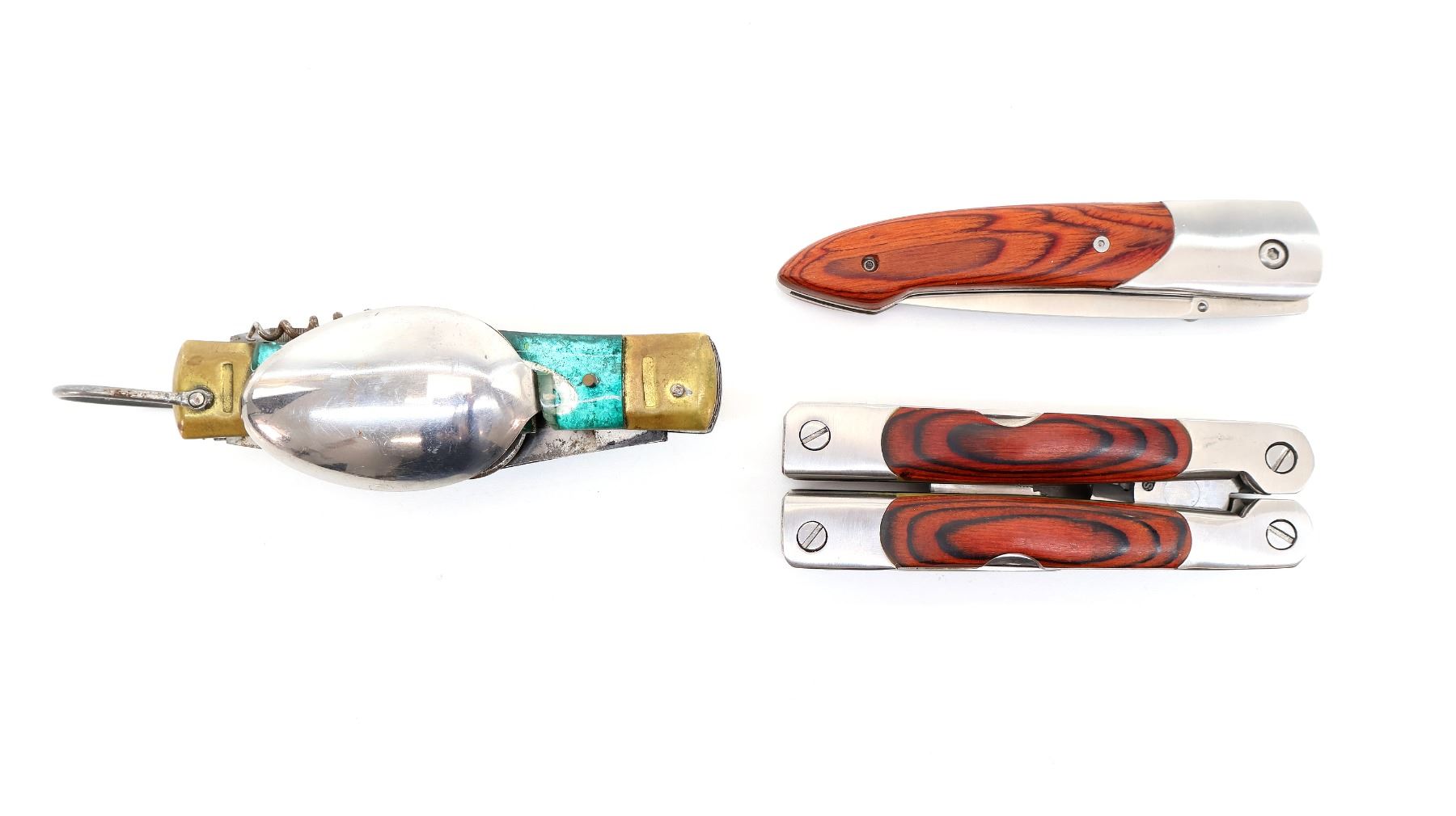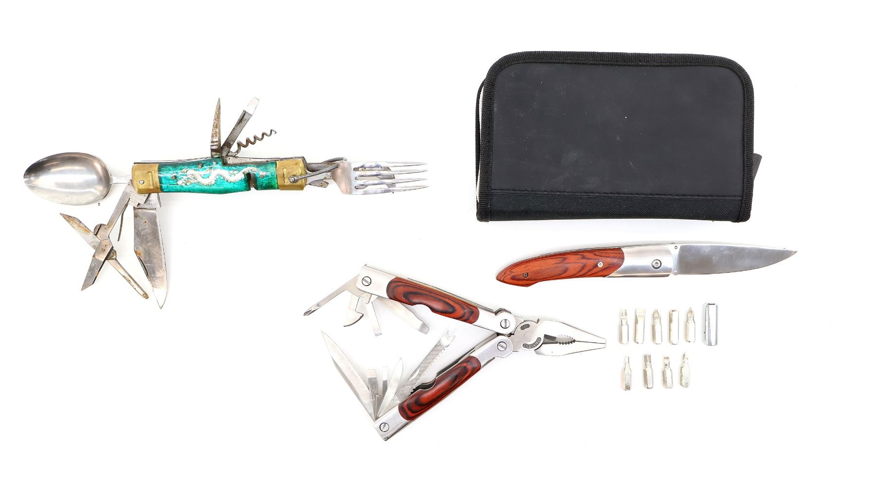 LOT INCLUDES; (1) UNKNOWN MULTI-TOOL, INCLUDES; SPOON, FORK, SCISSORS, STEEL BLADE, ETC., BLADE MARKED "MADE IN JAPAN", EPOXY & BRASS HANDLE, UNMARKED, BLADE OVERALL LENGTH APPROX. 3", OVERALL LENGTH APPROX. 4.75", (1) MULTI-TOOL, INCLUDES; PLIERS, SCREWDRIVER, FILE, RULER, STEEL BLADES, ETC., BLADE OVERALL LENGTH APPROX. 1.25" & 2.5", OVERALL LENGTH APPROX. 4.5" & (1) FOLDING KNIFE, STEEL BLADE, UNMARKED, LAMINATE HANDLE, UNMARKED, BLADE OVERALL LENGTH APPROX. 3.5", OVERALL LENGTH APPROX. 5", ETC. SEE PHOTOS.