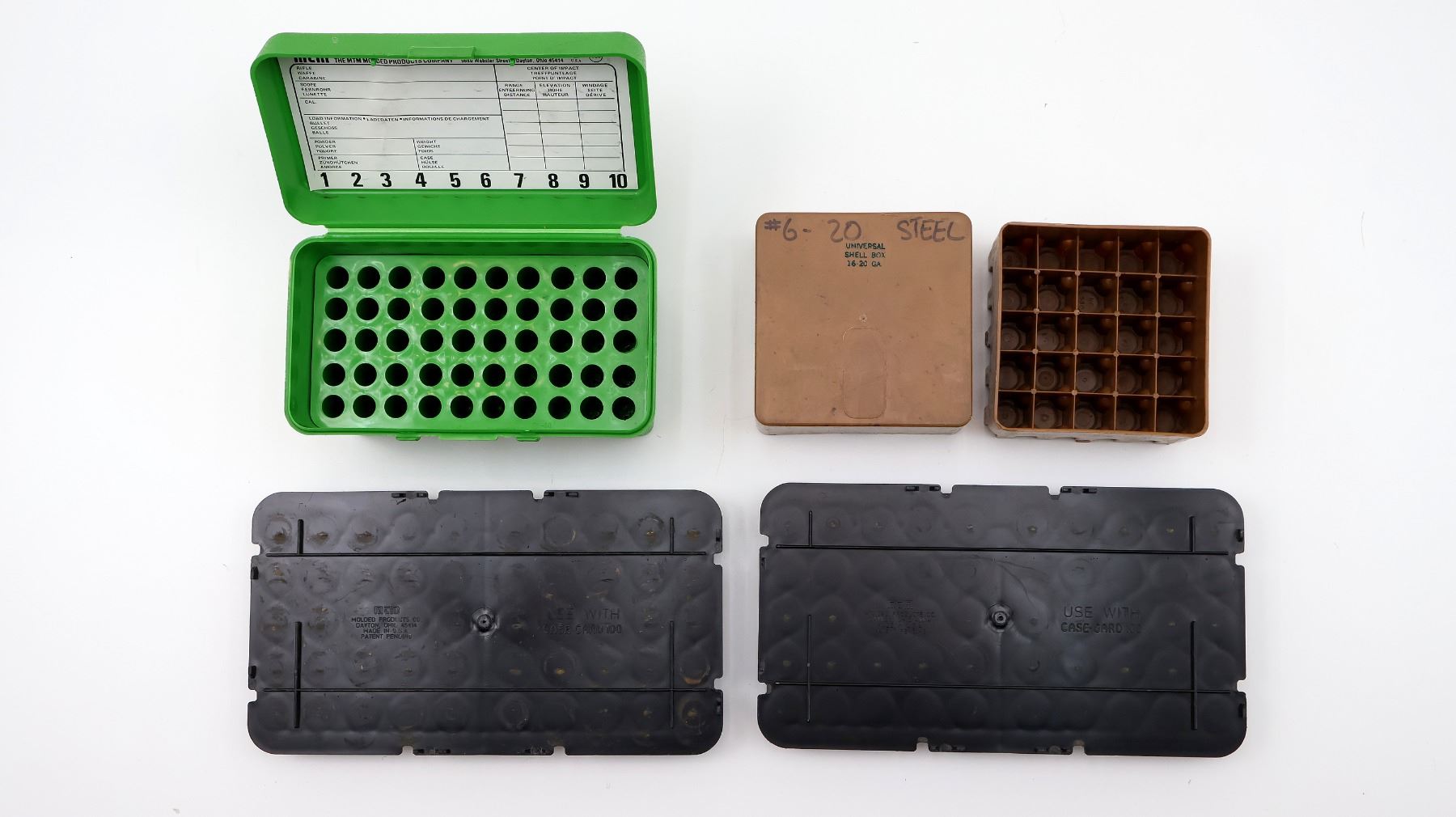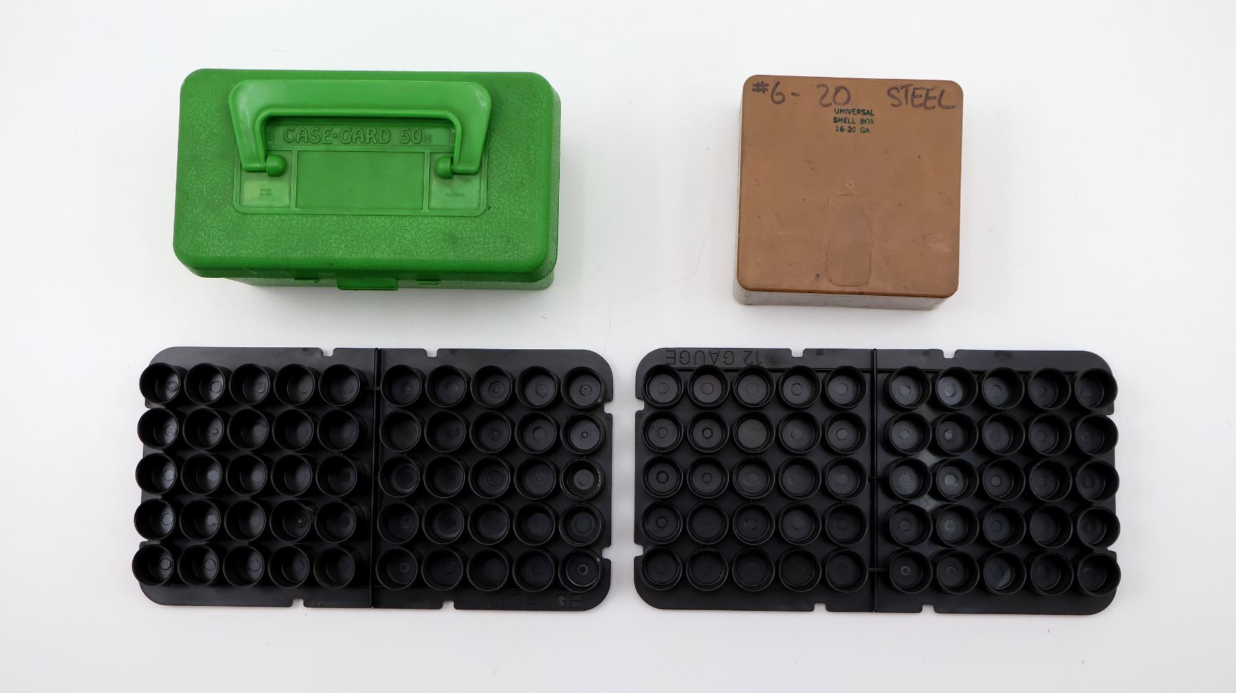 LOT INCLUDES; (1) MTM CASE GARD 50H GREEN PLASTIC RIFLE AMMO CONTAINER, HOLDS 50-RNDS, FITS VARIOUS RIFLE CALIBERS, .270 WIN, .257 ROBERTS, .30-06 SPR, ETC., (2) MTM CASE GARD 100 BLACK PLASTIC SHOT SHELL TRAYS, NO CONTAINER, FITS 12 GA. SHELLS, EACH TRAY HOLDS 50-RNDS & (1) UNIVERSAL SHELL BOX, FITS 16-20 GA. SHELLS, BROWN PLASTIC, HOLDS 25-RNDS. SEE PHOTOS.