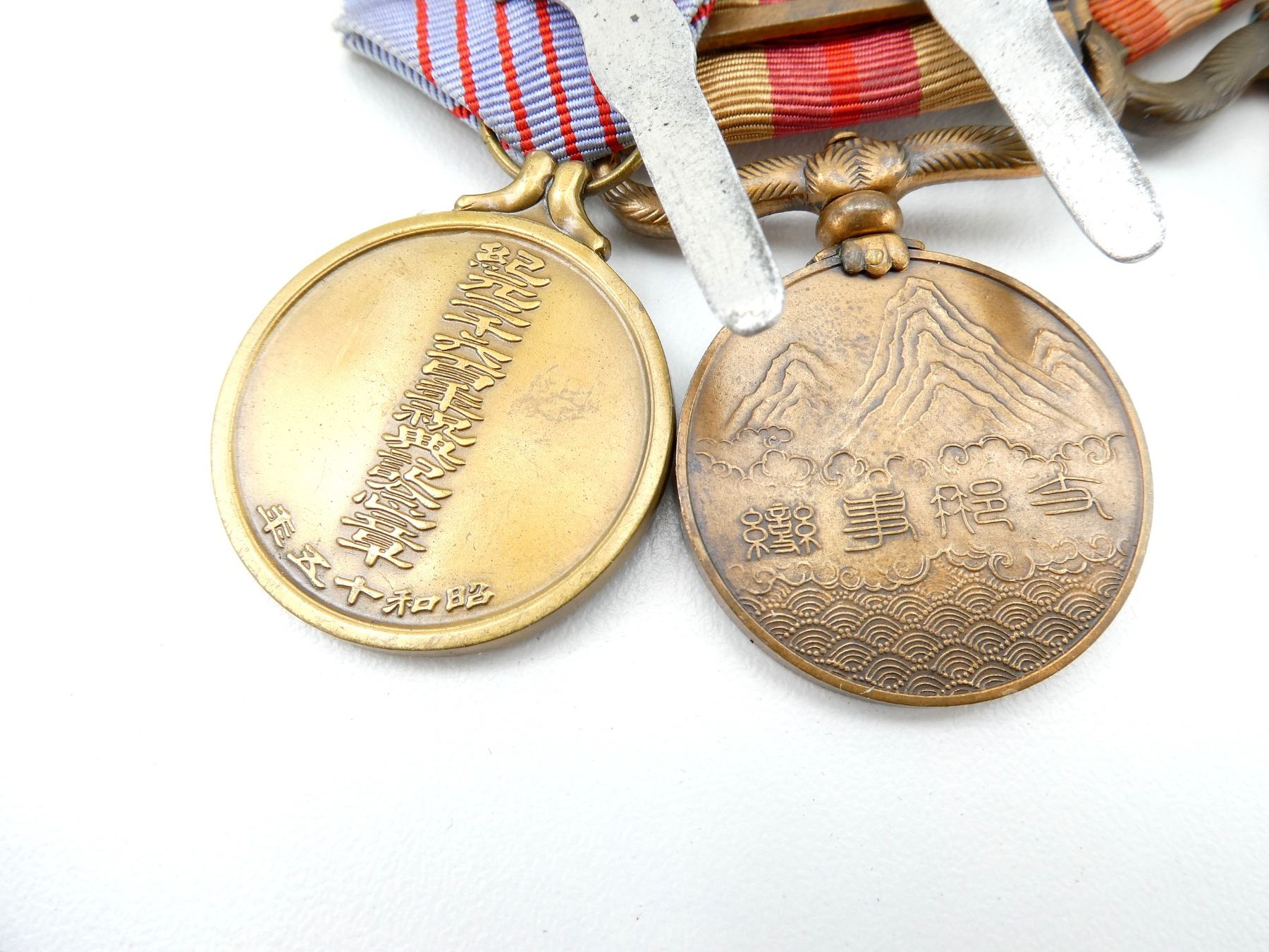 ALL AFFIXED TO MEDAL BAR, LOT INCLUDES; (1) MANCHUKUO NATIONAL FOUNDATION MERIT MEDAL WITH RIBBON, INSTITUTED IN 1933, BLACKENED BRONZE, (1) 1931-1934 MANCHURIAN INCIDENT COMMEMORATIVE MEDAL WITH RIBBON, (1) 1937-1945 CHINA INCIDENT WAR MEDAL WITH RIBBON, (1) 2600TH NATIONAL ANNIVERSARY COMMEMORATIVE MEDAL WITH RIBBON, AWARDED TO MILITARY PERSONNEL / CIVILIANS WHO PARTICIPATED IN THE CELEBRATIONS HELD IN 1940 & (1) WOODEN BOX FOR MEDALS WITH VARIOUS JAPANESE CHARACTERS ON THE LID / SIDE OF BOX, APPROX. 5.25" X 4" X 1 5/8". SEE PHOTOS.