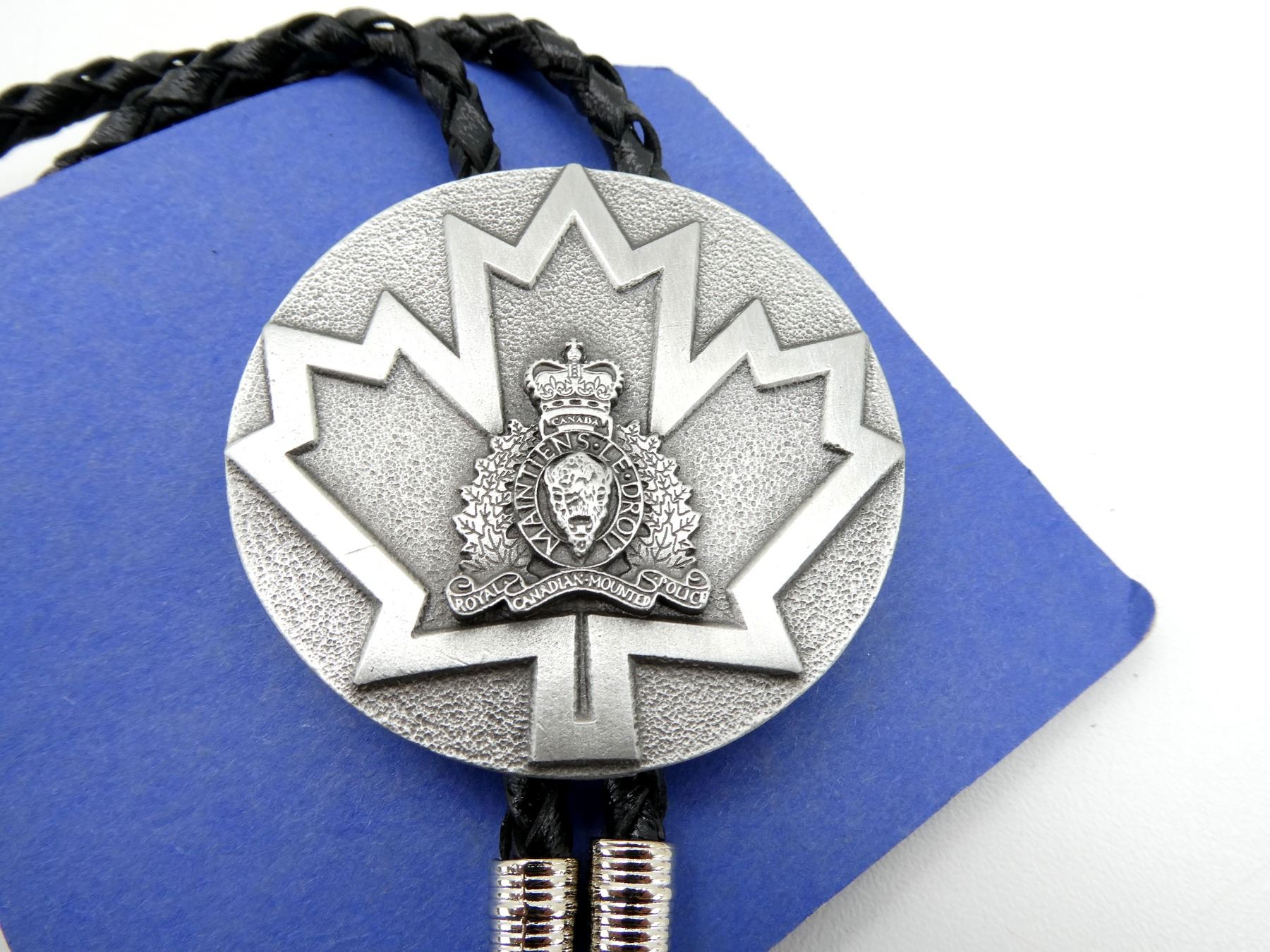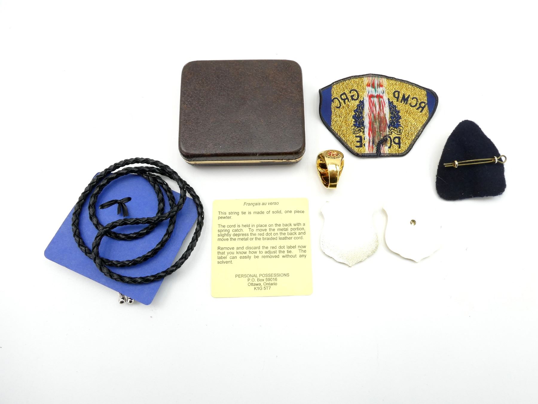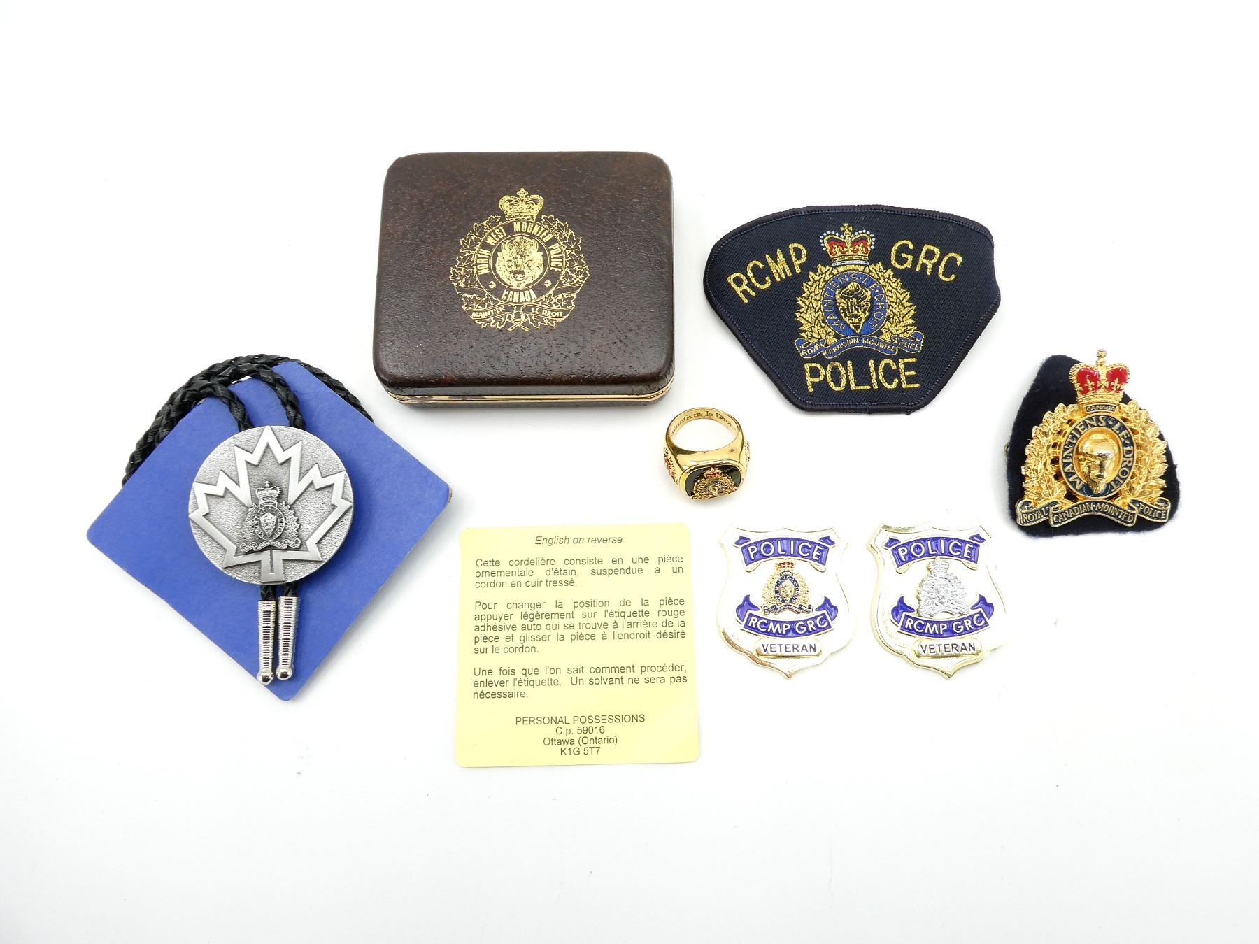 LOT INCLUDES; (1) RCMP BOLLO TIE, BRAIDED LEATHER ADJUSTABLE CORD, PEWTER METAL PORTION WITH RCMP CREST IN CENTER OF A MAPLE LEAF, COMES WITH INSTRUCTIONS, (2) RCMP VETERAN WALLET BADGES, MARKED: "POLICE, RCMP GRC, VETERAN" WITH RCMP CREST IN CENTER, ENAMELED FRONT WORN OFF CREST OF ONE BADGE, (1) RCMP POLICE CLOTH BADGE, (1) RCMP METAL CAP BADGE WITH ENAMELING, WOOL BACKING, PIN INTACT, (1) RCMP GOLD COLOURED RING WITH RCMP CREST, MARKED: "ROYAL CANADIAN MOUNTED POLICE", "MAINTIENS LE DROIT", ETC. & (1) BROWN LEATHER CASE, MARKED: "NORTH WEST MOUNTED POLICE, CANADA" IN GOLD COLOURED WRITING WITH QUEEN'S CROWN, APPROX. 3 7/8" X 3.25" X 1". SEE PHOTOS.