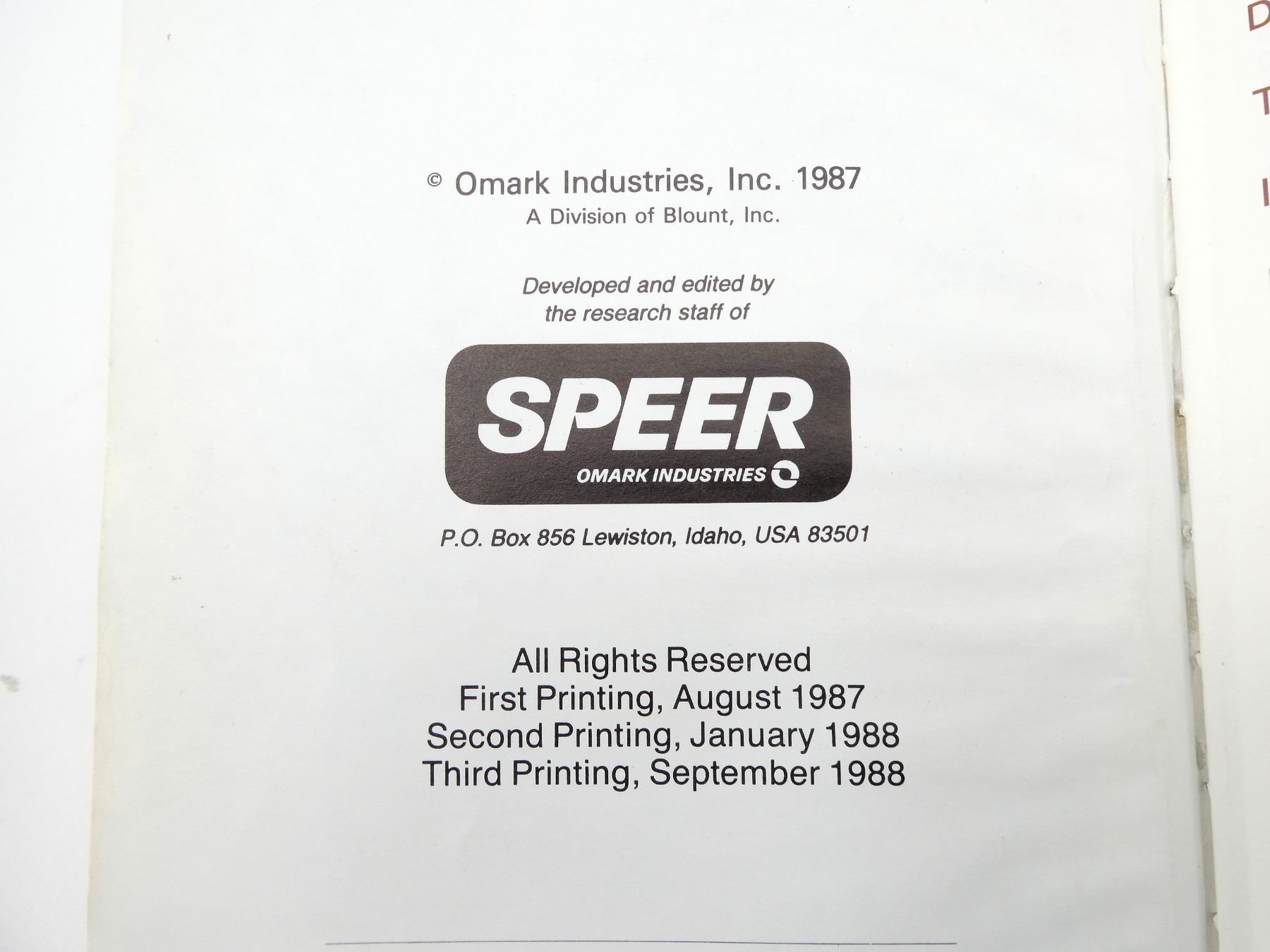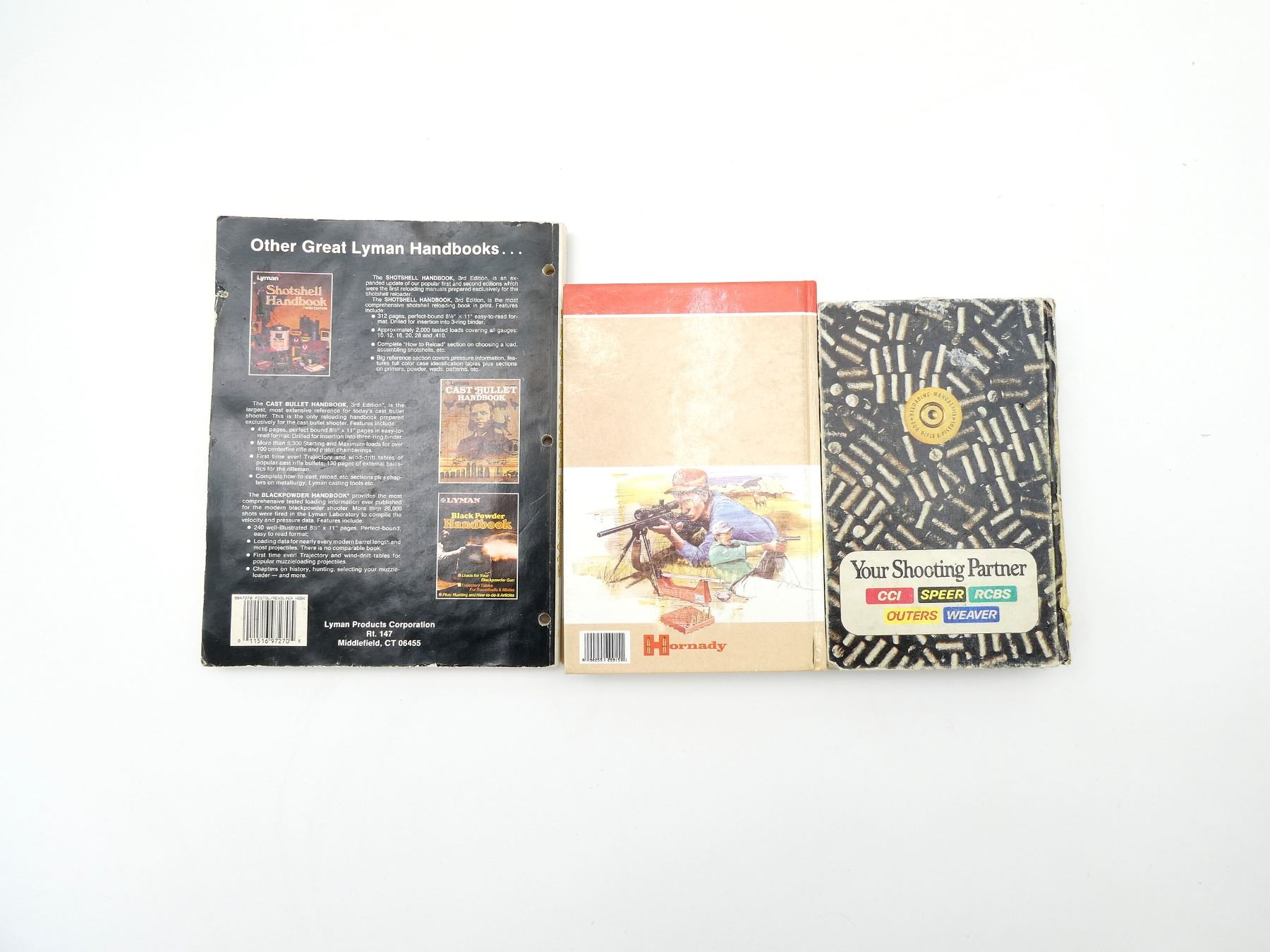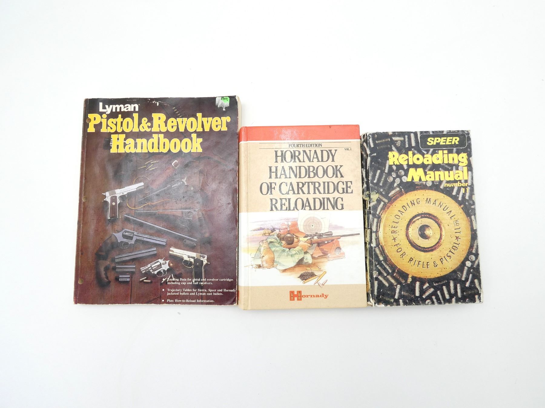 LOT INCLUDES; (1) "HORNADY HANDBOOK OF CARTRIDGE RELOADING, FOURTH EDITION" BOOK, HARD COVER, SECOND PRINT, COPYRIGHT 1991, (1) "SPEER RELOADING MANUAL, NUMBER 11" BOOK, HARD COVER, THIRD PRINT, COPYRIGHT 1988 & (1) "LYMAN PISTOL & REVOLVER HANDBOOK", SOFT COVER, ISBN: 0-912412-12-7. SEE PHOTOS.