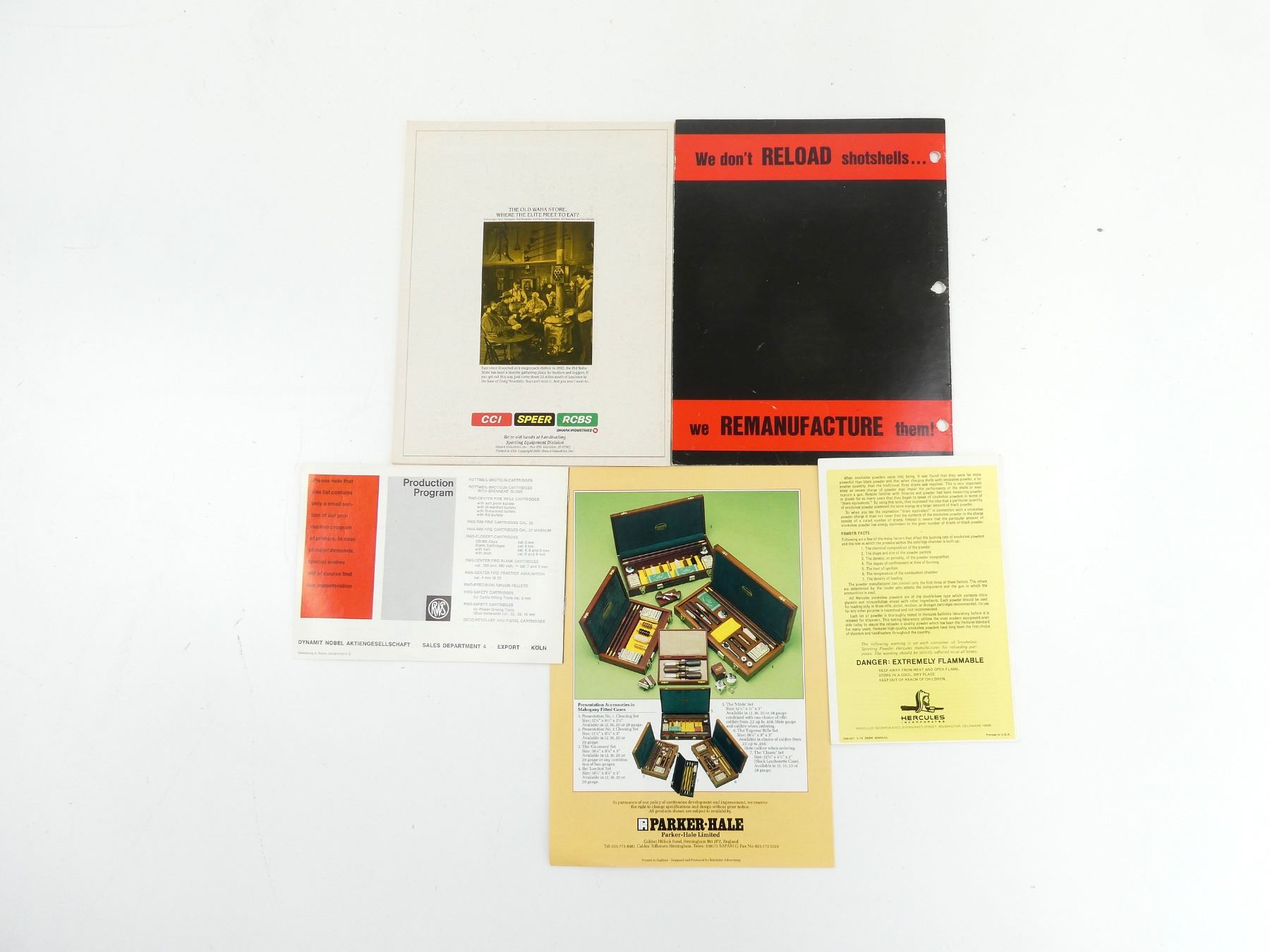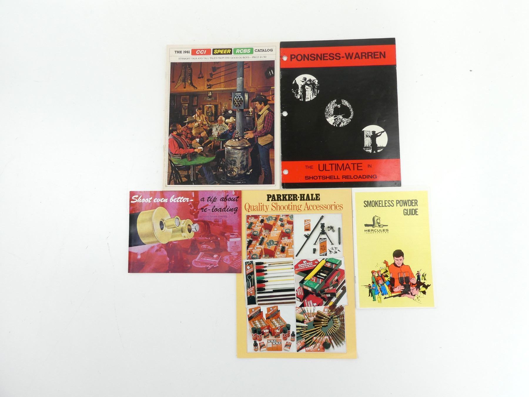 LOT INCLUDES; (1) "SHOOT EVEN BETTER - A TIP ABOUT RE-LOADING", BY CANADIAN SAUER LIMITED, SOFT COVER, (1) "SMOKELESS POWDER GUIDE", BY HERCULES INCORPORATED, SOFT COVER, DATED 1975, (1) "THE 1981 CCI SPEER RCBS CATALOG", SOFT COVER, (1) "THE ULTIMATE IN SHOTSHELL RELOADING", BY PONSNESS-WARREN INC., SOFT COVER & (1) "QUALITY SHOOTING ACCESSORIES" BY PARKER-HALE LIMITED, SOFT COVER. SEE PHOTOS.