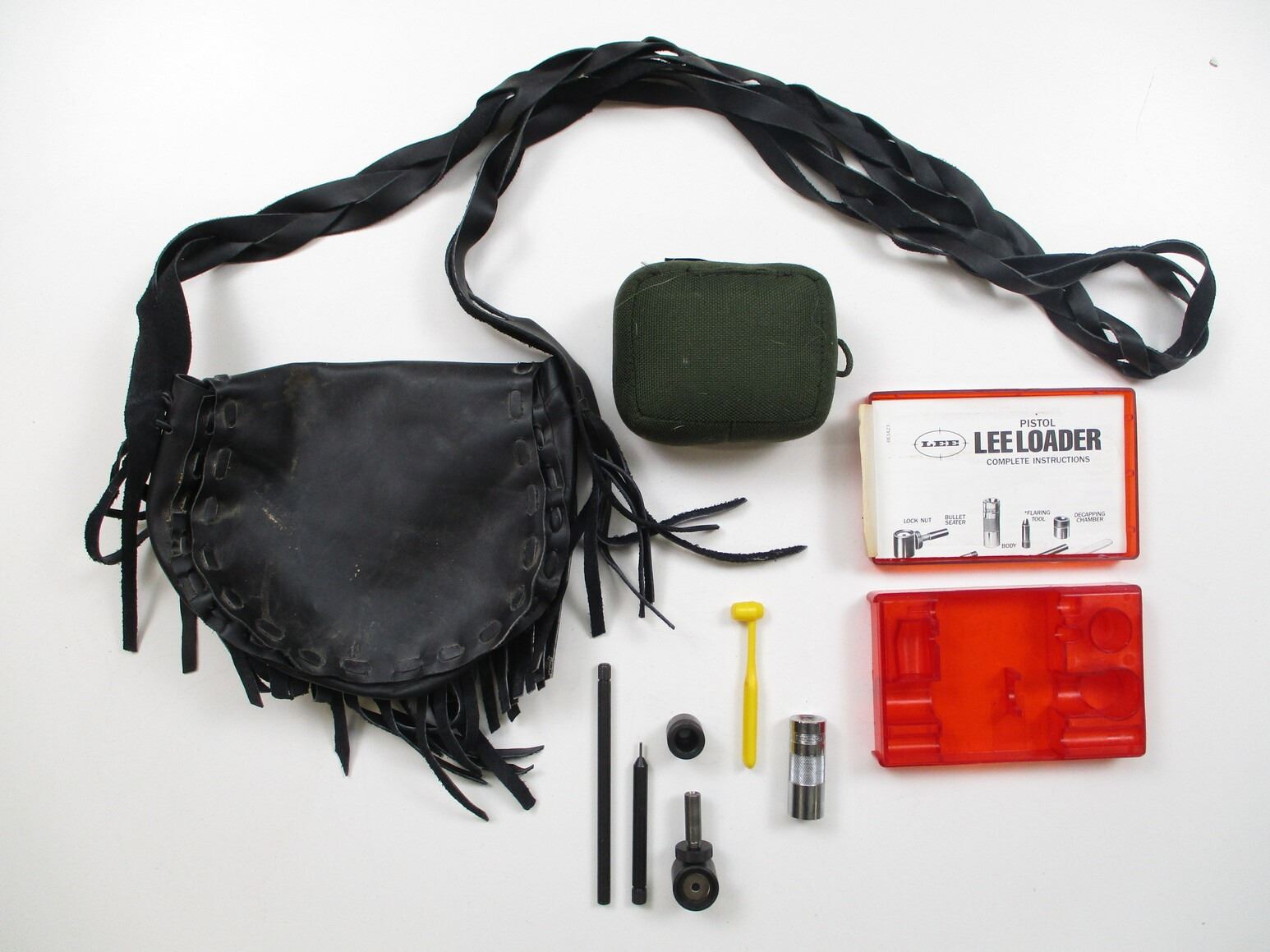 ASSORTED RELOADING LOT, LOT INCLUDES; (1) LEE LOADER KIT .357 MAG (MAY NOT BE COMPLETE), (1) BLACK LEATHER POSSIBLES BAG & (1) DOG-GONE-GOOD ODG RIFLE REST. SEE PHOTOS.