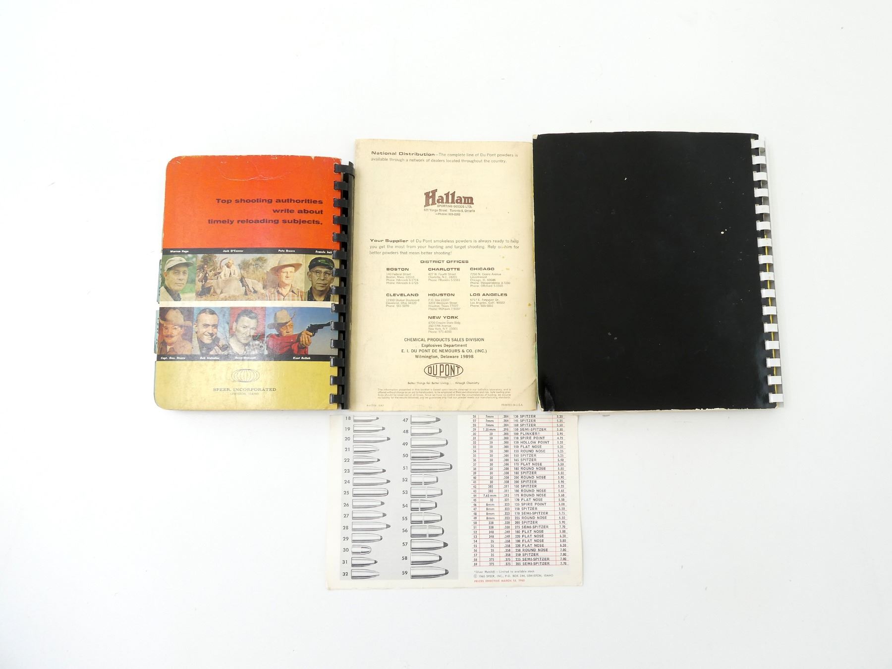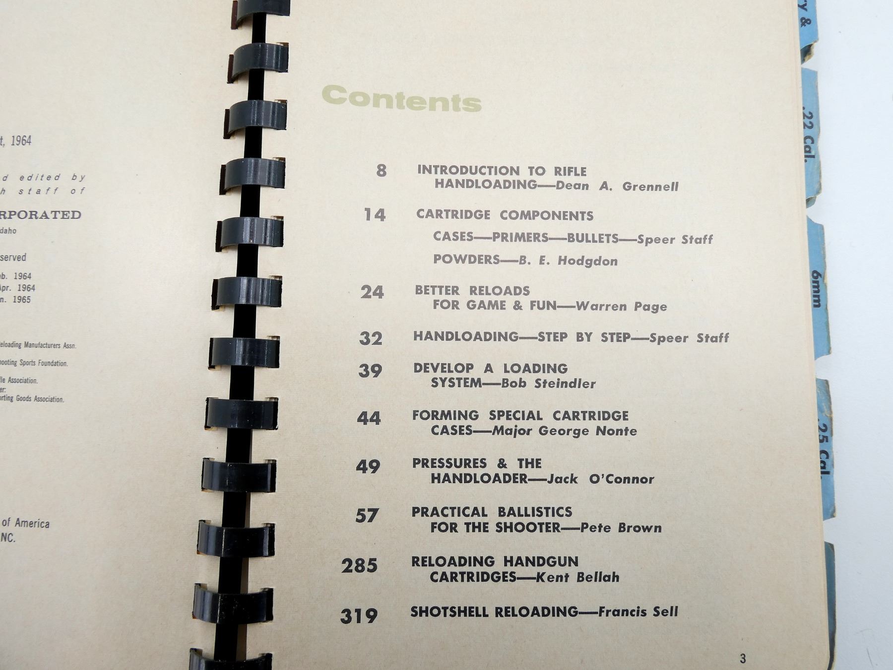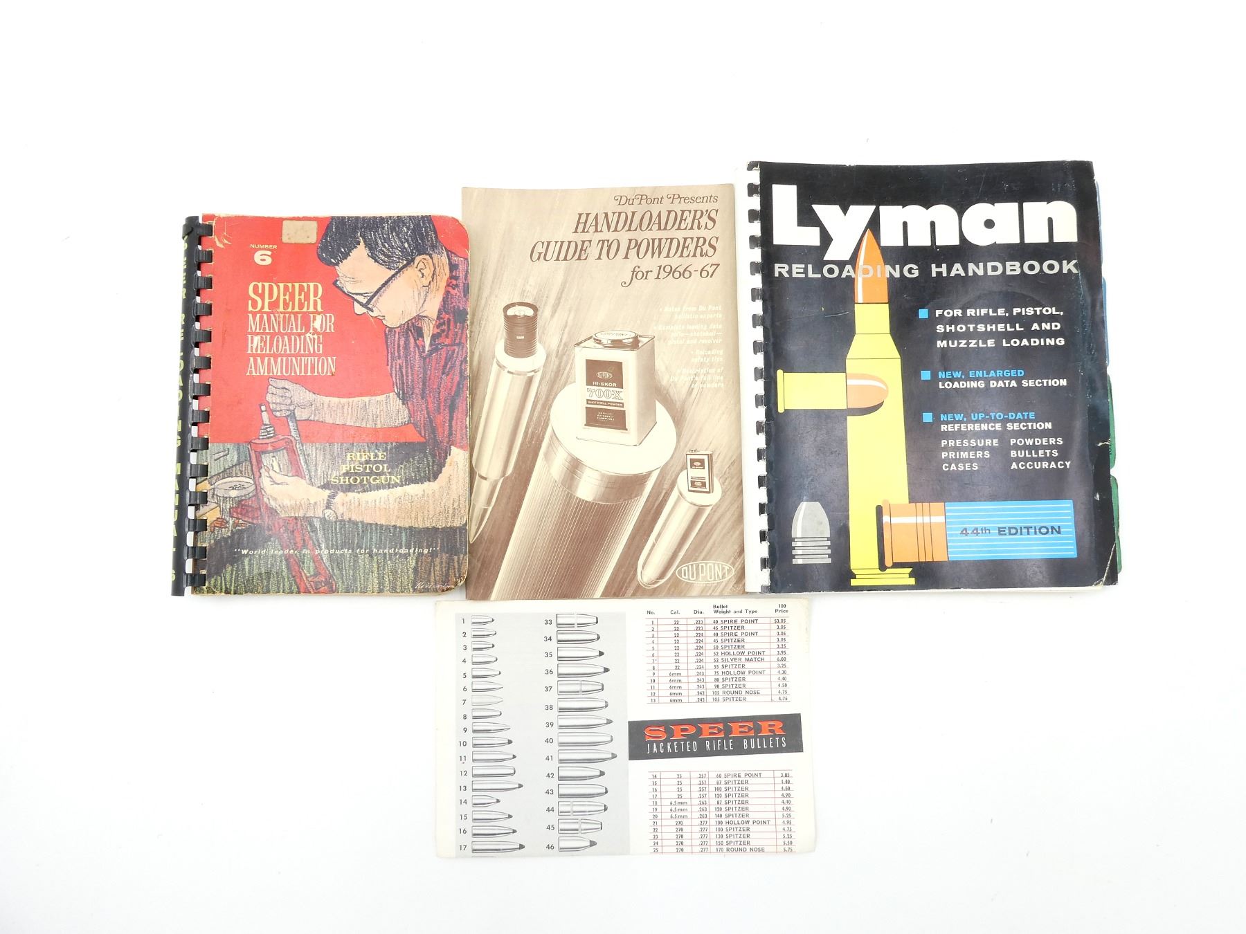 LOT INCLUDES; (1) "SPEER MANUAL FOR RELOADING AMMUNITION, NUMBER 6" BOOK, SPIRAL BOUND SOFT COVER, COPYRIGHT 1965, (1) "LYMAN RELOADING HANDBOOK, 44TH EDITION" BOOK, SPIRAL BOUND SOFT COVER, COPYRIGHT 1967, ETC. SEE PHOTOS.