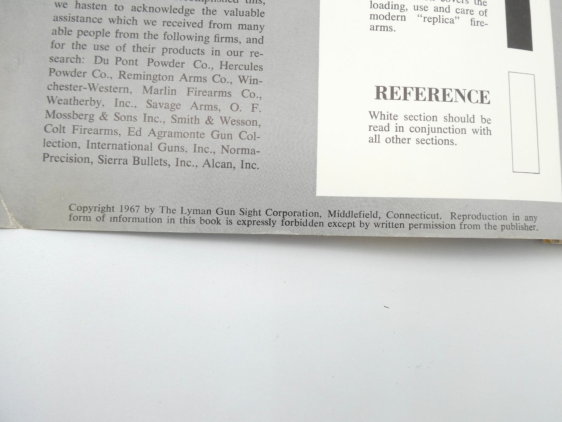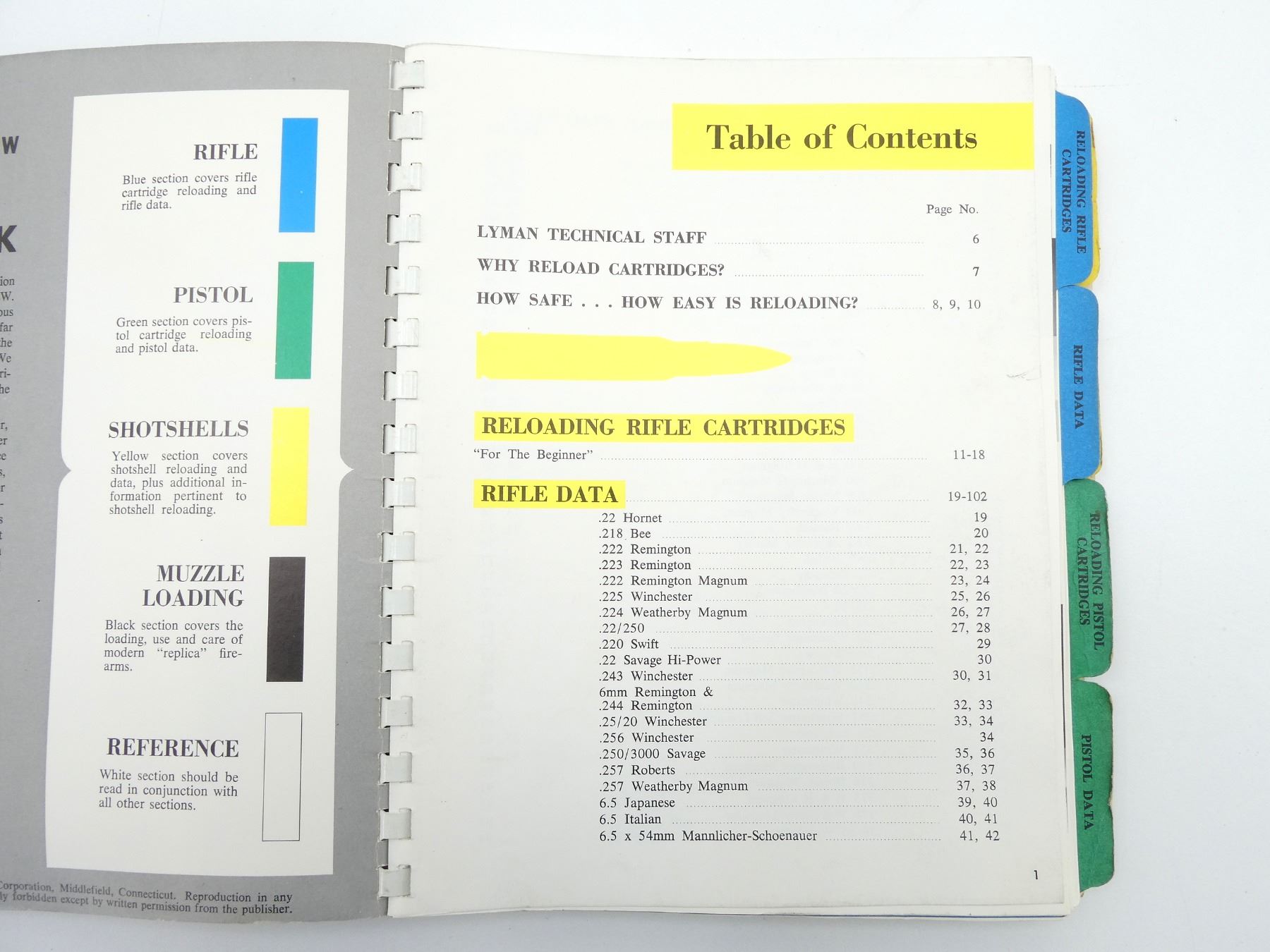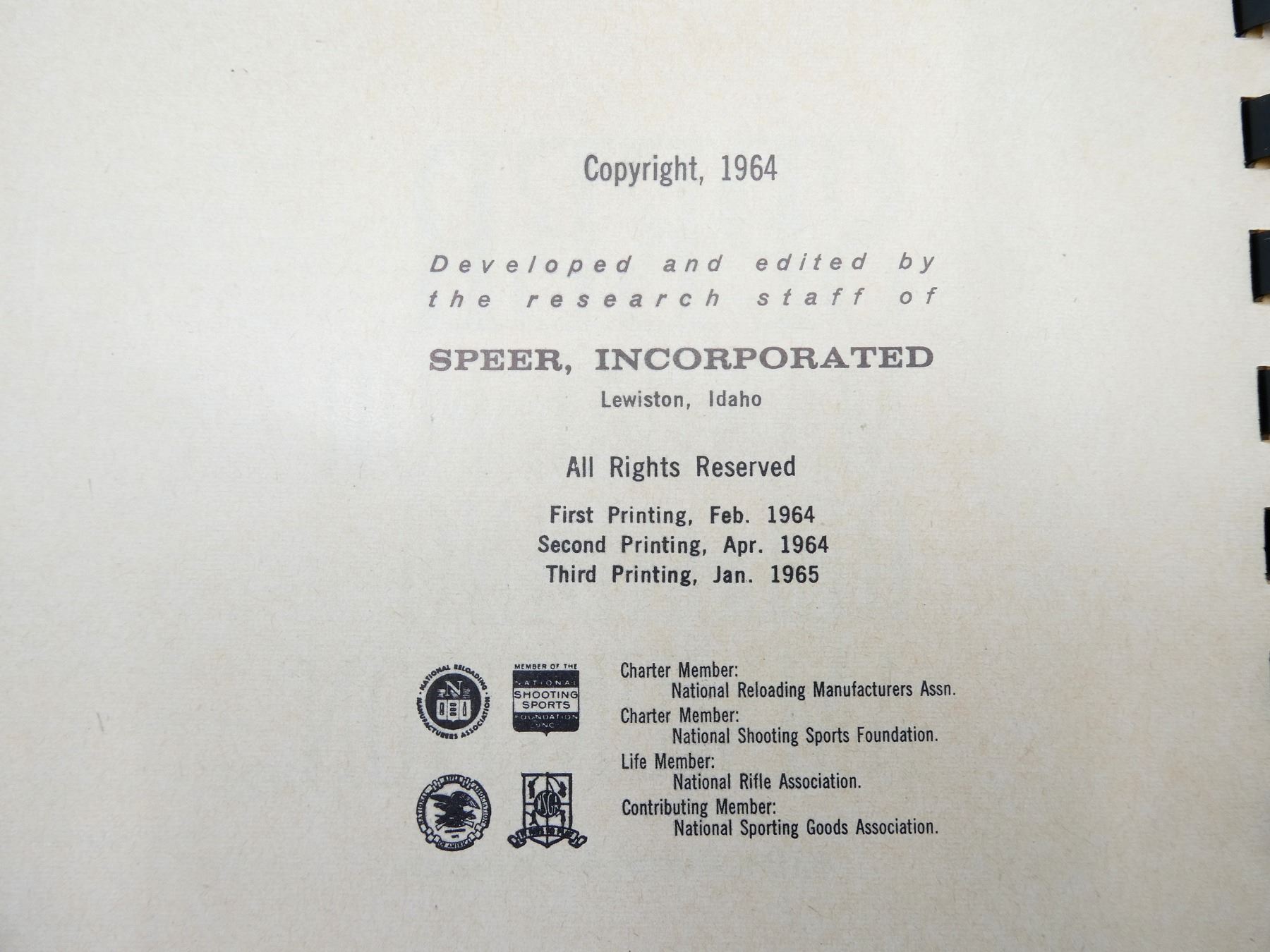LOT INCLUDES; (1) "SPEER MANUAL FOR RELOADING AMMUNITION, NUMBER 6" BOOK, SPIRAL BOUND SOFT COVER, COPYRIGHT 1965, (1) "LYMAN RELOADING HANDBOOK, 44TH EDITION" BOOK, SPIRAL BOUND SOFT COVER, COPYRIGHT 1967, ETC. SEE PHOTOS.