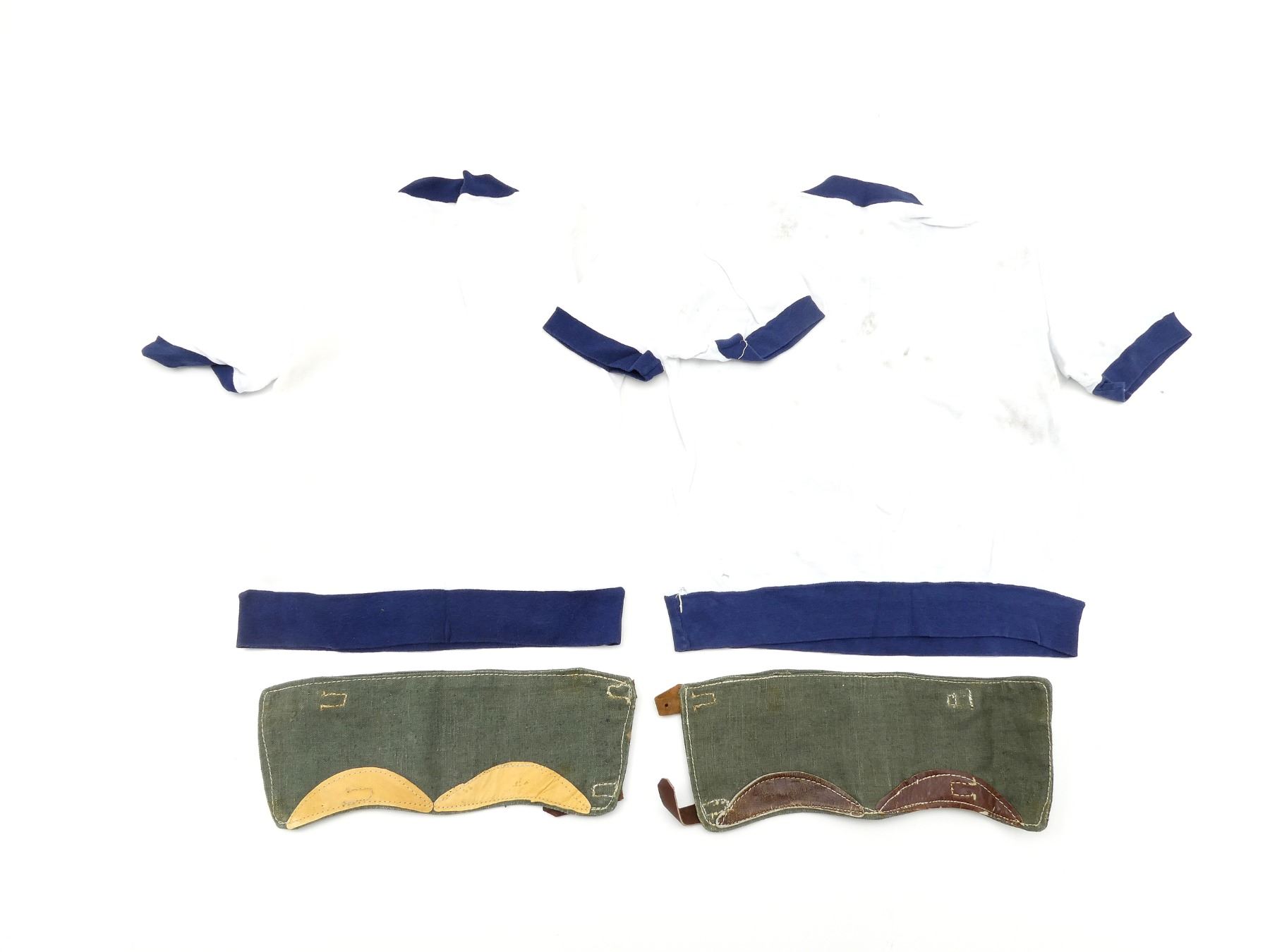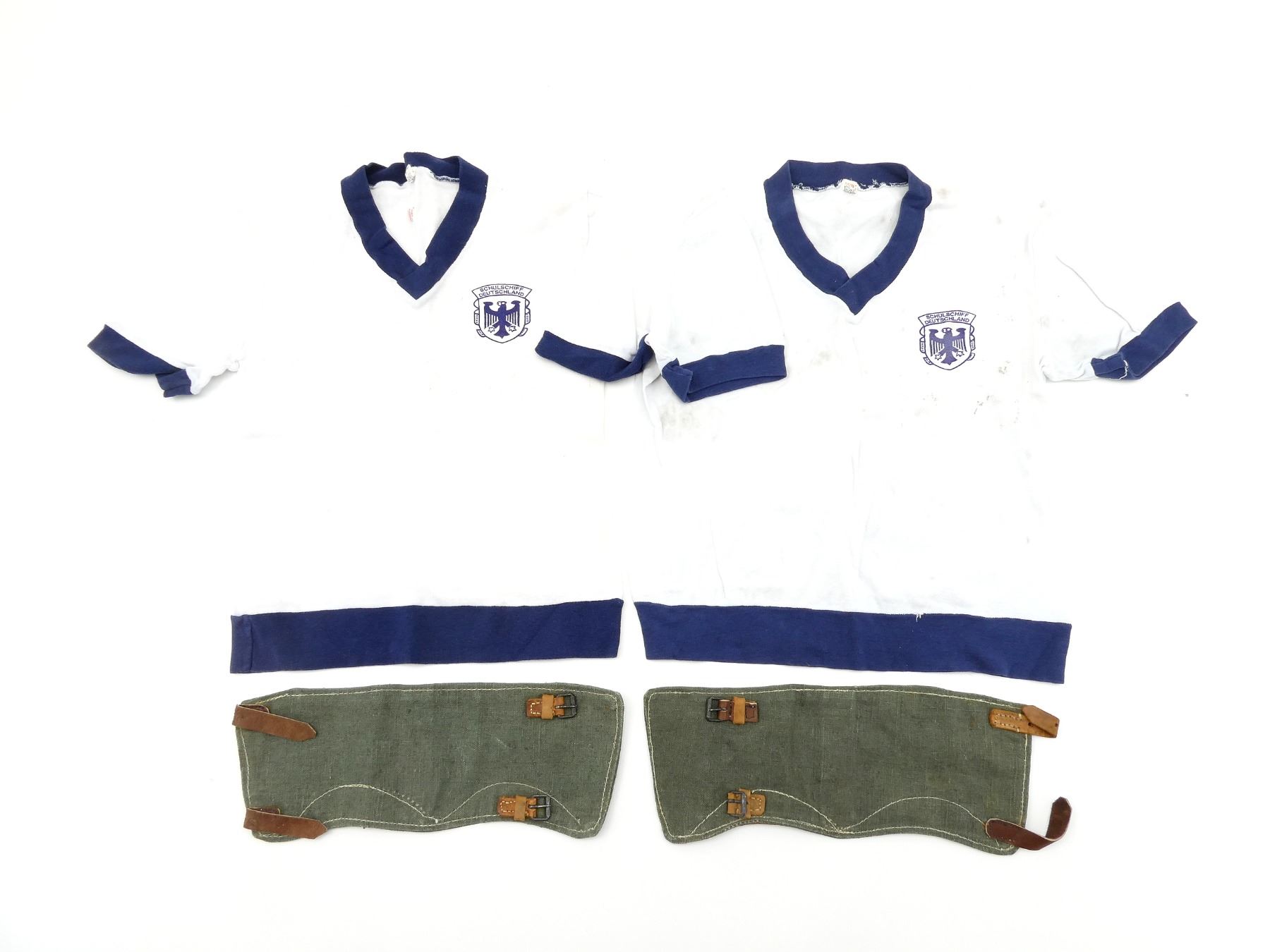 LOT INCLUDES; (2) MODERN GERMAN MILITARY SHIP TRAINING SHIRTS, 100% COTTON, SIZES 4 & 5, SHIRT MARKED: "SCHULSCHIFF DEUTSCHLAND" WITH EAGLE, SHOWS AGE / WEAR & (2) REPRODUCTION GERMAN MILITARY MIS-MATCHED GAITERS, NO VISIBLE MARKINGS, SOME THREADING GLOWS UNDER BLACK LIGHT, GREEN CANVAS WITH BROWN / TAN LEATHER ACCENTS, APPROX. 5.5" WIDE, OVERALL LENGTH APPROX. 14.5". SEE PHOTOS.