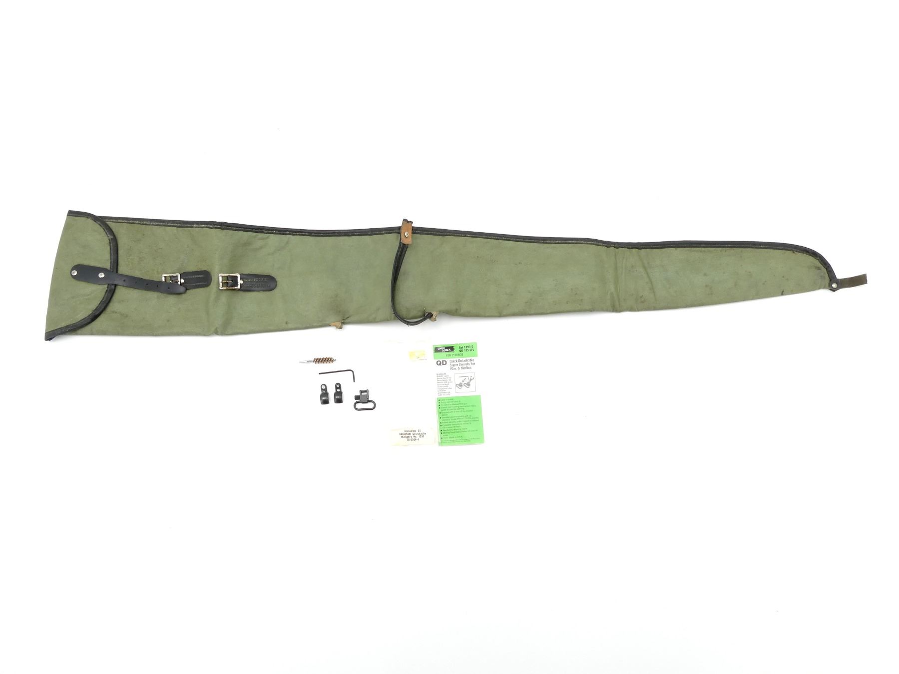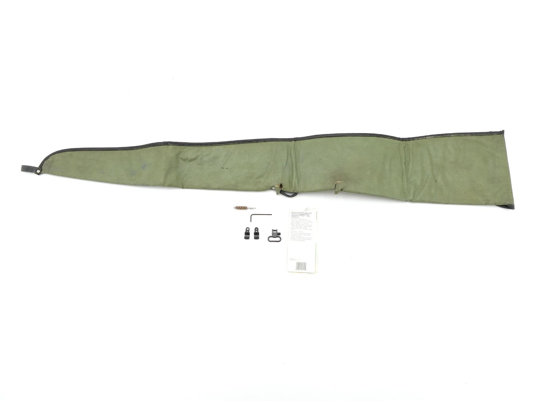 LOT INCLUDES; (1) SET OF UNCLE MIKE'S 1" QD SWIVELS, MISSING SCREWS, IN ORIGINAL PACKAGING, (1) .38 CAL. CLEANING BRUSH & (1) GREEN VINYL PADDED RIFLE CASE, BROKEN CARRY HANDLE, OVERALL LENGTH APPROX. 46", SHOWS WEAR / TEAR. MAY REQUIRE FITTING. SEE PHOTOS.