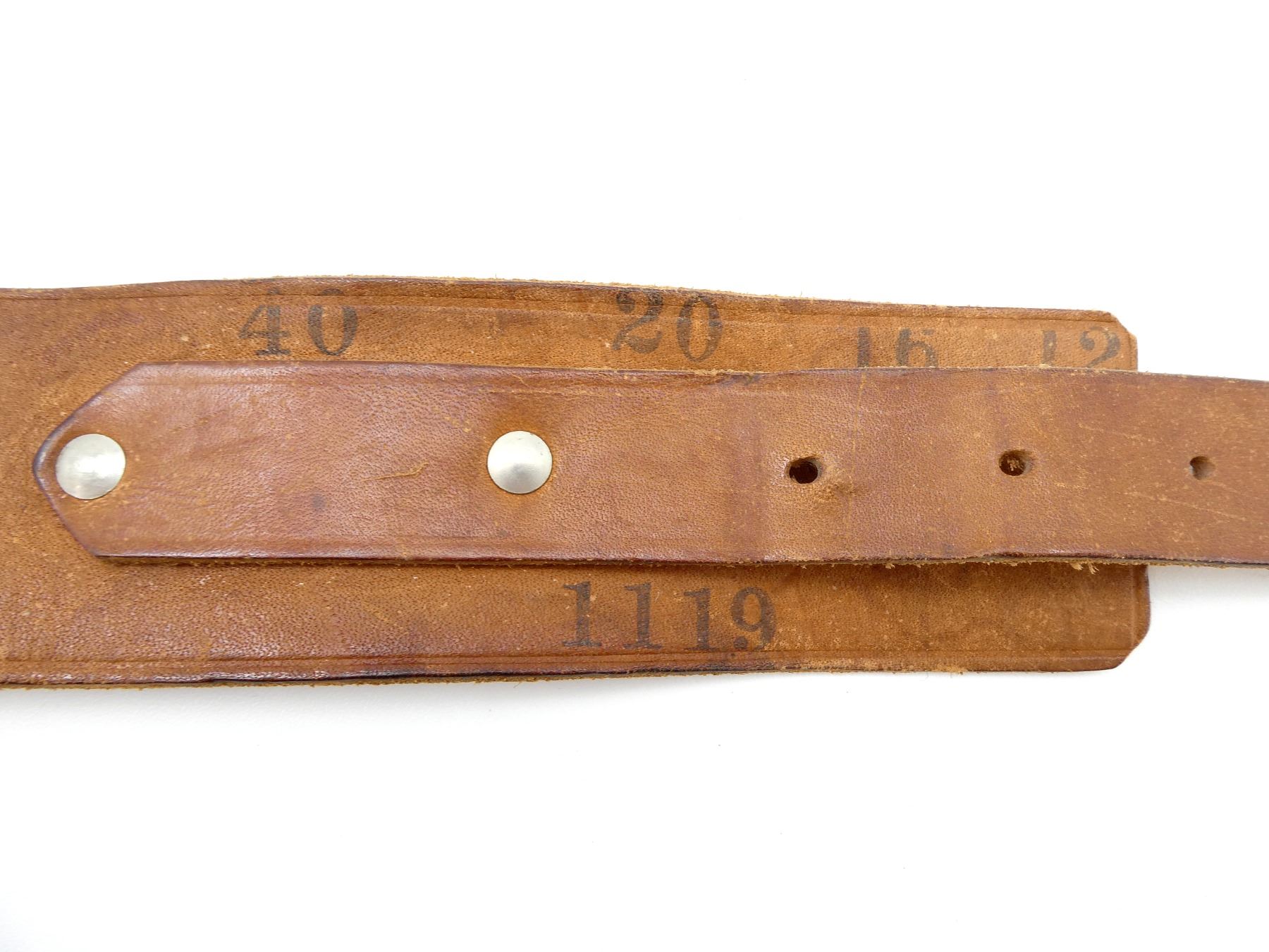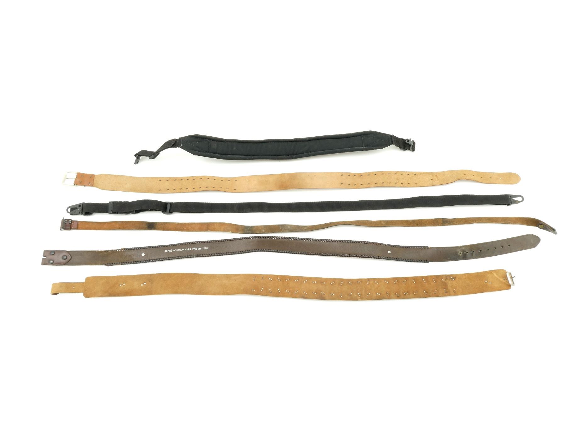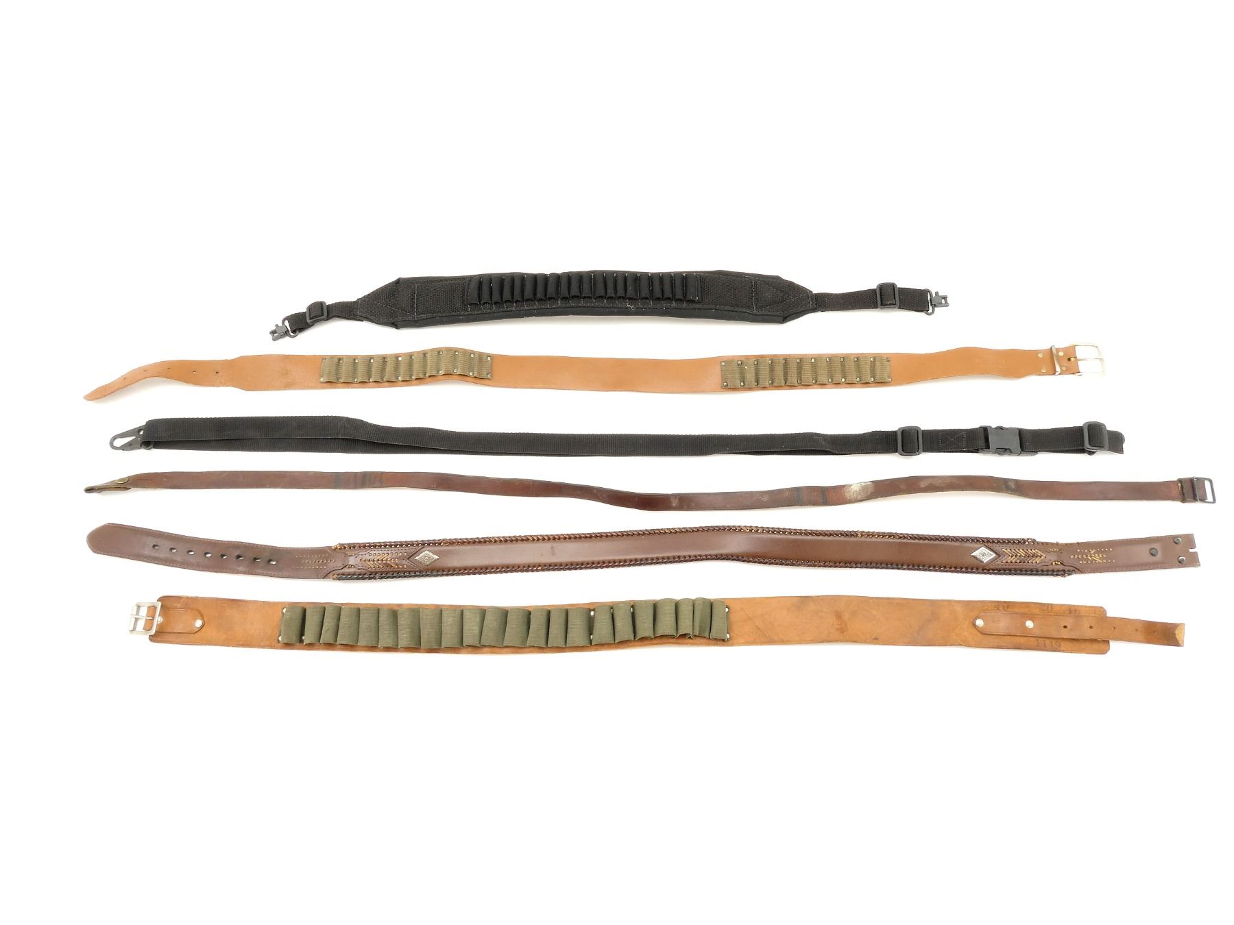 LOT INCLUDES; (1) UNKNOWN BROWN LEATHER SLING, MARKED "42/015 GENUINE LEATHER", ETC., OVERALL LENGTH APPROX. 47.5", ADJUSTABLE, (1) UNKNOWN BROWN LEATHER SLING, UNMARKED, OVERALL LENGTH APPROX. 49.5", (1) UNKNOWN BLACK NYLON AMMO SLING, UNMARKED, WITH SLING SWIVELS, FITS RIFLE CARTRIDGES, OVERALL LENGTH APPROX. 30", (1) UNKNOWN BLACK NYLON SLING, UNMARKED, OVERALL LENGTH APPROX. 42", ADJUSTABLE, (1) EDWARDS DAY BROWN LEATHER AMMO BELT, MARKED "10", "46", ETC., FITS RIFLE CARTRIDGES, OVERALL LENGTH APPROX. 47", ADJUSTABLE & (1) UNKNOWN BROWN LEATHER AMMO BELT, MARKED "40", "20", ETC., FITS SHOTGUN CARTRIDGES, OVERALL LENGTH APPROX. 44.5", ADJUSTABLE. SEE PHOTOS.