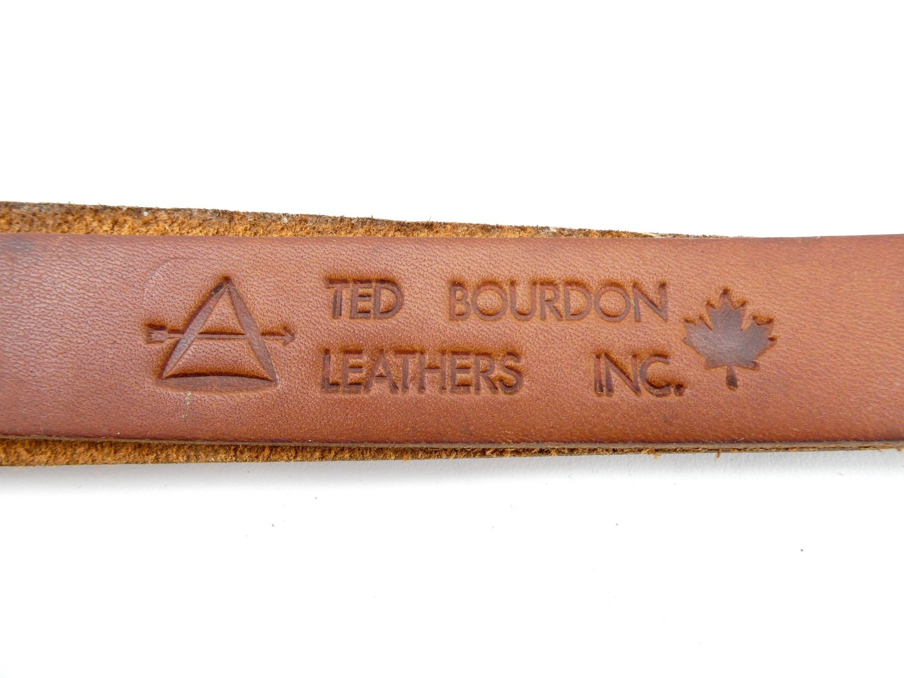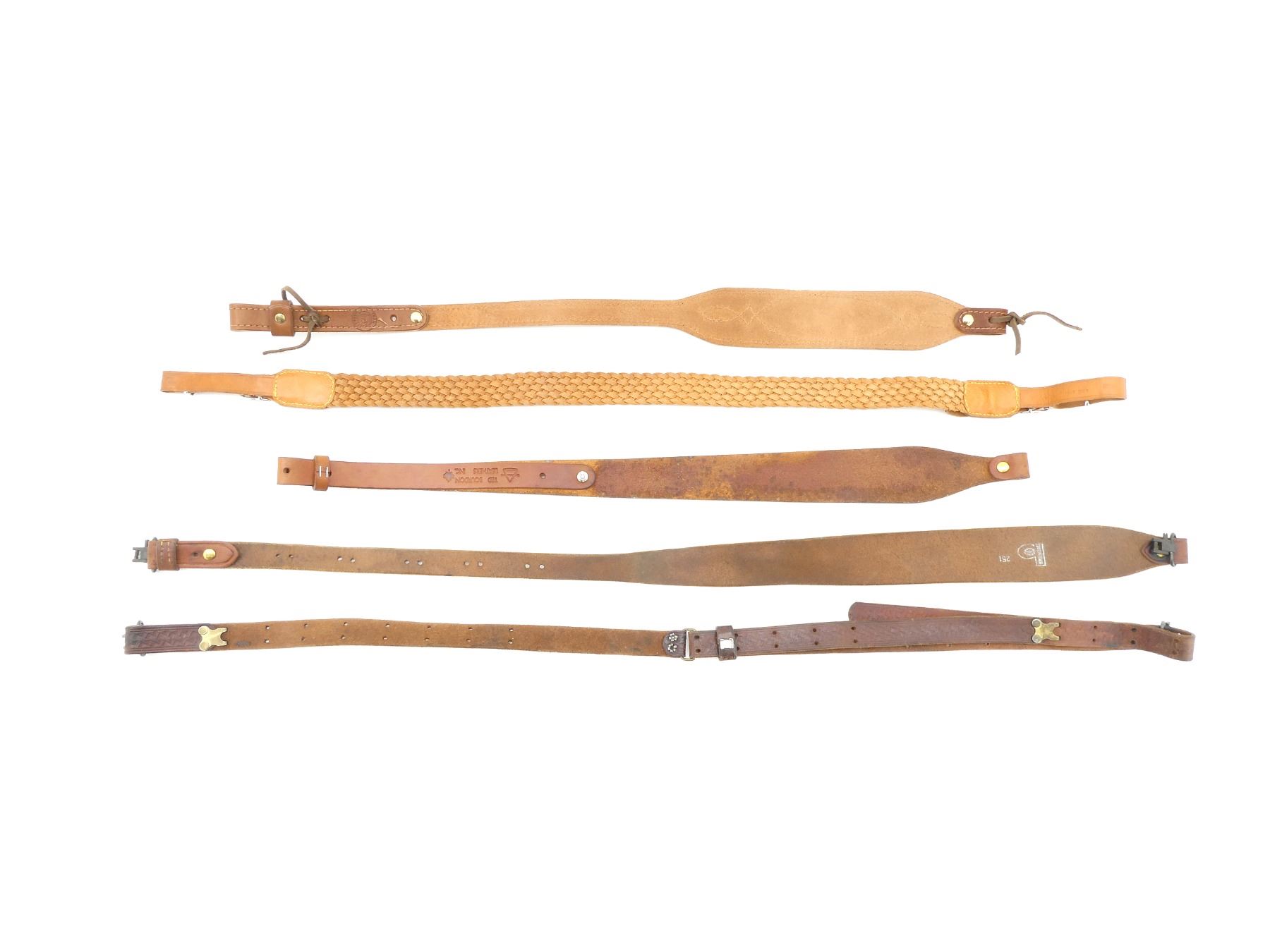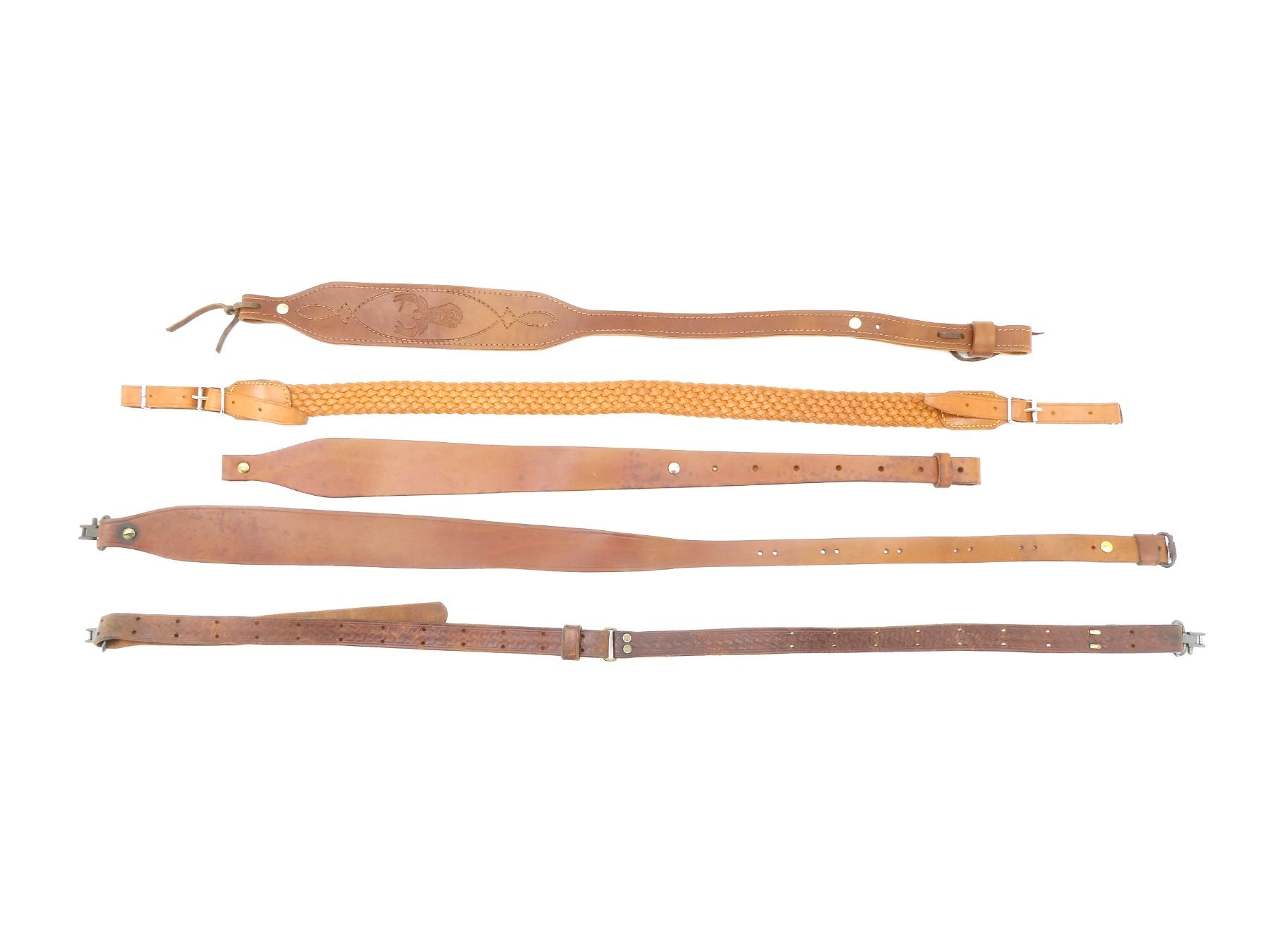 LOT INCLUDES; (1) UNKNOWN BROWN LEATHER SLING, UNMARKED, OVERALL LENGTH APPROX. 40", ADJUSTABLE, (1) UNKNOWN BROWN LEATHER SLING, UNMARKED, OVERALL LENGTH APPROX. 37.5", ADJUSTABLE, (1) TED BOURDON BROWN LEATHER SLING, MARKED WITH MANUFACTURER'S LOGO, OVERALL LENGTH APPROX. 28", (1) UNKNOWN BROWN LEATHER SLING, MARKED WITH MANUFACTURER'S LOGO, OVERALL LENGTH APPROX. 39" & (1) UNKNOWN BROWN LEATHER SLING, MARKED "TRAIL MARKER", OVERALL LENGTH APPROX. 30". SEE PHOTOS.
