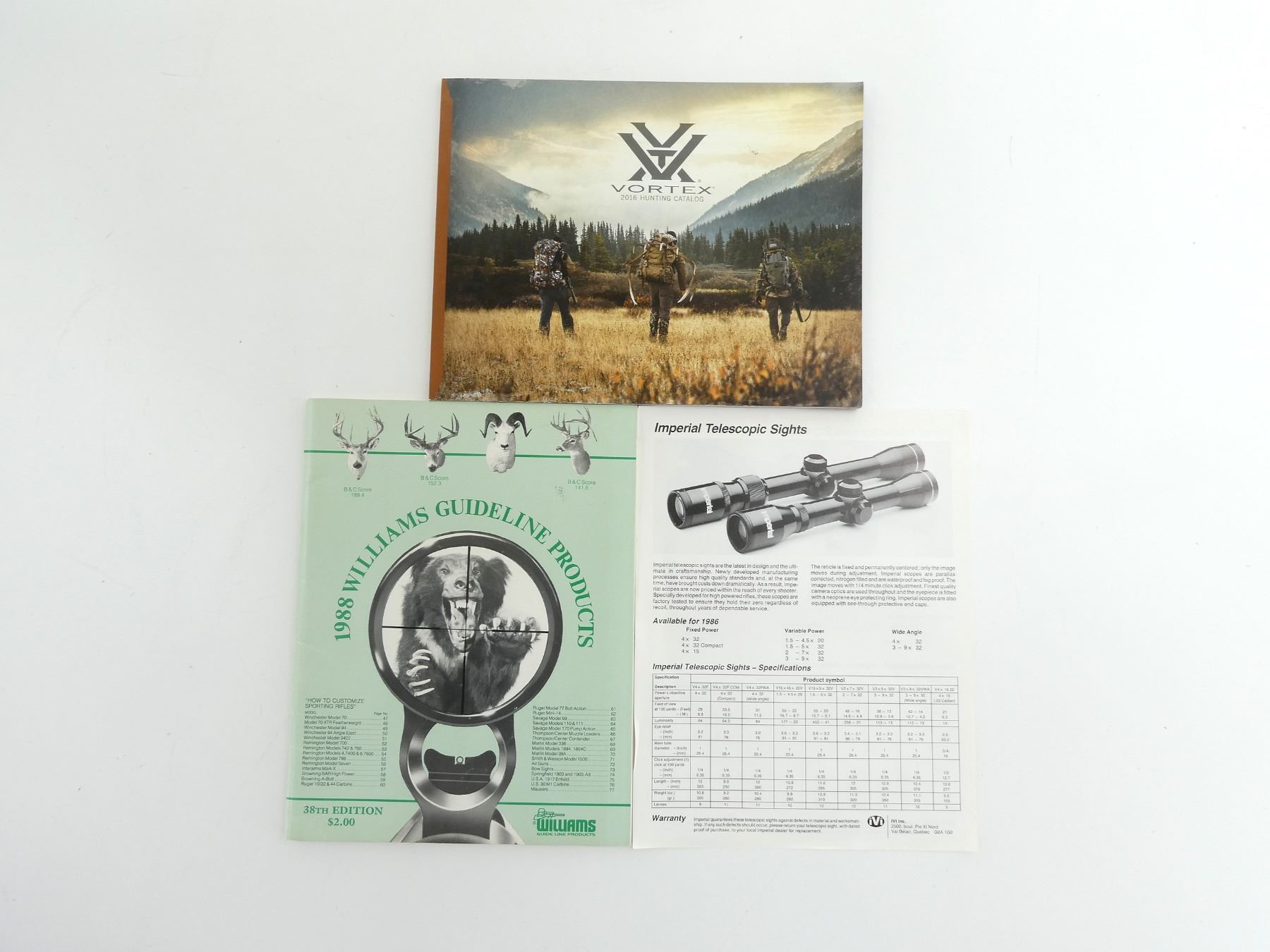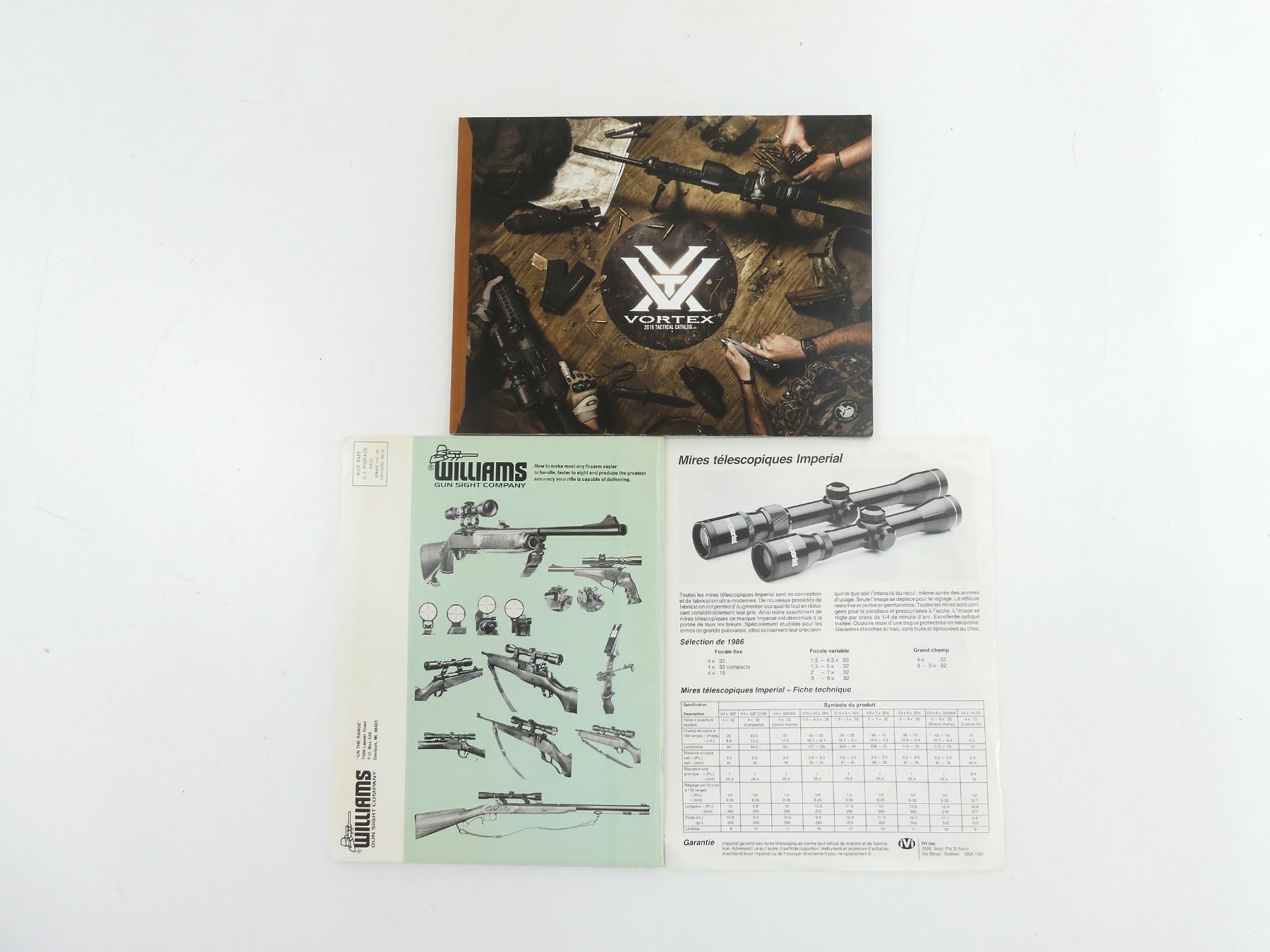 LOT INCLUDES; (1) "1988 WILLIAMS GUIDELINE PRODUCTS", SOFT COVER, (1) "VORTEX 2016 TACTICAL CATALOG", SOFT COVER & (1) "IMPERIAL TELESCOPIC SIGHTS", SINGLE PAGE. SEE PHOTOS.
