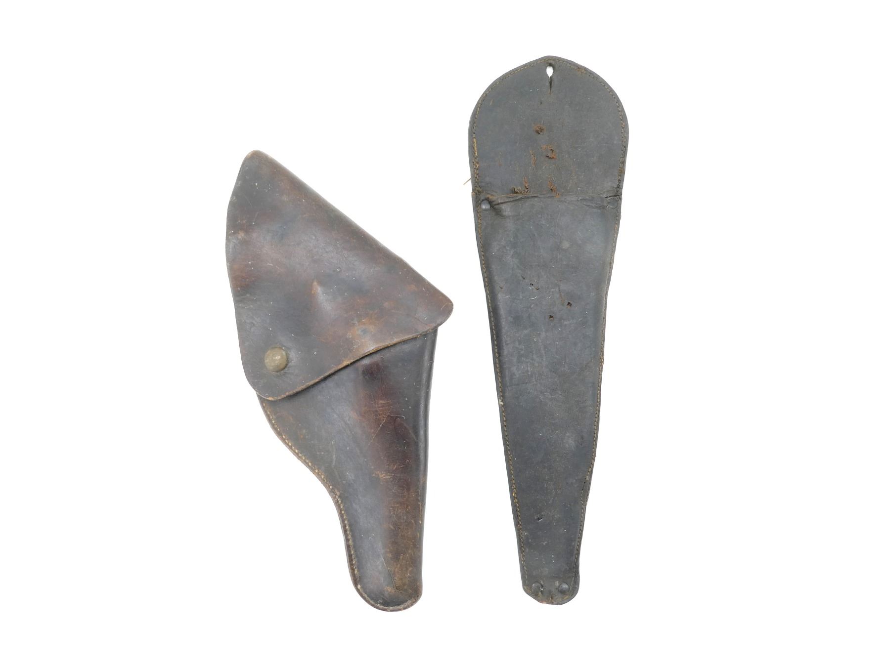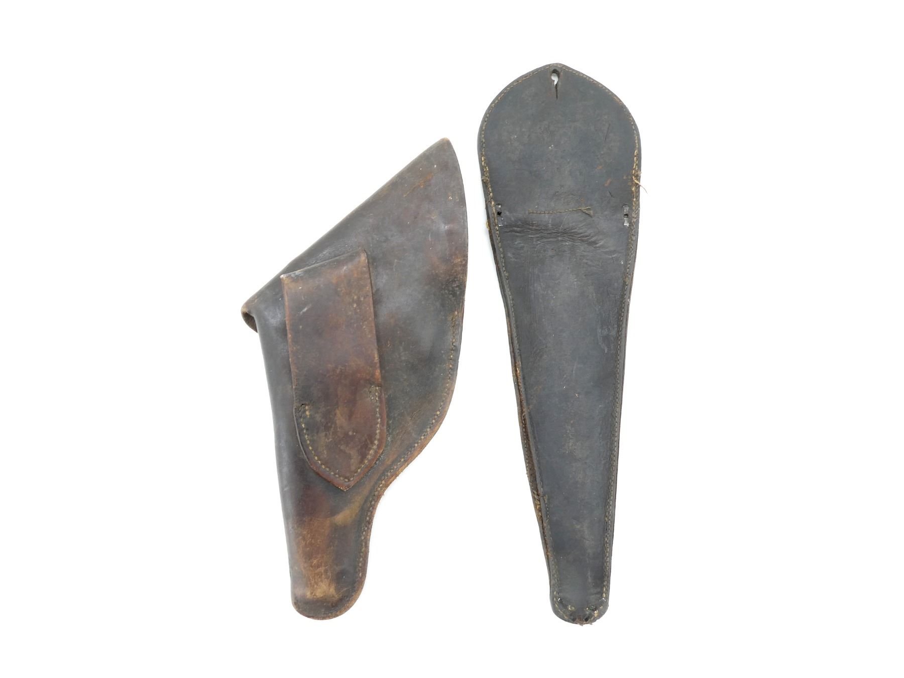 LOT INCLUDES; (1) BROWN LEATHER HOLSTER, FITS RH, UNMARKED, OVERALL LENGTH APPROX. 11.5" & (1) BROWN LEATHER SHEATH, UNMARKED, OVERALL LENGTH APPROX. 14". SEE PHOTOS.