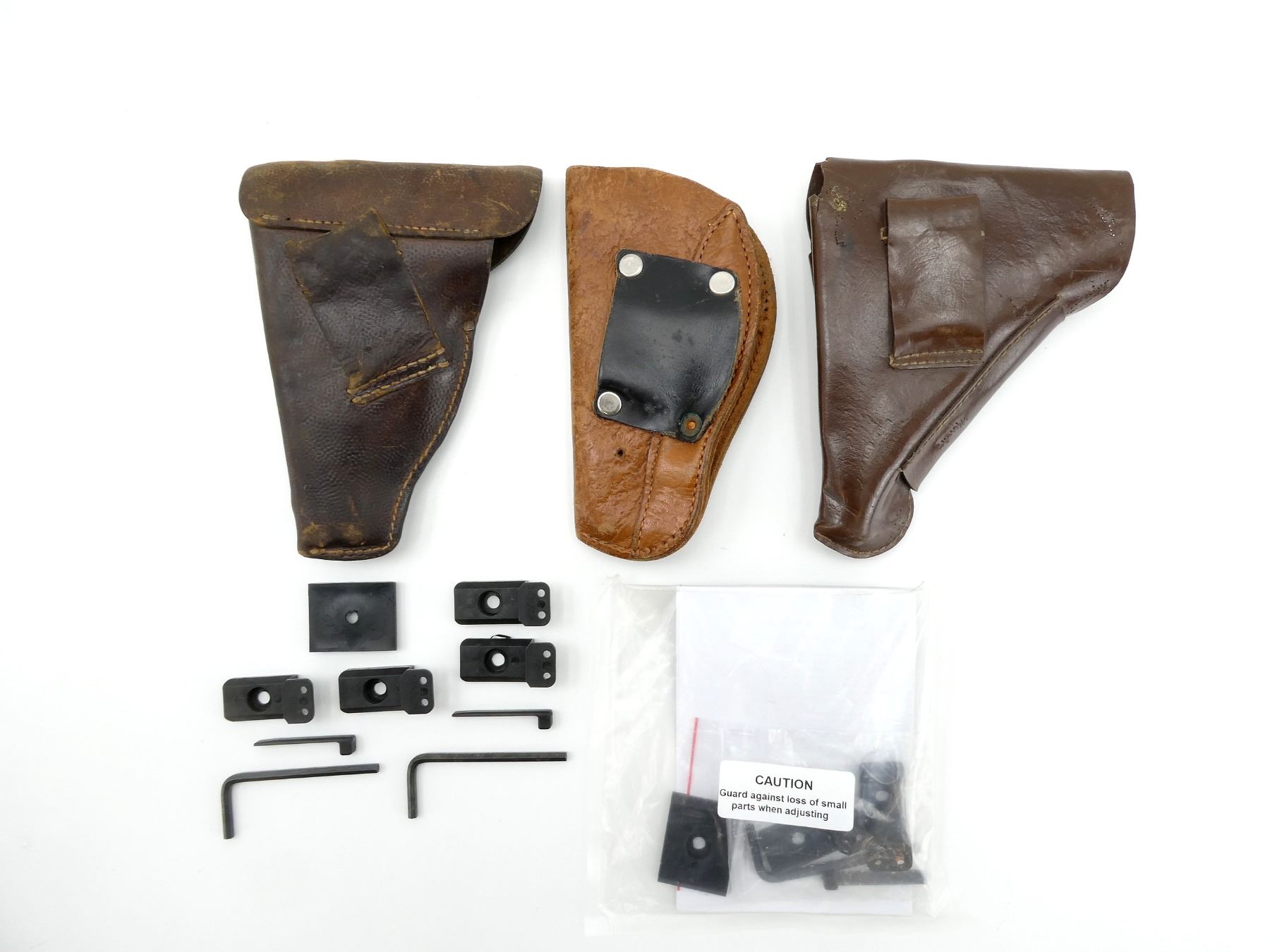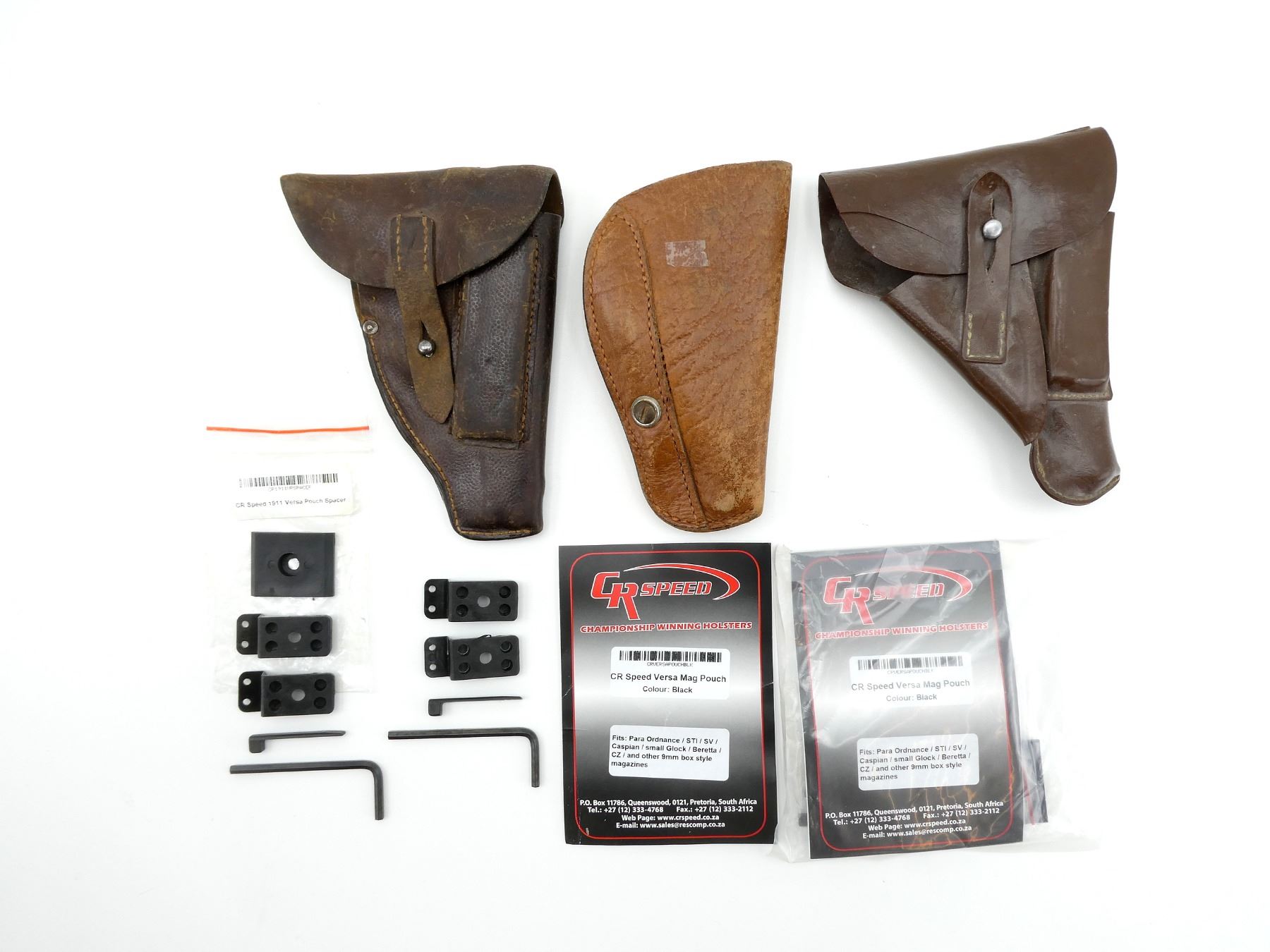 LOT INCLUDES; (1) UNKNOWN BROWN POLYMER HOLSTER, FITS RH, UNMARKED, OVERALL LENGTH APPROX. 7", (1) UNKNOWN BROWN LEATHER HOLSTER, FITS RH, UNMARKED, OVERALL LENGTH APPROX. 7", (1) UNKNOWN BROWN LEATHER HOLSTER, FITS RH, UNMARKED, OVERALL LENGTH APPROX. 7", (2) PACKS OF CR SPEED VERSA MAG POUCH ACCESSORIES, MAY NOT BE COMPLETE / PIECES MAY BE MISSING, IN ORIGINAL PACKAGING & (1) CR SPEED 1911 VERSA POUCH SPACER, MAY NOT BE COMPLETE / PIECES MAY BE MISSING, IN ORIGINAL PACKAGING. SEE PHOTOS.
