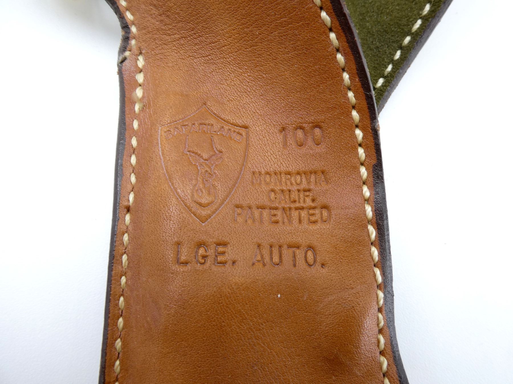 LOT INCLUDES; (1) SAFARILAND BROWN LEATHER HOLSTER, FITS RH, MARKED "LGE. AUTO.", ETC., OVERALL LENGTH APPROX. 23", ADJUSTABLE WITH ELASTIC STRAPS, (1) UNKNOWN BROWN LEATHER SHOULDER HOLSTER, FITS RH, MARKINGS UNCLEAR, OVERALL LENGTH APPROX. 29", ADJUSTABLE WITH ELASTIC STRAPS, (1) UNKNOWN BROWN LEATHER HOLSTER, FITS RH, UNMARKED, OVERALL LENGTH APPROX. 7.5" & (1) UNKNOWN BROWN LEATHER HOLSTER, FITS RH, UNMARKED, OVERALL LENGTH APPROX. 12". SEE PHOTOS.