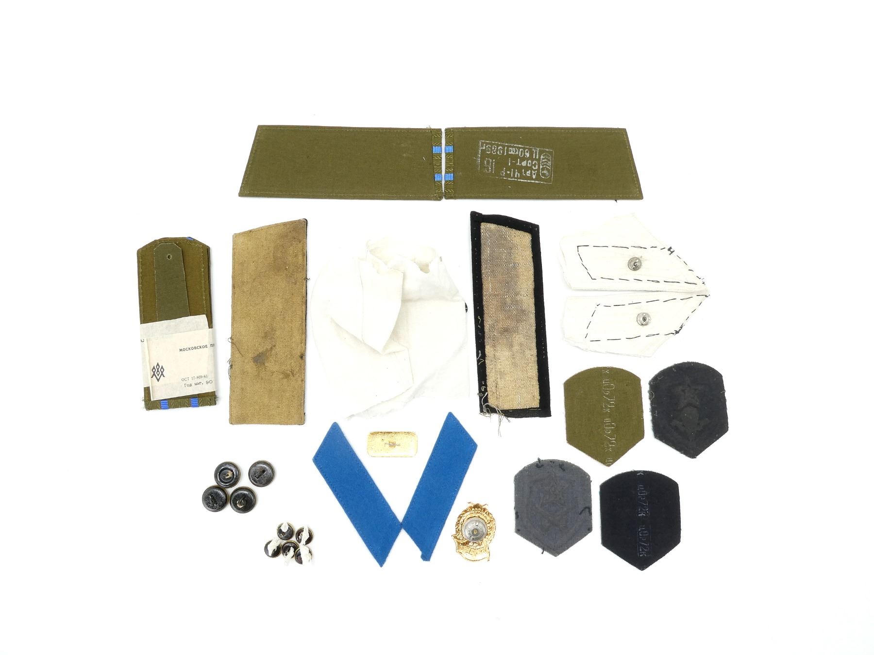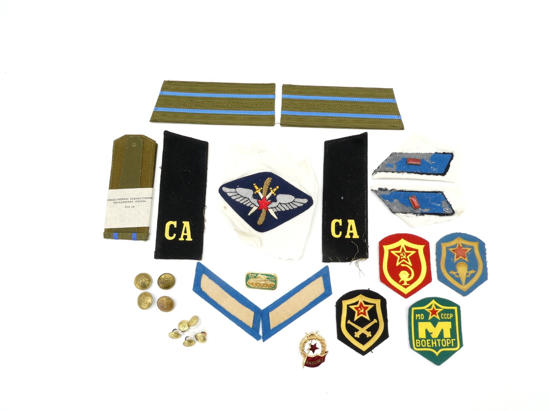 APPROX. (25) PIECES, VARIOUS MATERIALS / COLOURS / SIZES, INCLUDES; RUSSIAN GUARDS BADGE, RUSSIAN T-70 TANK BADGE, ASSORTED WWII BRASS / GOLD COLOURED HAMMER / SICKLE IN STAR BUTTONS, WWII RUSSIAN RANK COLLAR BADGES, WWII RUSSIAN PILOTS BADGE, ASSORTED RUSSIAN MILITARY SHOULDER BOARDS, RED ARMY MEDICAL / VETERINARY SERVICES SLEEVE BADGE, RUSSIAN MILITARY QUARTERMASTER BADGE, RUSSIAN MILITARY AIRBORNE FORCES BADGE, ETC. SEE PHOTOS.