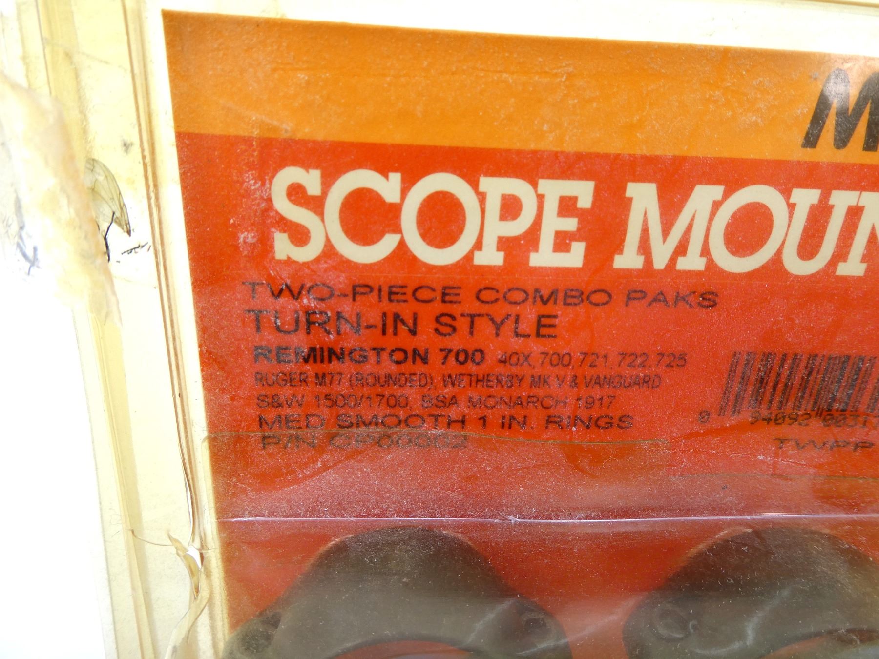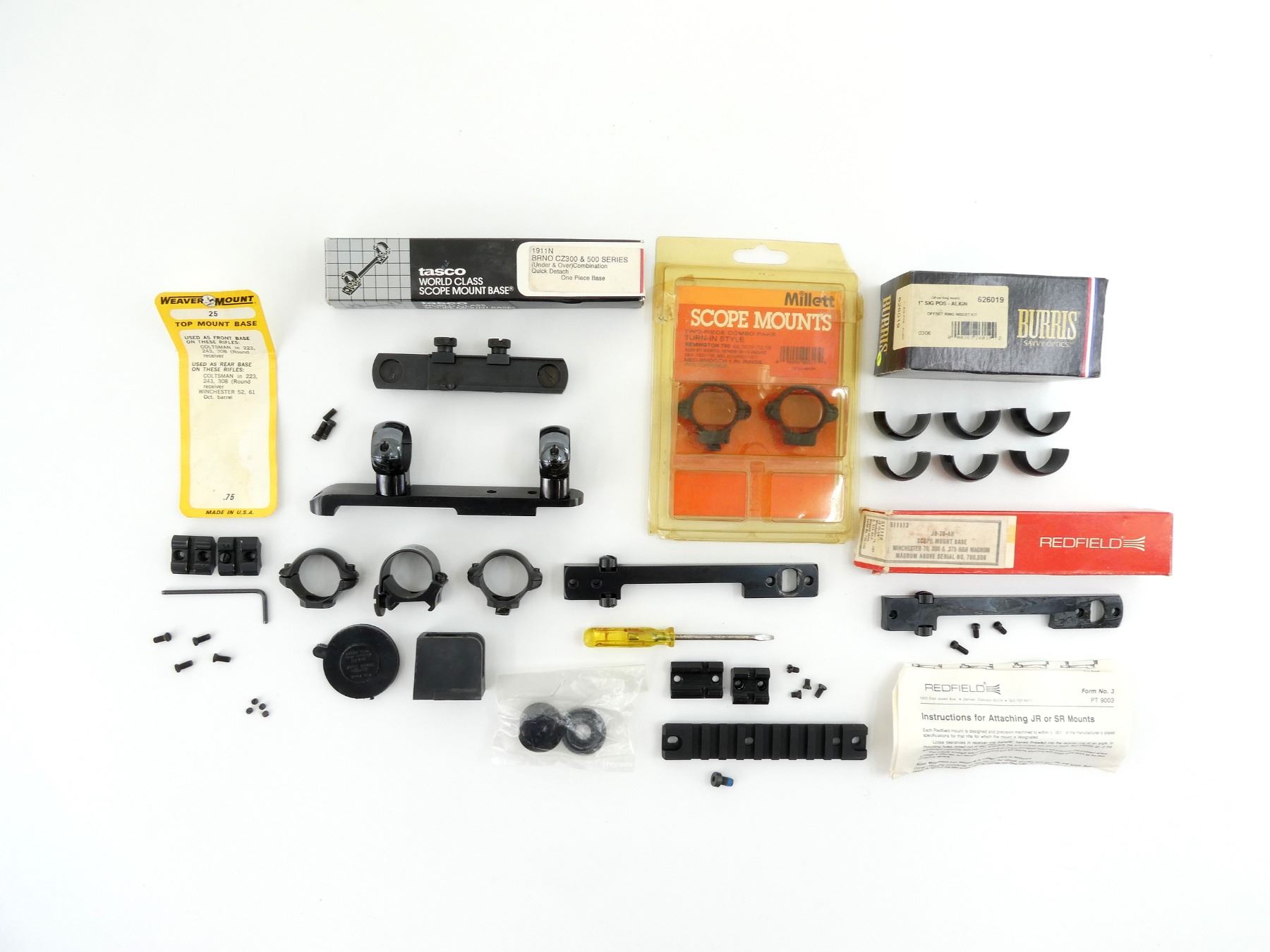 LOT INCLUDES; (1) TASCO U/O QUICK DETACH BASE, BRNO CZ300 & 500 SERIES, PRODUCT #: 1911N, APPEARS NEW OLD STOCK, IN ORIGINAL PACKAGING, (1) REDFIELD JR 70-AH BASE, FITS WINCHESTER 70, 300 & .375 H&H MAGNUM ABOVE SERIAL NO. 700,000, PRODUCT #: 511113, APPEARS NEW OLD STOCK, IN ORIGINAL PACKAGING, (1) UNKNOWN BASE, UNMARKED, APPEARS NEW OLD STOCK, (1) WEAVER TOP MOUNT BASE, USED AS FRONT & REAR BASE, APPEARS NEW OLD STOCK, (1) BURRIS OFFSET RINGS INSERTS, PRODUCT #: 626019, APPEARS NEW OLD STOCK, (1) WEAVER MOUNT WITH 1" DIAMETER RINGS & (1) PACK OF MILLETT SCOPE RINGS, MEDIUM, 1" DIAMETER, PRODUCT #: CP00002, APPEARS NEW OLD STOCK, IN ORIGINAL PACKAGING, ETC. MAY NOT BE COMPLETE / PIECES MAY BE MISSING. MAY REQUIRE FITTING. SEE PHOTOS.
