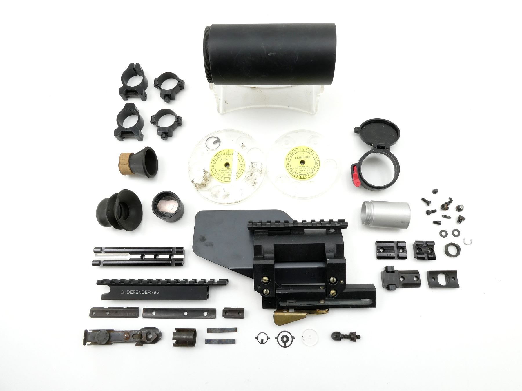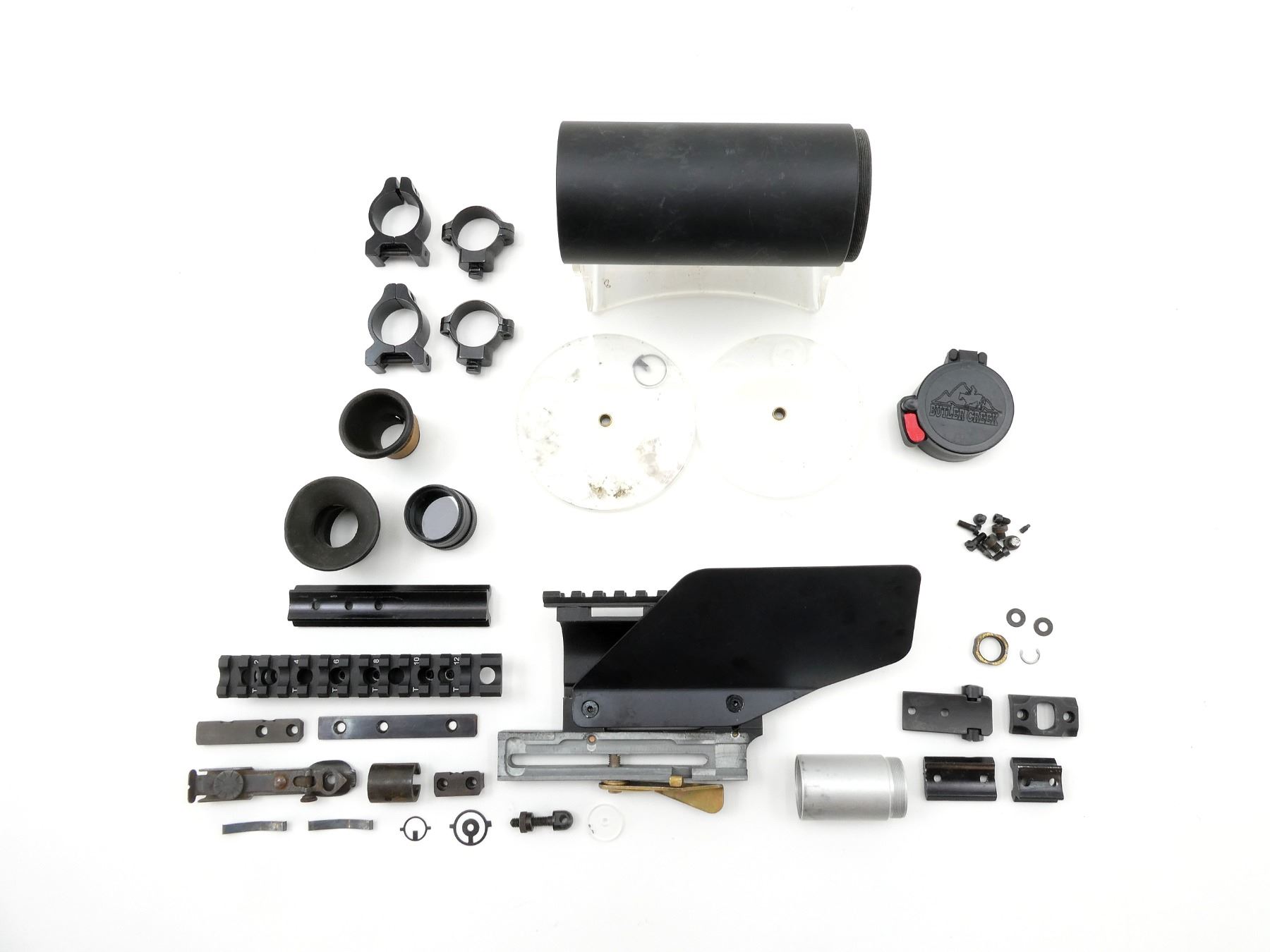 LOT INCLUDES; (2) UNKNOWN SCOPE RAIL MOUNTS, 1 WITH BRASS REFLECTOR, (4) UNKNOWN SCOPE RINGS, 1" DIAMETER, (2) SLIMLINE GLOBE FRONT SIGHT APERTURES, (2) SCOPE SUN SHADES, APPROX. 1.10" & 2.30" DIAMETER, (1) BUTLER CREEK FLIP-UP LENS COVER & (5) UNKNOWN MOUNTS, ETC. MAY REQUIRE FITTING. SEE PHOTOS.