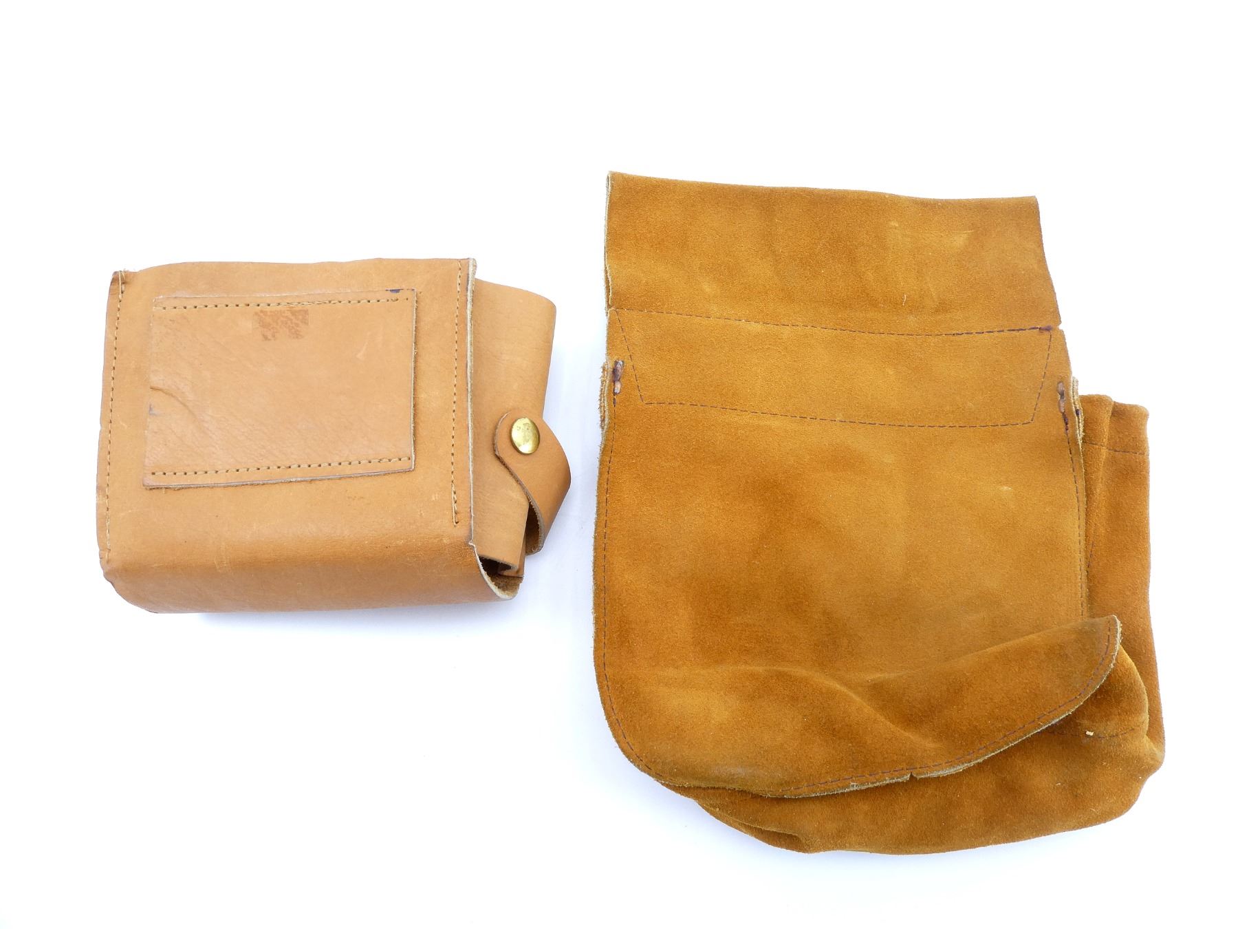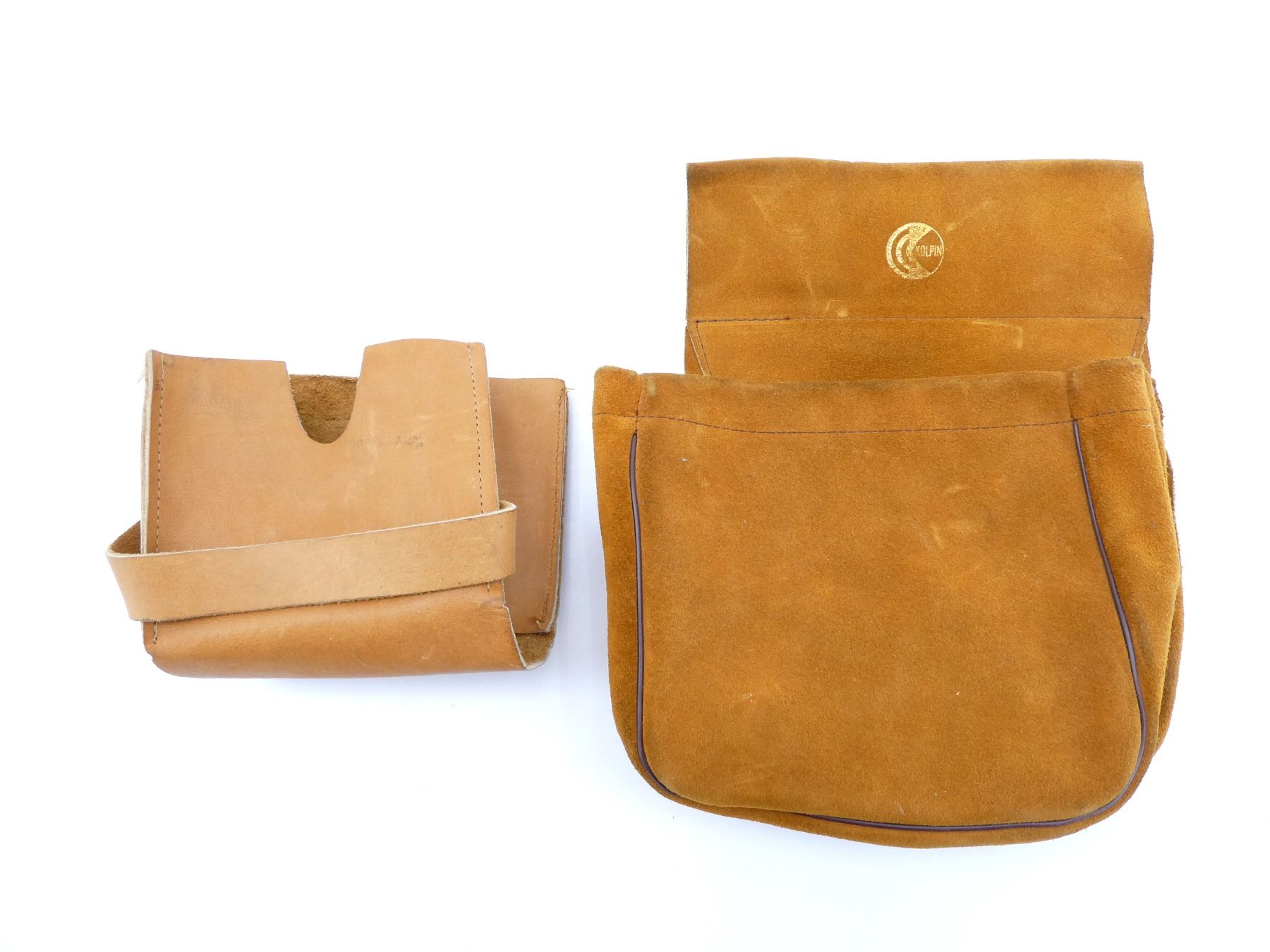 LOT INCLUDES; (2) BROWN LEATHER POUCHES, ONE TO USE WITH SHELLS / ONE TO USE WITH SHELL CASINGS, VARIOUS MARKINGS. SEE PHOTOS.
