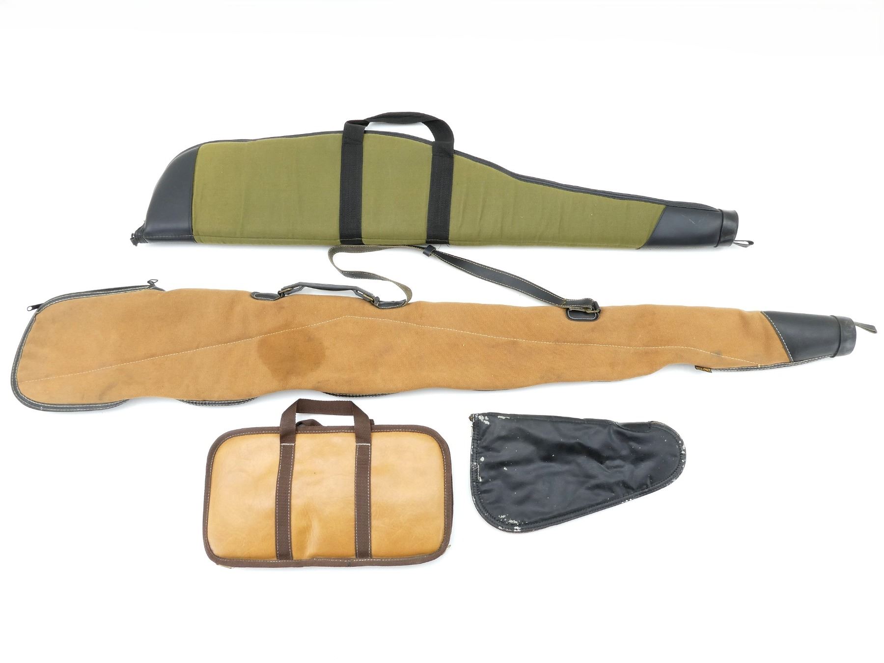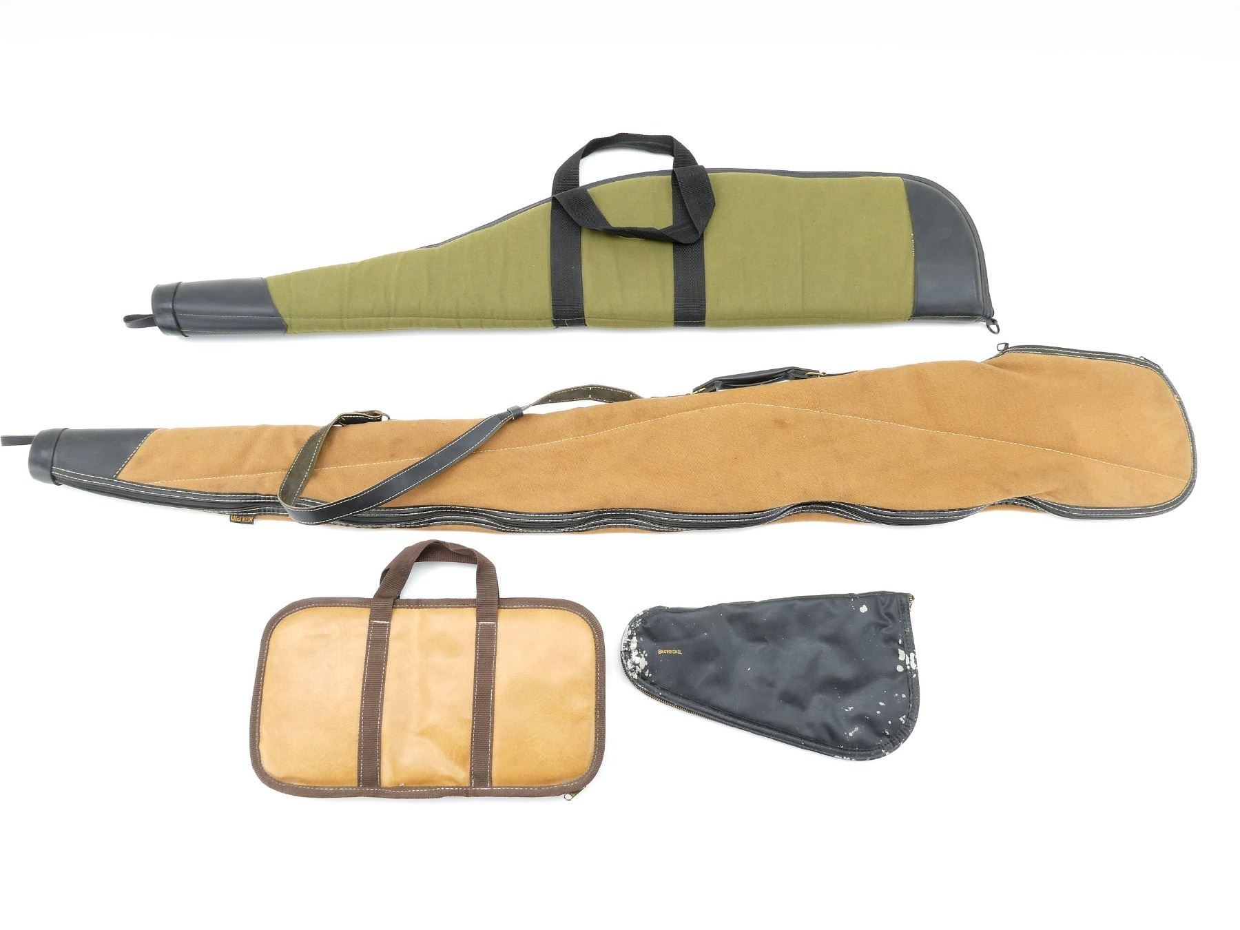 LOT INCLUDES; (2) SOFT PADDED GUN CASES, CARRY HANDLES, (1) HAS A SHOULDER STRAP, ZIPPERED, (2) SOFT PADDED HAND GUN CASES, ZIPPERED, (1) HAS A INSIDE POCKET, APPROX. OVERALL LENGTH 13"-54", SHOWS WEAR AND TEAR FROM USAGE, SEE PHOTOS.