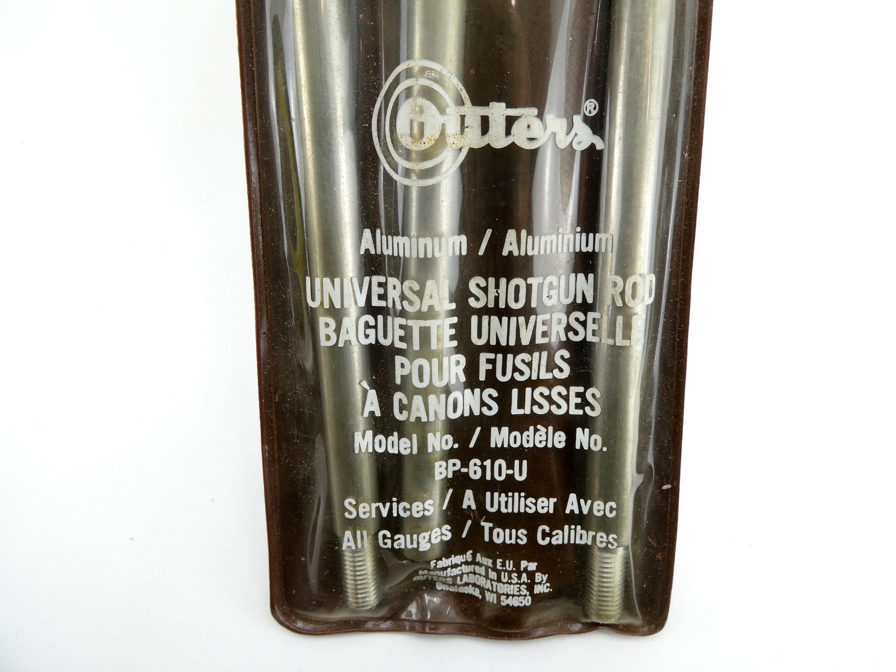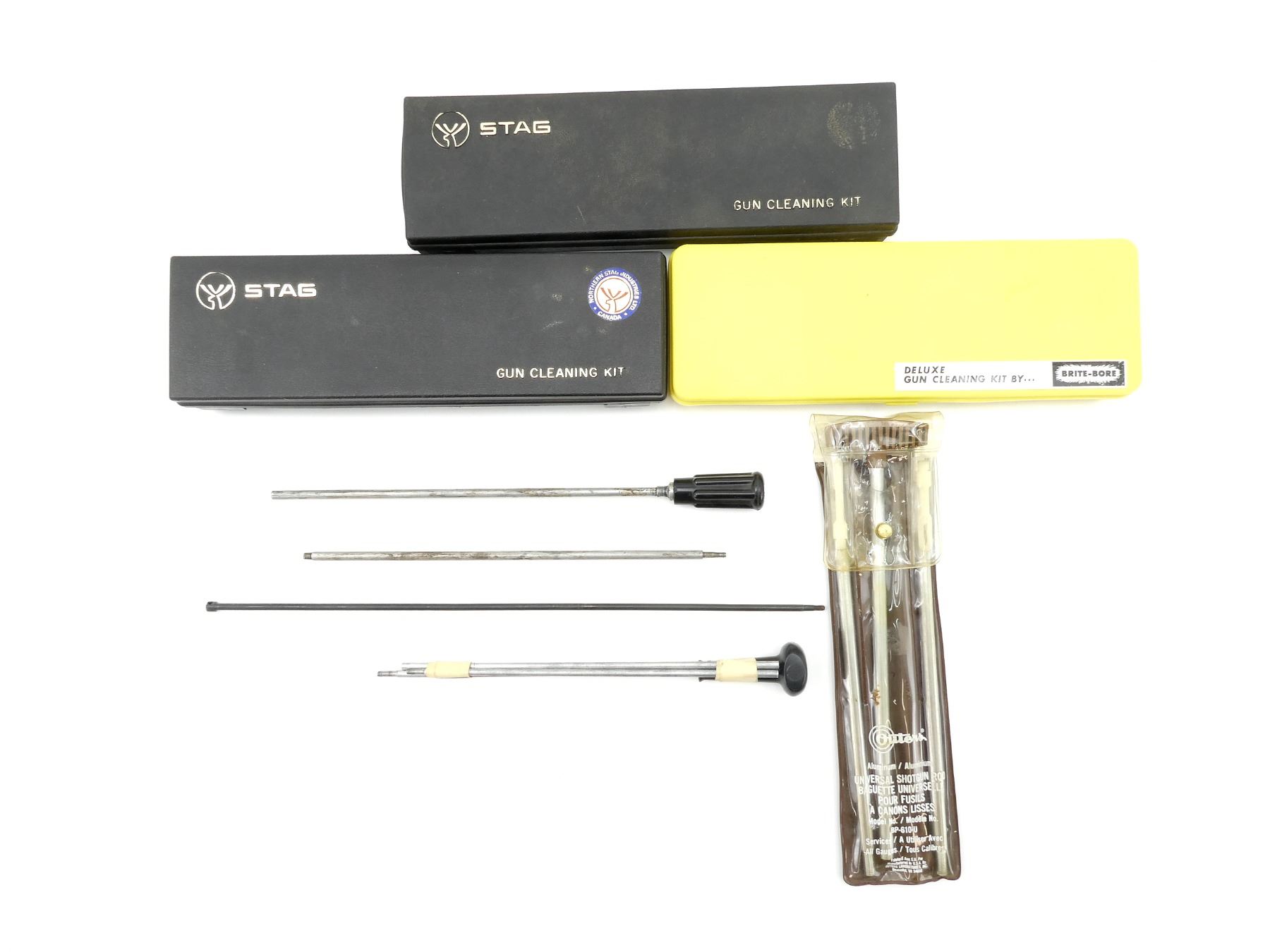 LOT INCLUDES; (2) STAG GUN CLEANING KITS, INCLUDES; RODS, (1) OUTERS ALUMINUM UNIVERSAL SHOTGUN RODS, WITH JAGS & (1) BRITE-BORE GUN CLEANING KIT, INCLUDES; RODS, ETC. SEE PHOTOS.