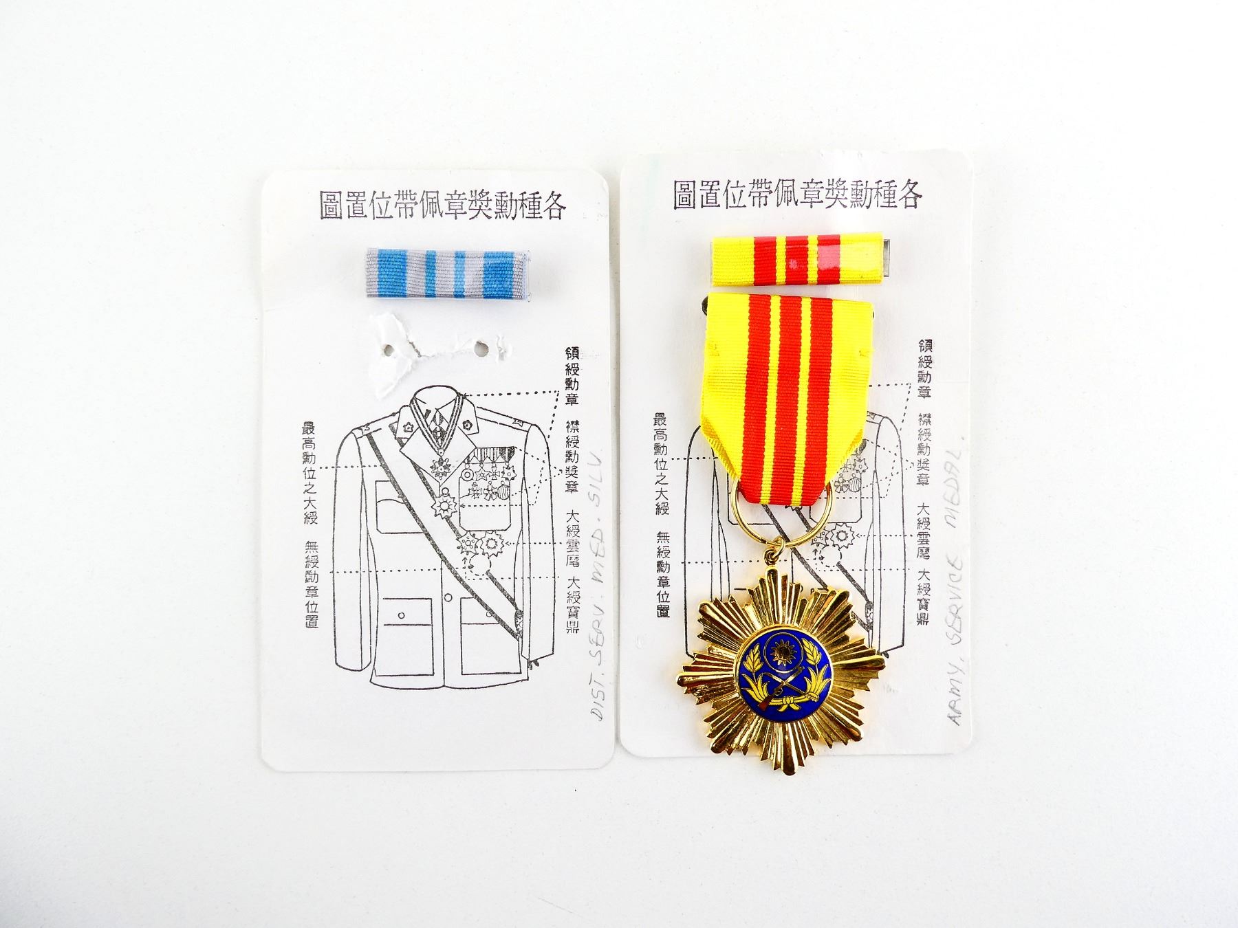 LOT INCLUDES; (1) TAIWANESE, ALSO KNOWN AS, THE REPUBLIC OF CHINA, MEDAL OF THE SPIRIT OF CHU BLUE / GREY RIBBON BAR & (1) CHINESE PEOPLE'S LIBERATION ARMY, ORDER OF LIBERATION 3RD CLASS MEDAL RIBBON WITH WRONG MEDAL, UNKNOWN MEDAL & ORDER OF LIBERATION 3RD CLASS RIBBON BAR. SEE PHOTOS.