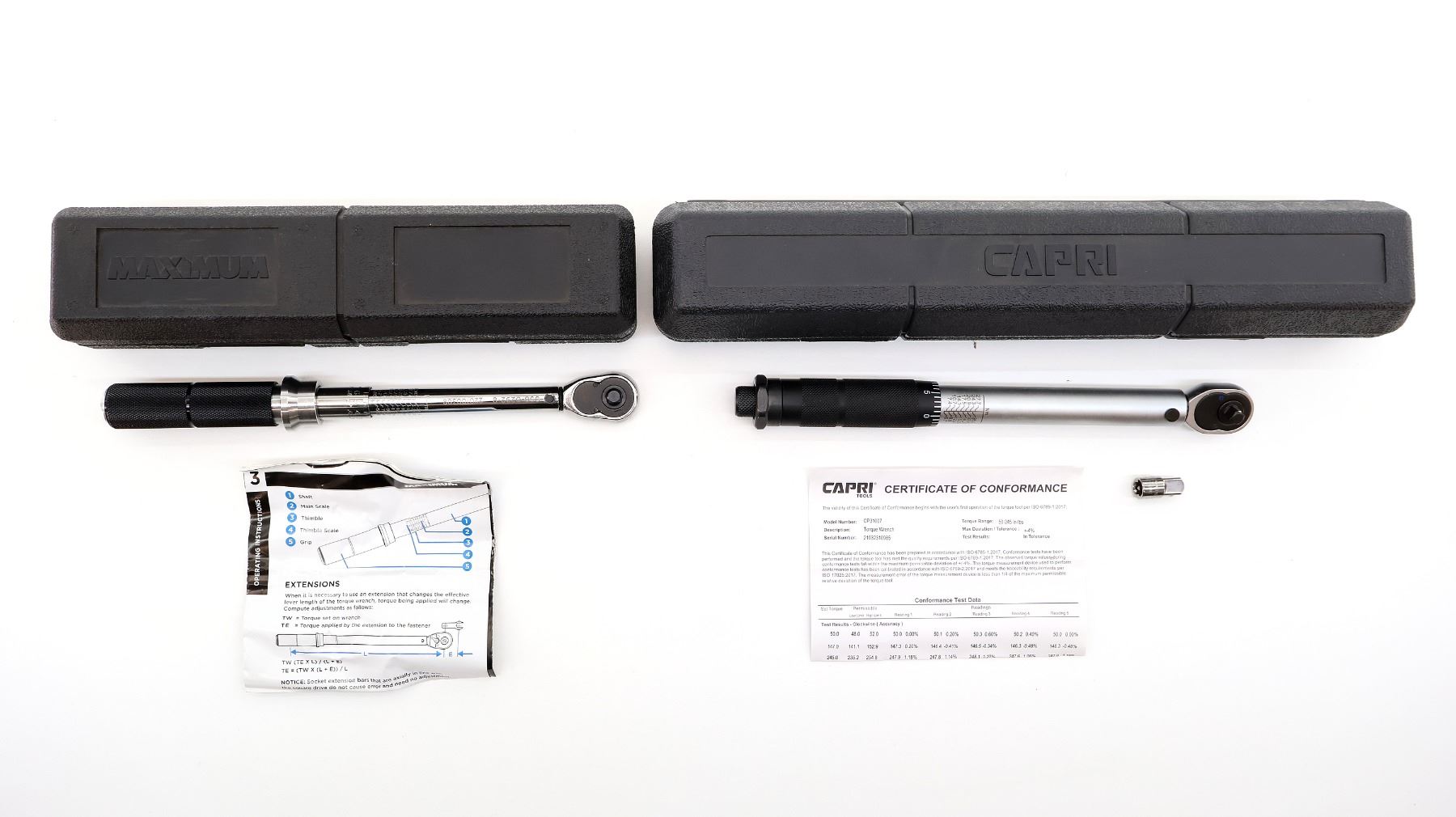 LOT INCLUDES; (1) MAXIMUM TORQUE WRENCH, WITH INSTRUCTIONS & CARRY CASE, OVERALL LENGTH APPROX. 10.75" & (1) CAPRI TORQUE WRENCH, WITH INSTRUCTIONS & CARRY CASE, OVERALL LENGTH APPROX. 10 7/8". SEE PHOTOS.