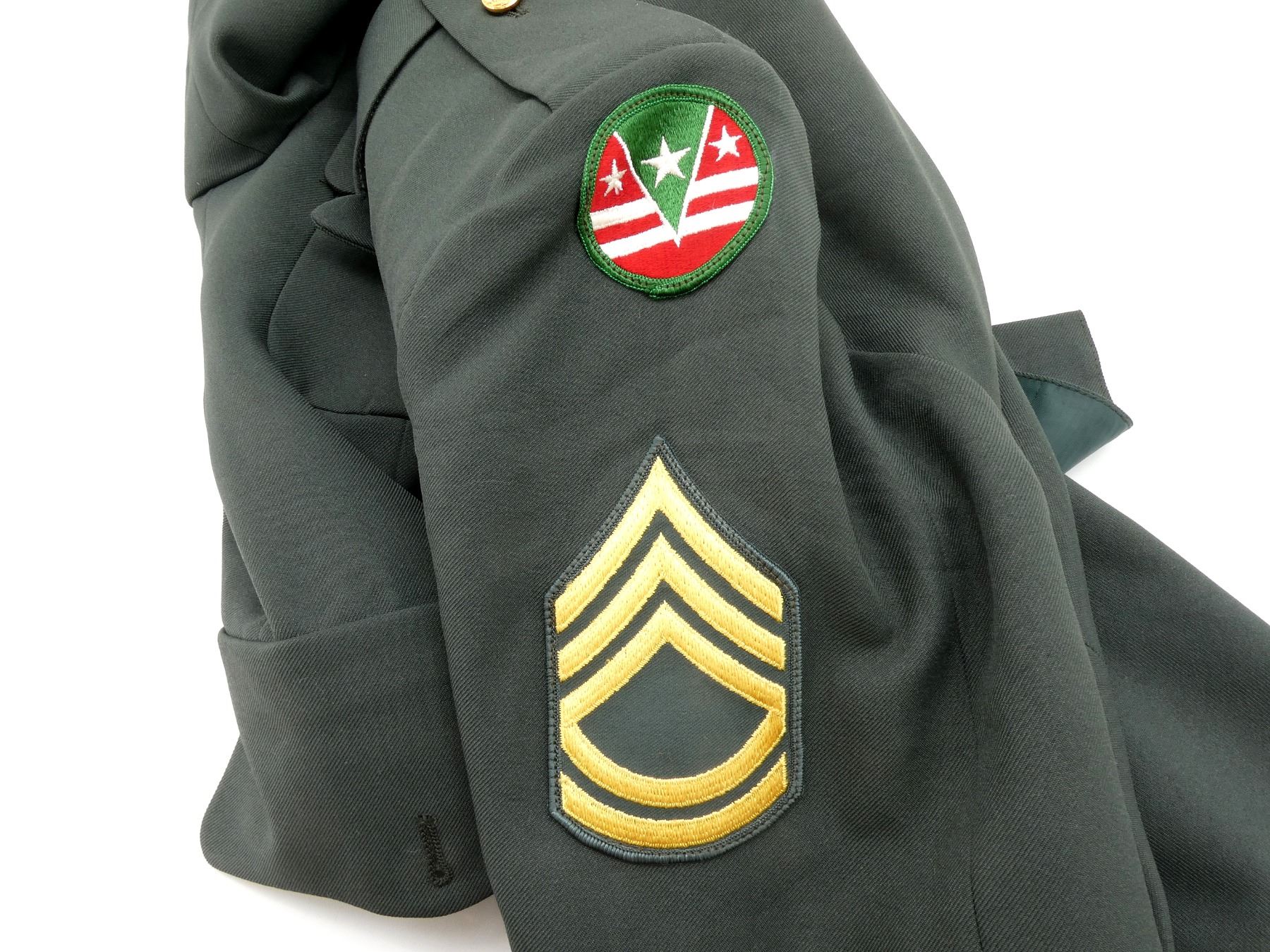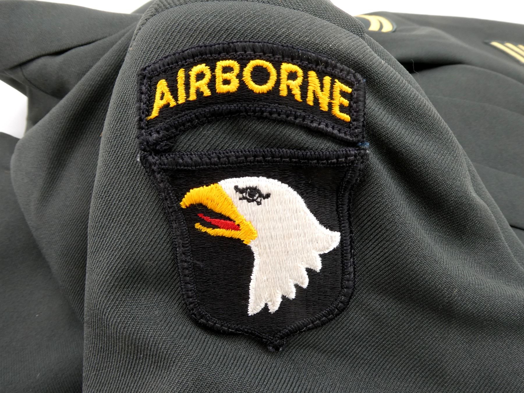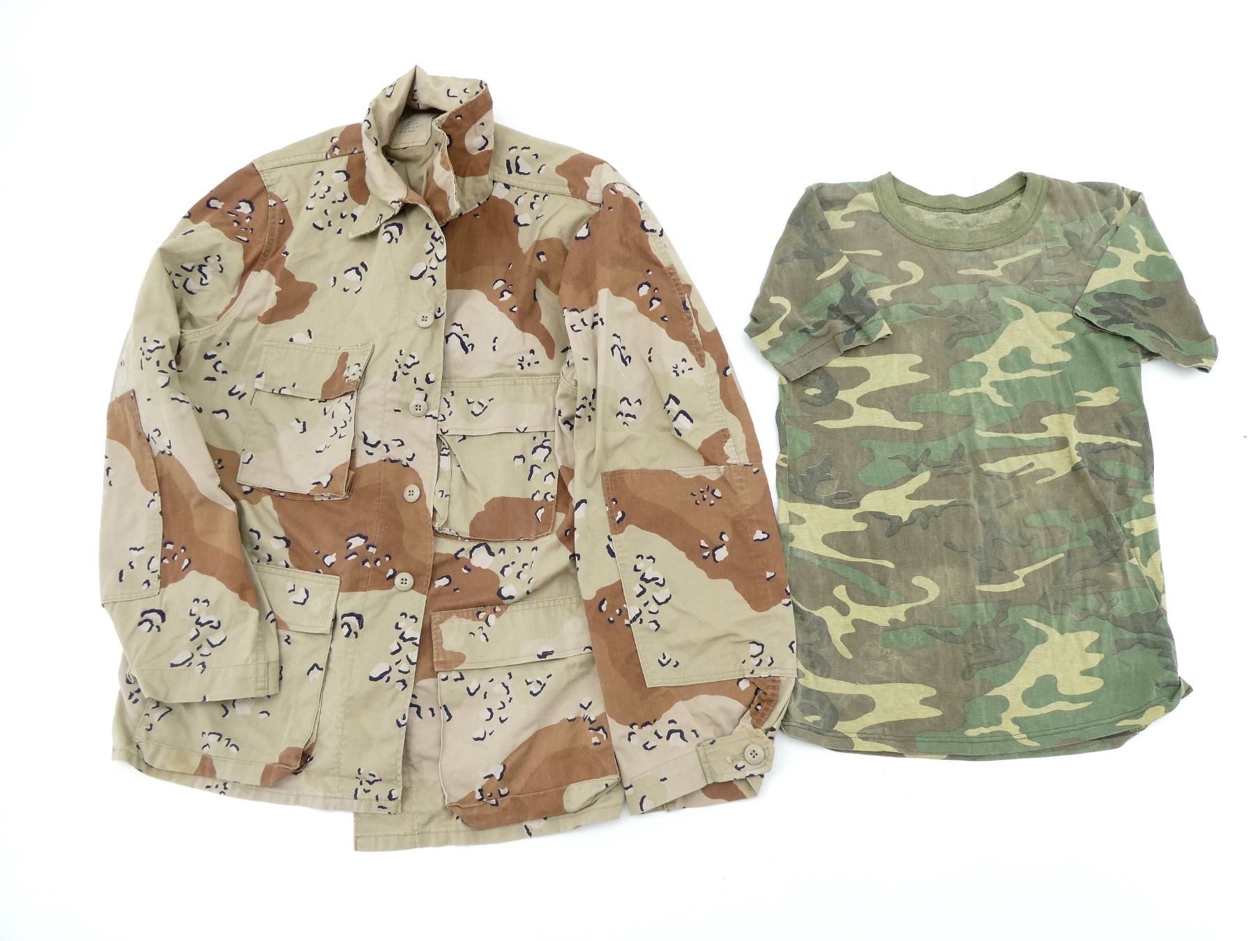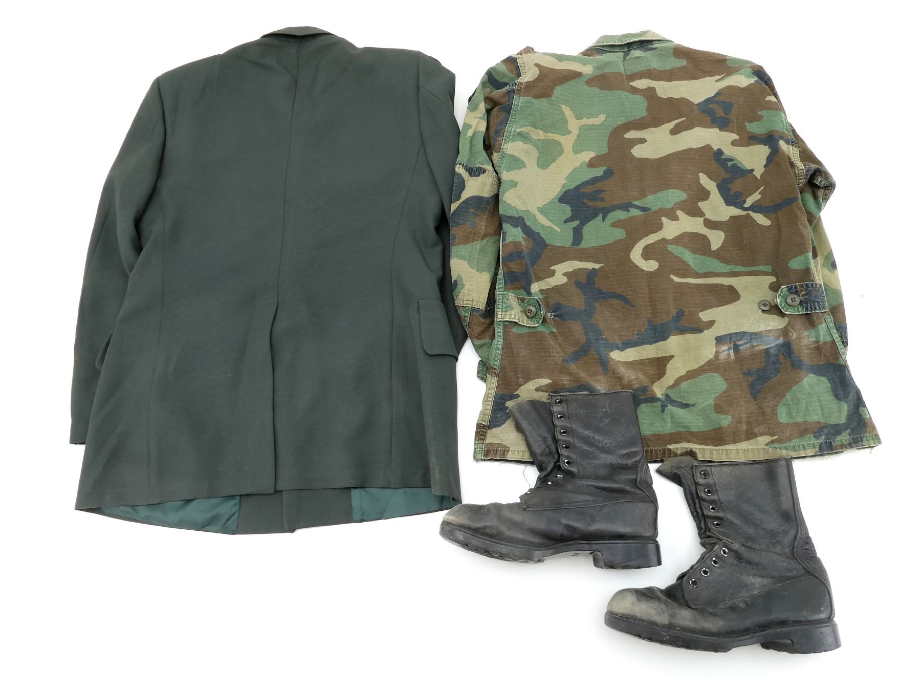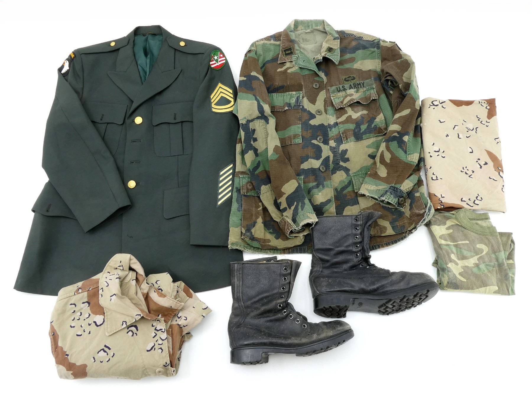 LOT INCLUDES; (1) GREEN TUNIC WITH AIRBORNE SHOULDER BADGE, 124TH ARMY RESERVE COMMAND BADGE, 18 YEARS OF SERVICE STRIPES, SERGEANT FIRST CLASS BADGES, OVERSEAS SERVICE STRIPES, VARIOUS LABELS / MARKINGS, BUTTON-FRONT, SHOWS SLIGHT WEAR, SHOULDER WIDTH APPROX. 16.25", (1) HOT WEATHER WOODLAND CAMO COMBAT COAT, SIZE SMALL-REG., VARIOUS LABELS / MARKINGS, RANGER / AIRBORNE / 35TH SIGNAL BRIGADE SHOULDER BADGES, SIGNALS COLLAR BADGE, CAPTAIN RANK COLLAR BADGE, PARACHUTIST BADGE, BUTTON-FRONT, SHOWS AGE / WEAR, (1) DESERT CAMO COMBAT COAT, SIZE LRG-REG, VARIOUS LABELS / MARKINGS, BUTTON-FRONT, SHOWS WEAR, (1) CAMO T-SHIRT, NO VISIBLE MARKINGS, SHOWS AGE / WEAR, SHOULDER WIDTH APPROX. 14.5", (1) BLACK LEATHER COMBAT BOOTS, POSSIBLY CANADIAN MILITARY, MARKED: "815020, 8 1/2F, 3 92 3473", "GREB, 8 1/2F, 270/106", SIZE 8 1/2F, NO LACES, SHOWS AGE / WEAR / TEAR, ETC. SEE PHOTOS.