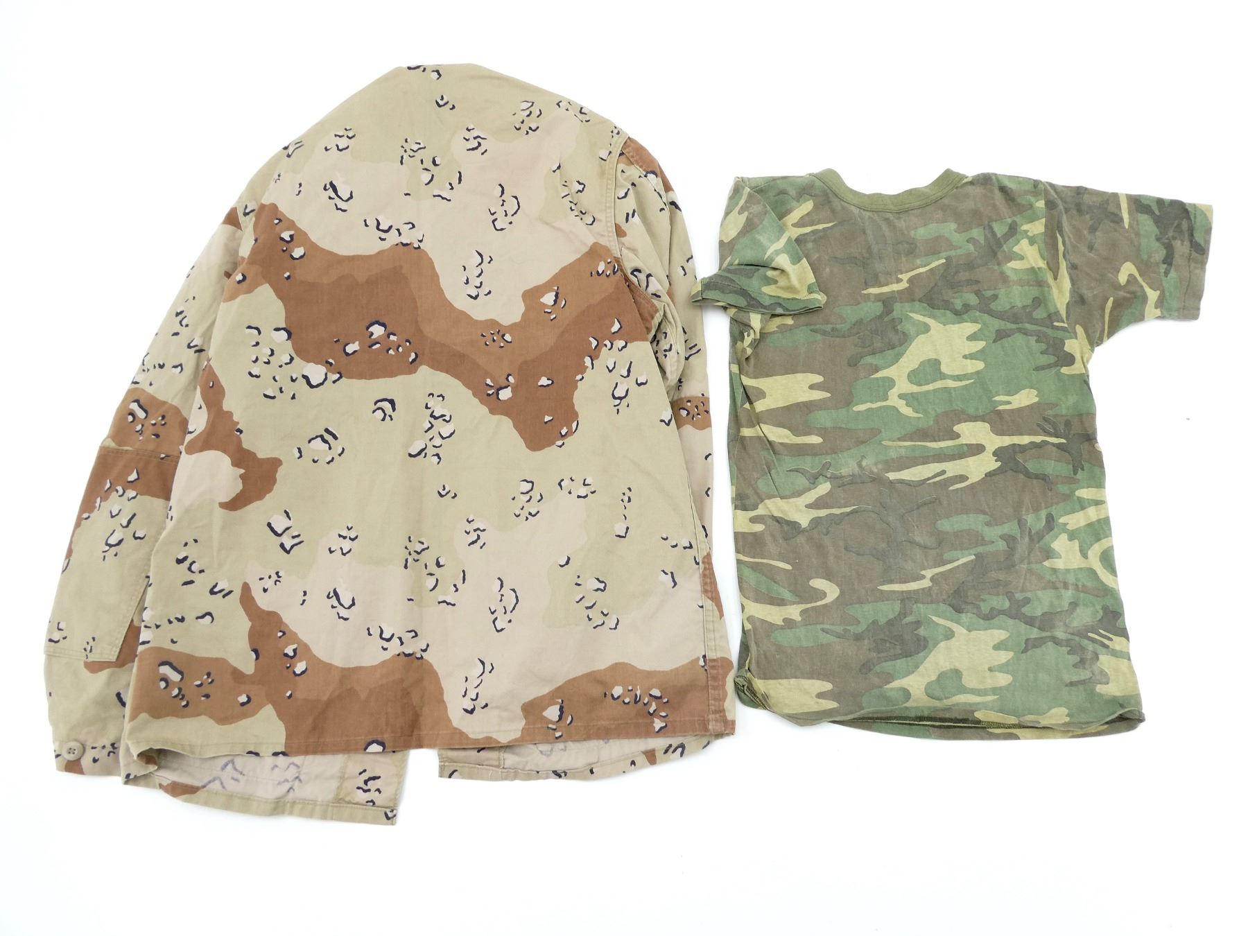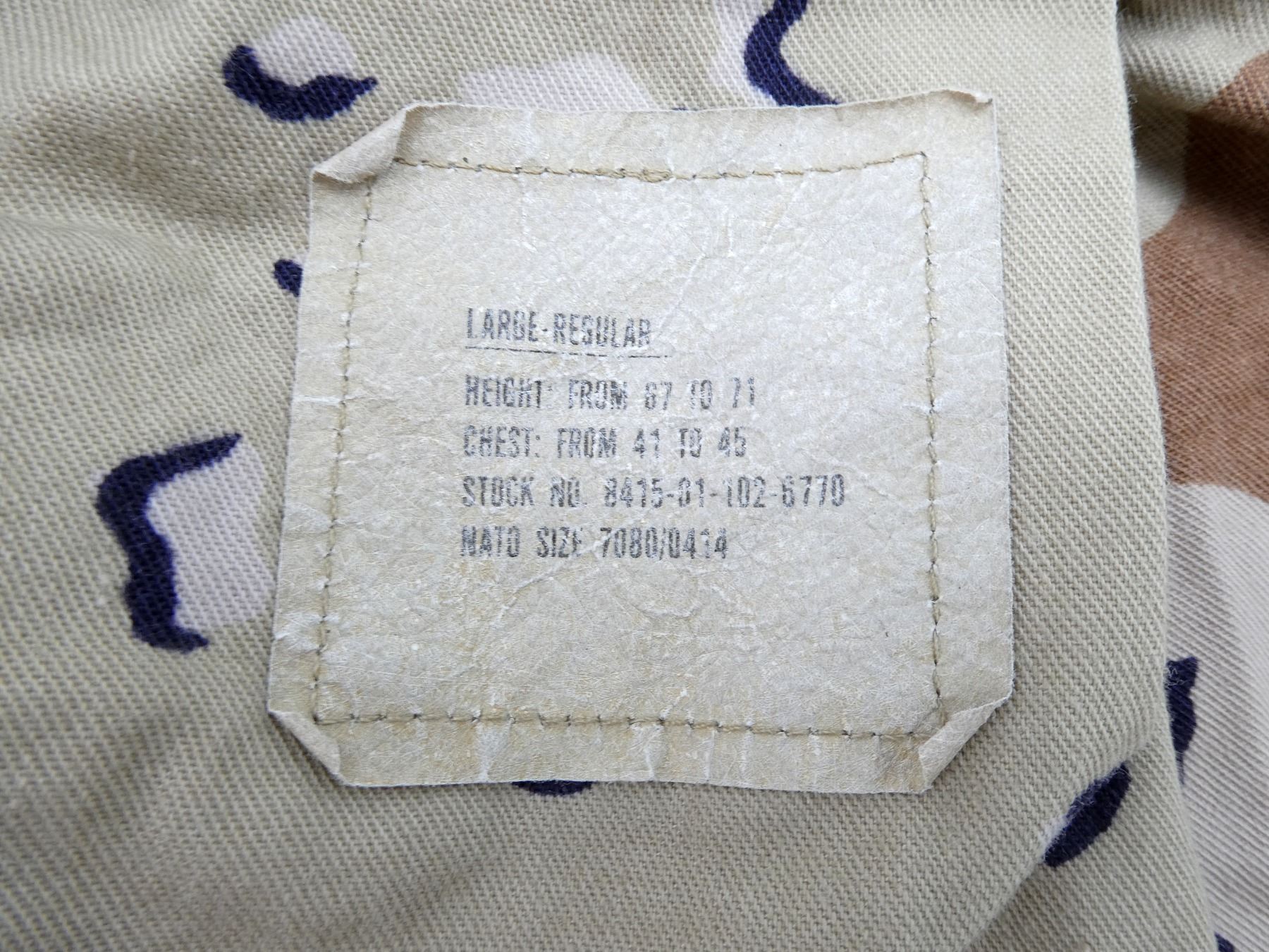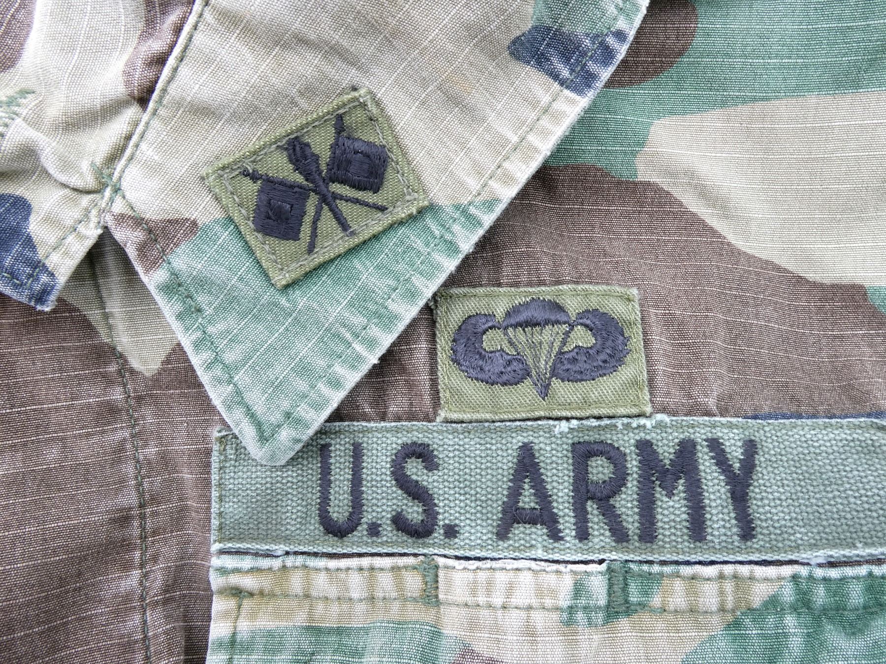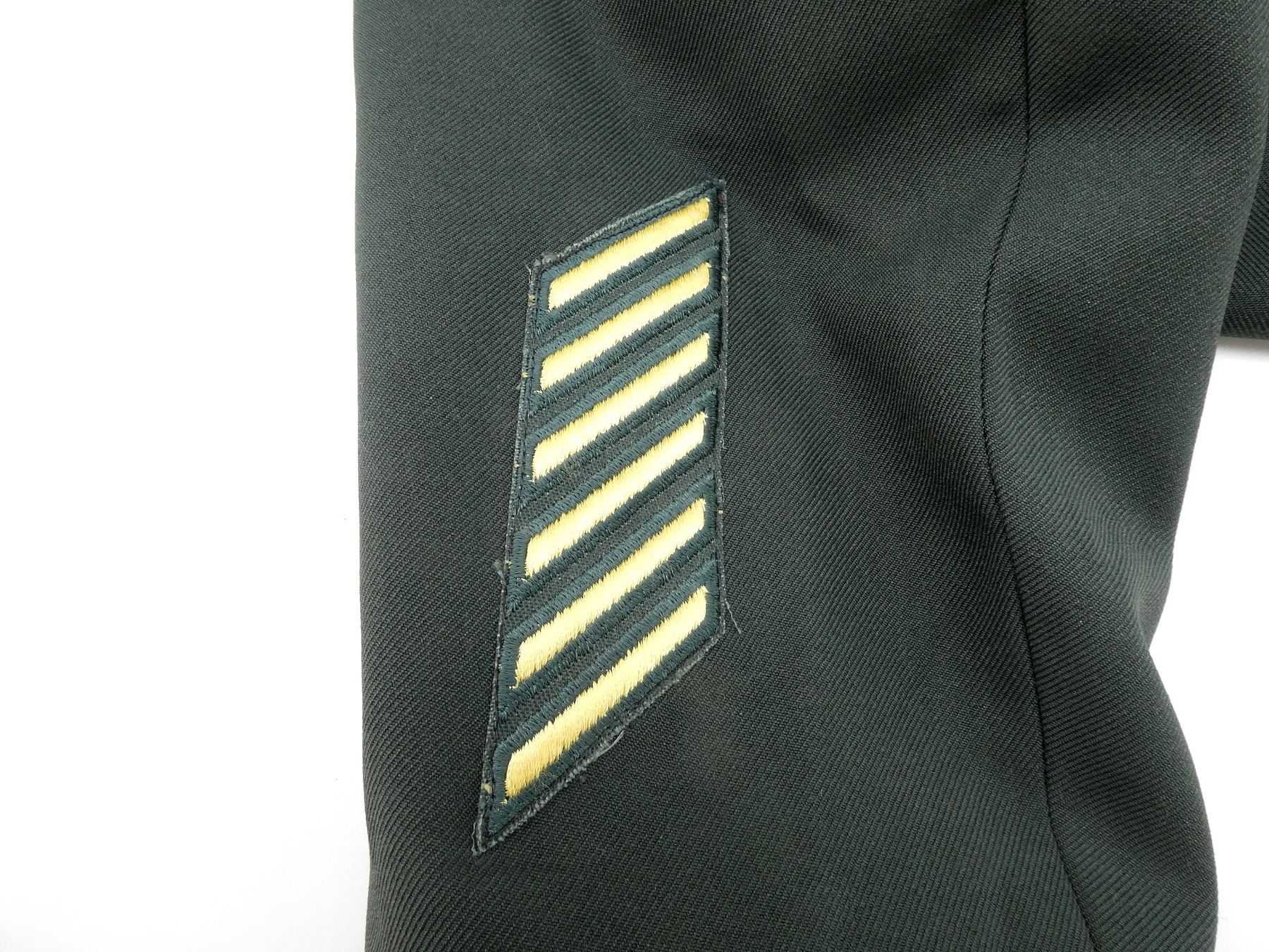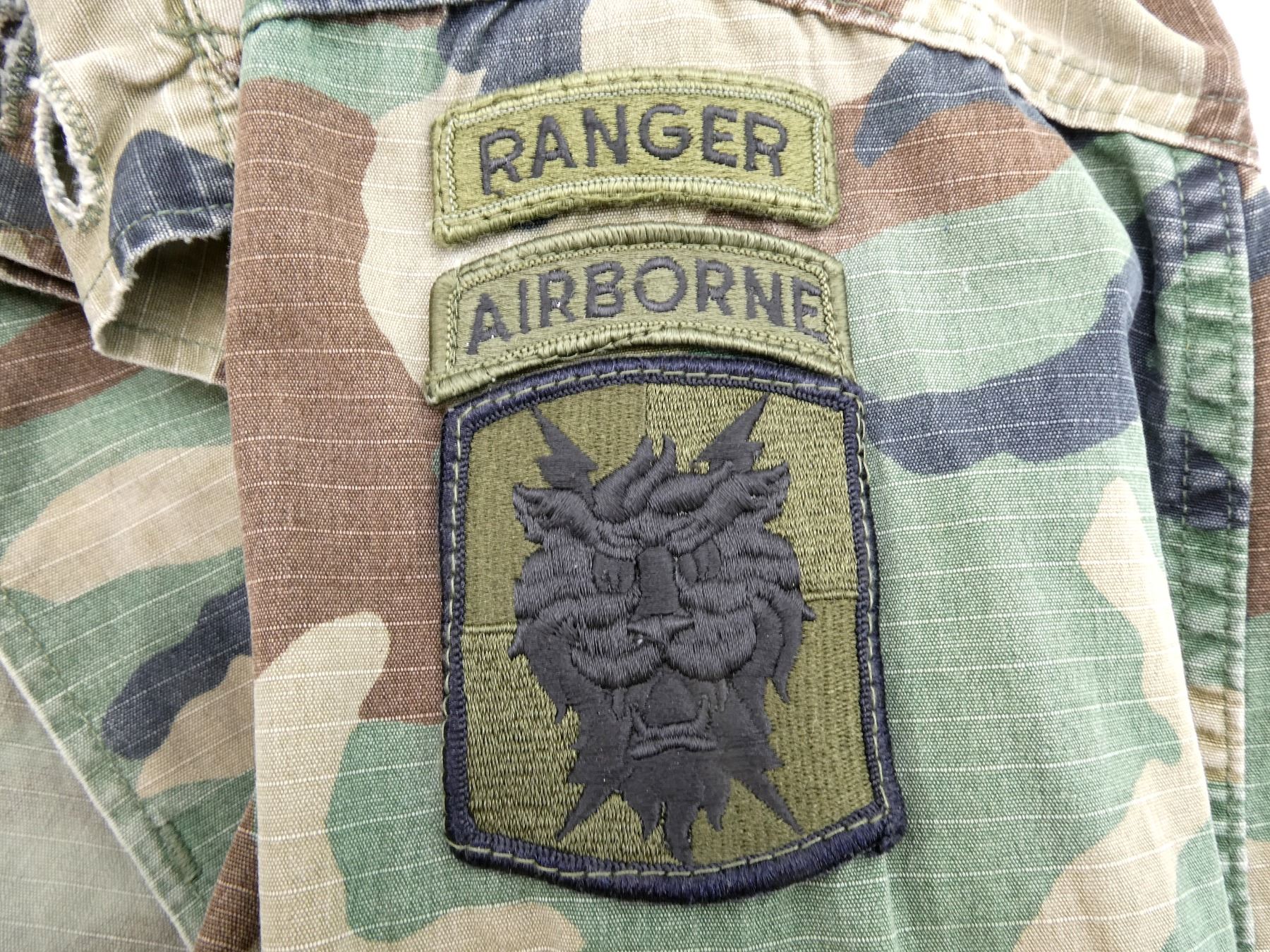 LOT INCLUDES; (1) GREEN TUNIC WITH AIRBORNE SHOULDER BADGE, 124TH ARMY RESERVE COMMAND BADGE, 18 YEARS OF SERVICE STRIPES, SERGEANT FIRST CLASS BADGES, OVERSEAS SERVICE STRIPES, VARIOUS LABELS / MARKINGS, BUTTON-FRONT, SHOWS SLIGHT WEAR, SHOULDER WIDTH APPROX. 16.25", (1) HOT WEATHER WOODLAND CAMO COMBAT COAT, SIZE SMALL-REG., VARIOUS LABELS / MARKINGS, RANGER / AIRBORNE / 35TH SIGNAL BRIGADE SHOULDER BADGES, SIGNALS COLLAR BADGE, CAPTAIN RANK COLLAR BADGE, PARACHUTIST BADGE, BUTTON-FRONT, SHOWS AGE / WEAR, (1) DESERT CAMO COMBAT COAT, SIZE LRG-REG, VARIOUS LABELS / MARKINGS, BUTTON-FRONT, SHOWS WEAR, (1) CAMO T-SHIRT, NO VISIBLE MARKINGS, SHOWS AGE / WEAR, SHOULDER WIDTH APPROX. 14.5", (1) BLACK LEATHER COMBAT BOOTS, POSSIBLY CANADIAN MILITARY, MARKED: "815020, 8 1/2F, 3 92 3473", "GREB, 8 1/2F, 270/106", SIZE 8 1/2F, NO LACES, SHOWS AGE / WEAR / TEAR, ETC. SEE PHOTOS.