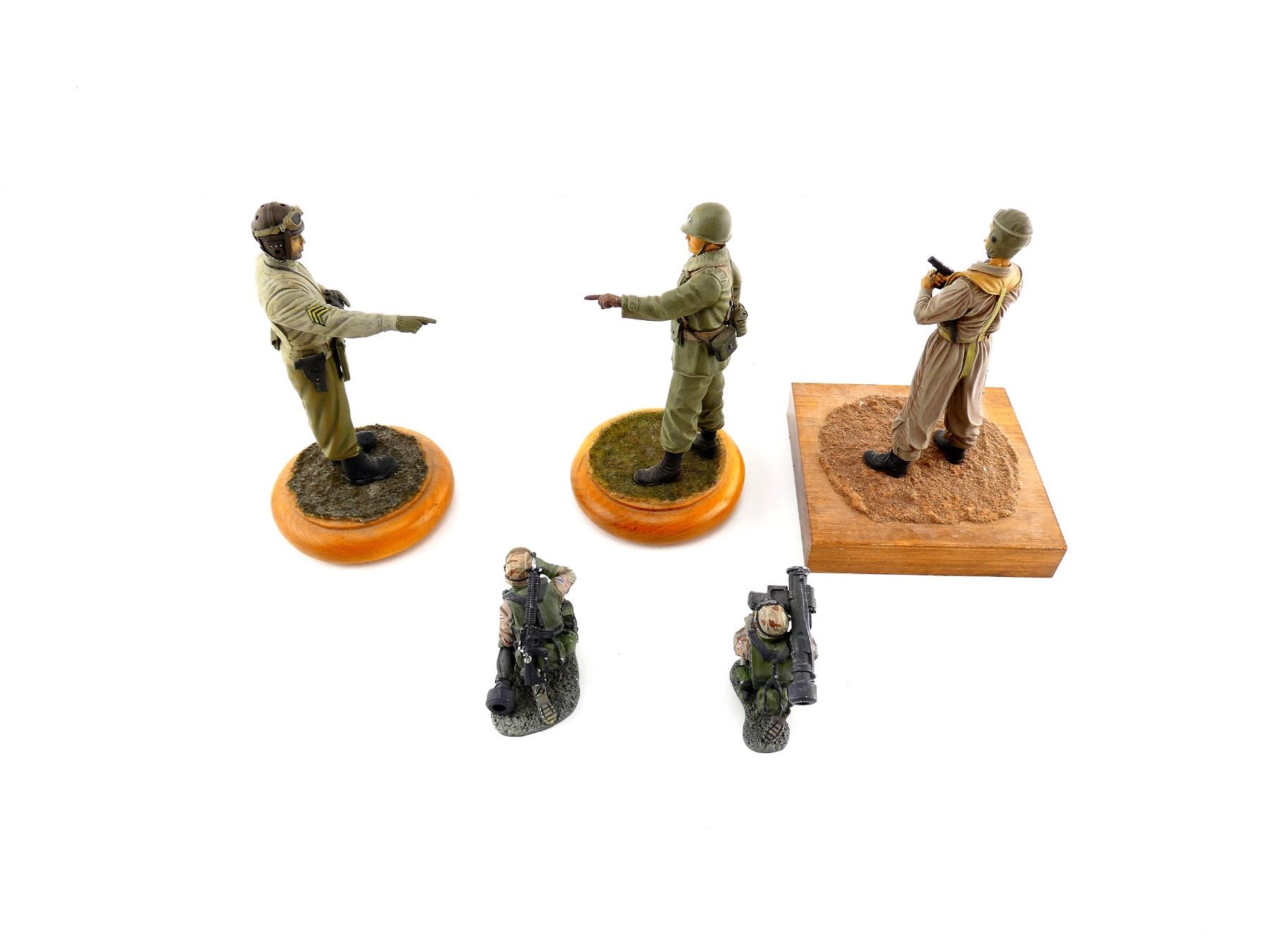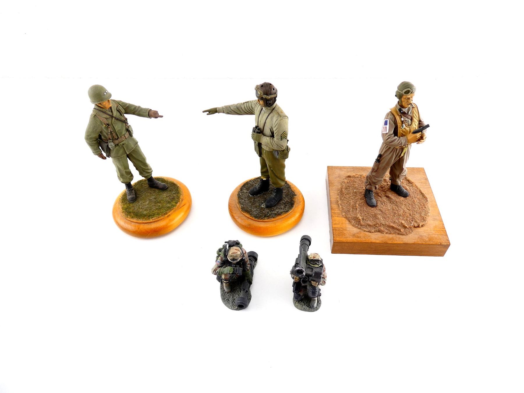 LOT INCLUDES; (5) ASSORTED U.S. SOLDIER FIGURES, THREE AFFIXED TO WOODEN BASES, TWO MARKED: "WWW.THE COLLECTORS SHOWCASE.COM", VARIOUS MATERIALS / COLOURS. SEE PHOTOS.