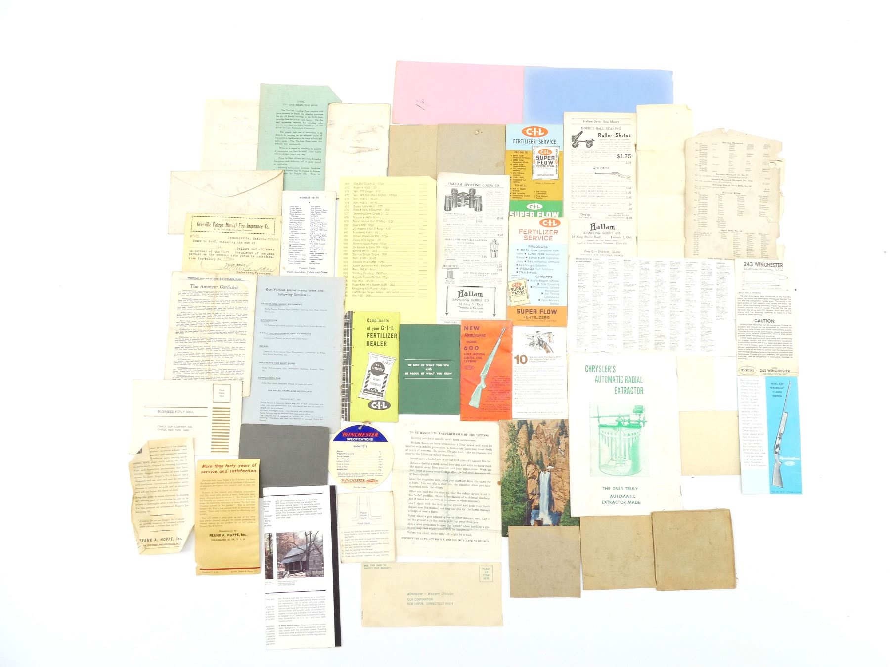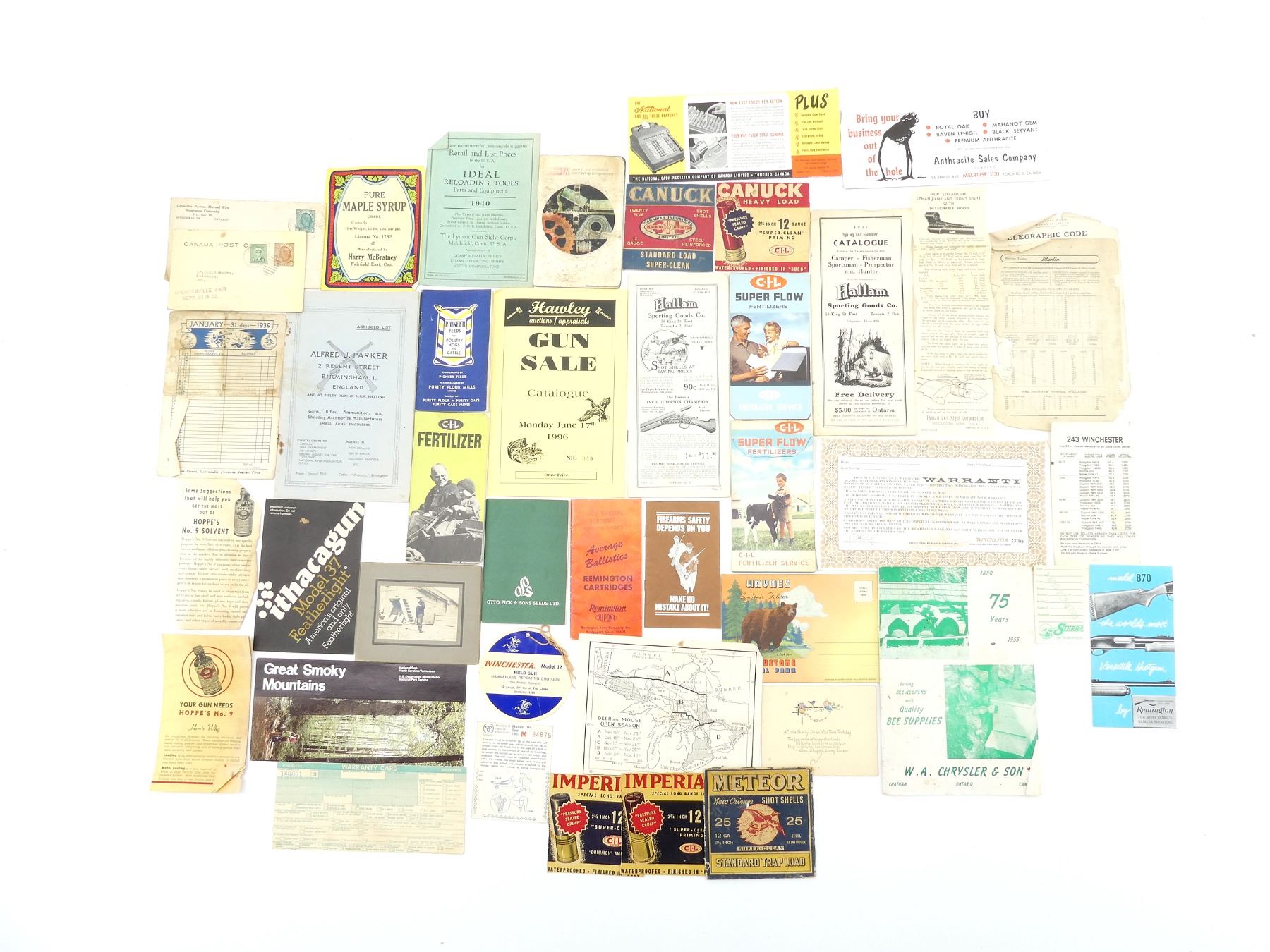 LOT INCLUDES; (1) "HAWLEY AUCTIONS / APPRAISALS GUN SALE CATALOGUE", SOFT COVER, DATED 1996, (1) "HALLAM SPORTING GOODS CO." BROCHURE, SOFT COVER, (1) "PIONEER FEEDS FOR POULTRY HOGS AND CATTLE" POCKET BOOK, SOFT COVER, (1) "OTTO PICK & SONS SEEDS LTD." POCKET BOOK, SOFT COVER & (2) "C-I-L SUPERFLOW FERTILIZERS" NOTEPAD, SOFT COVER, ETC. SEE PHOTOS.