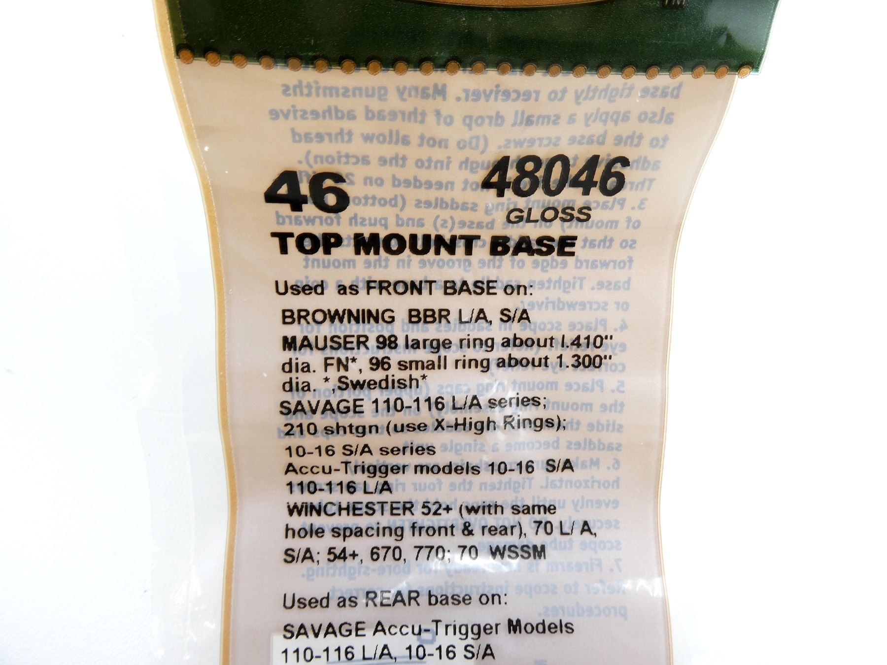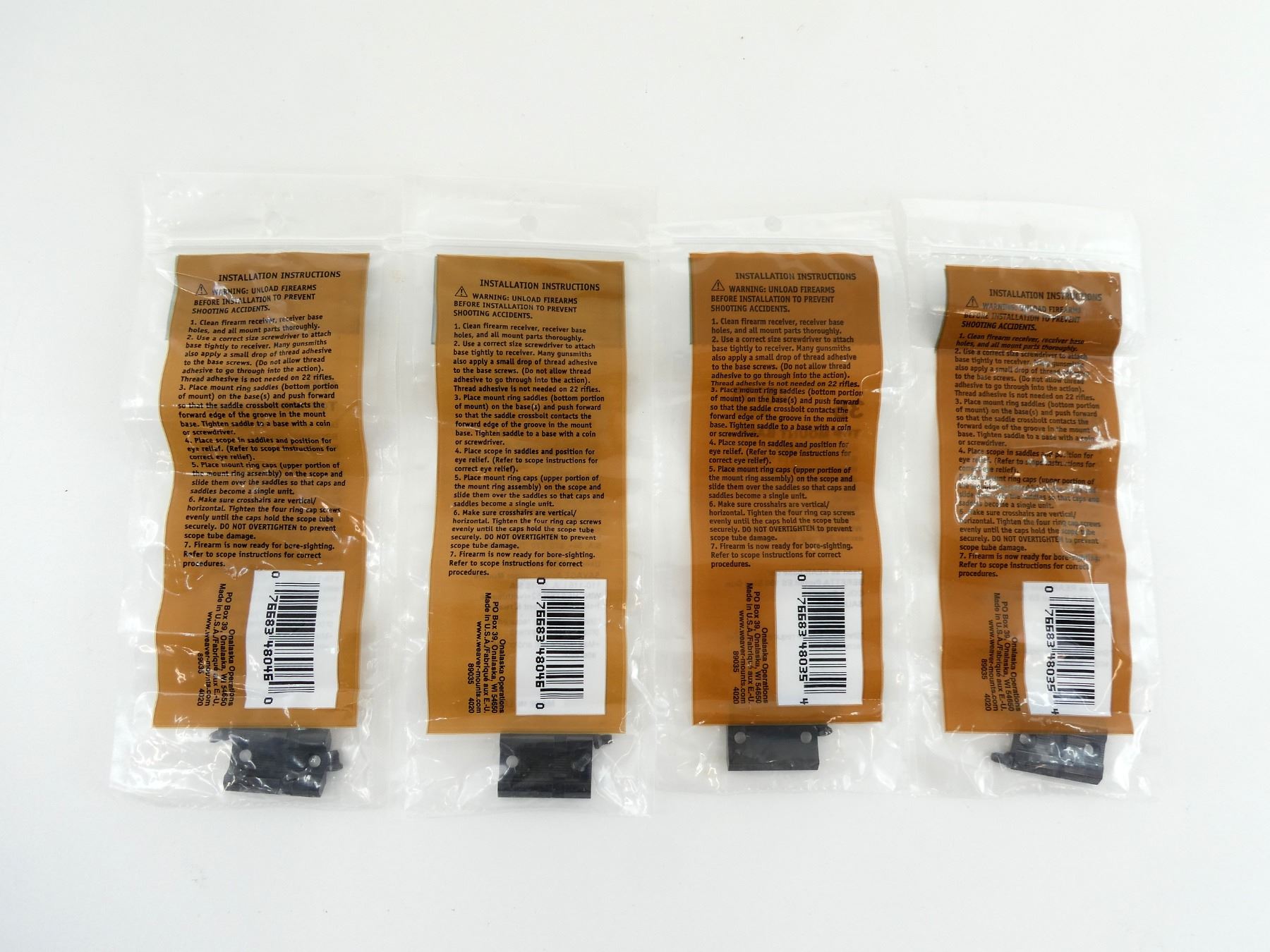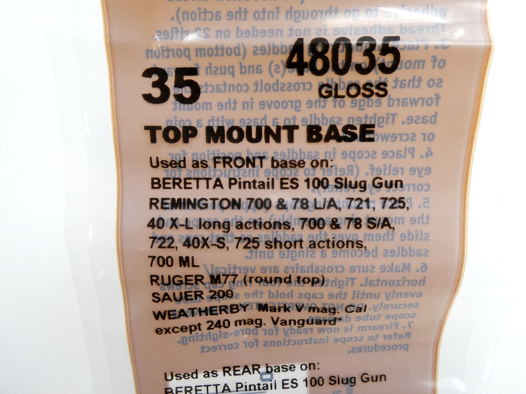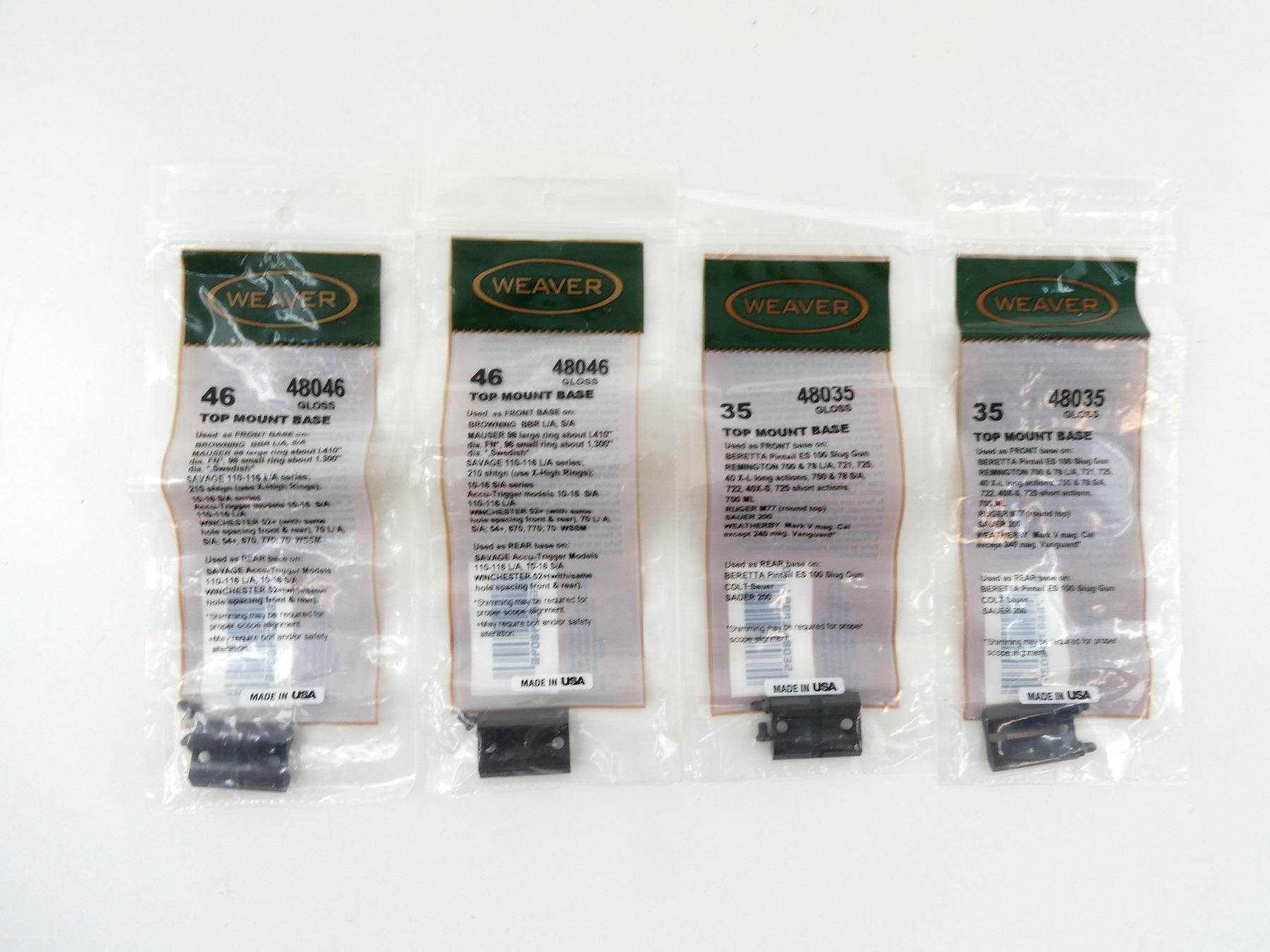 LOT INCLUDES; (2) WEAVER FRONT / REAR TOP MOUNT BASES, NO. 35, GLOSS, MODEL #: 48035, NEW OLD STOCK, SEALED IN ORIGINAL PACKAGING & (2) FRONT / REAR TOP MOUNT BASES, NO. 46, GLOSS, MODEL #: 48046, NEW OLD STOCK, SEALED IN ORIGINAL PACKAGING. MAY REQUIRE FITTING. SEE PHOTOS.