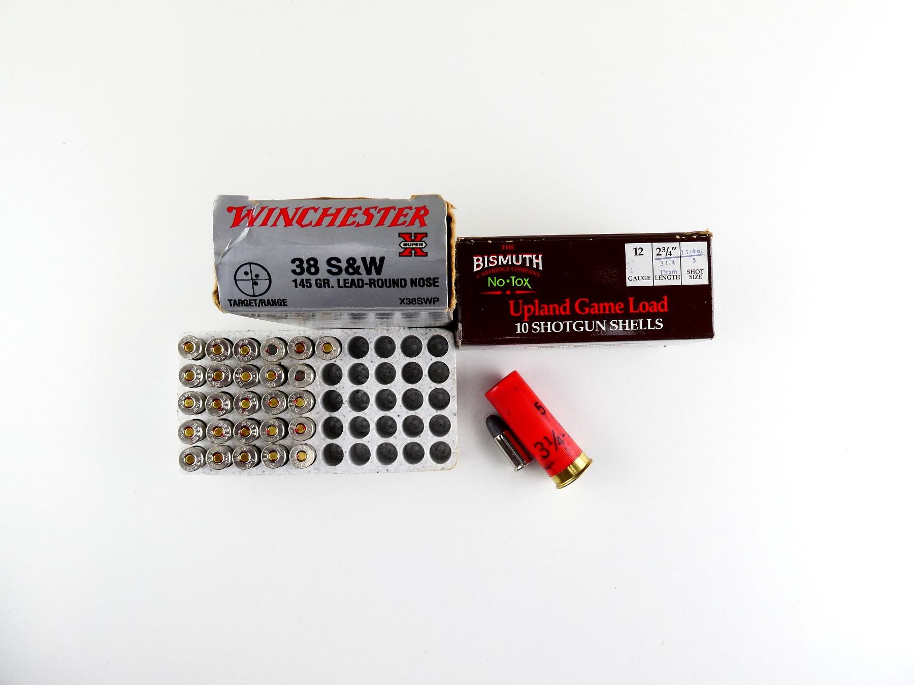 ASSORTED WINCHESTER .38 S&W AND BISMUTH 12 GAUGE 2 3/4" SHOT SHELL AMMO LOT