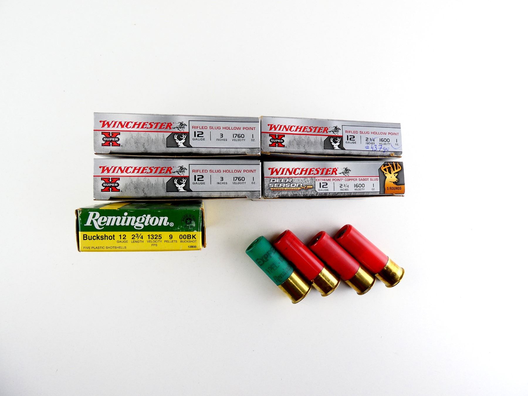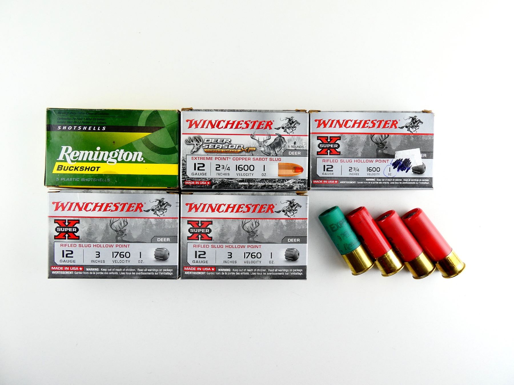 LOT INCLUDES; APPROX. (25) RNDS, VARIOUS SHOT SIZES INCLUDING; #RIFLED SLUG HP, #EXTREME POINT COPPER SABOT SLUG, #00 BUCK.