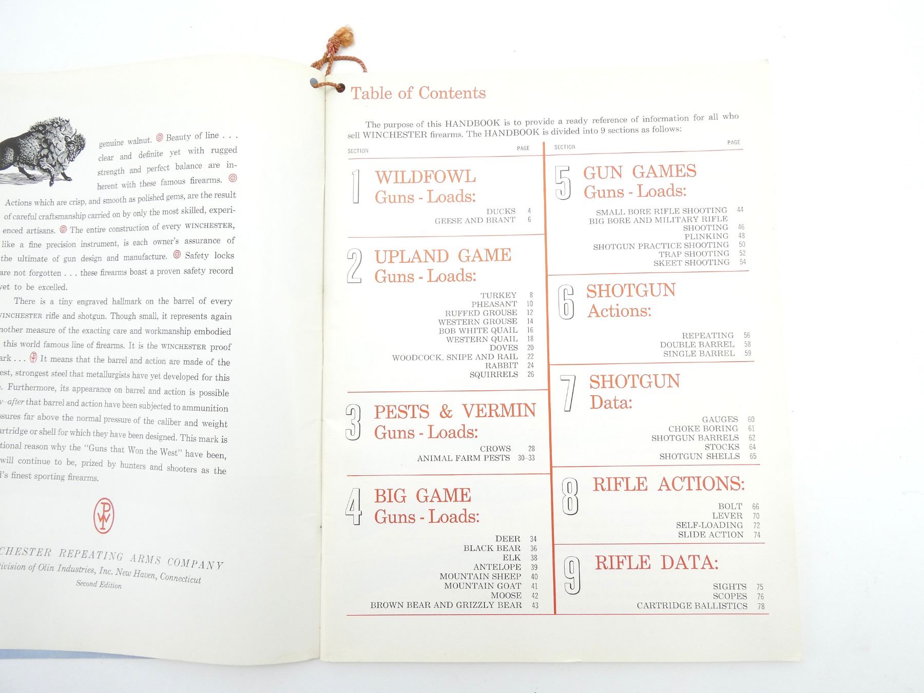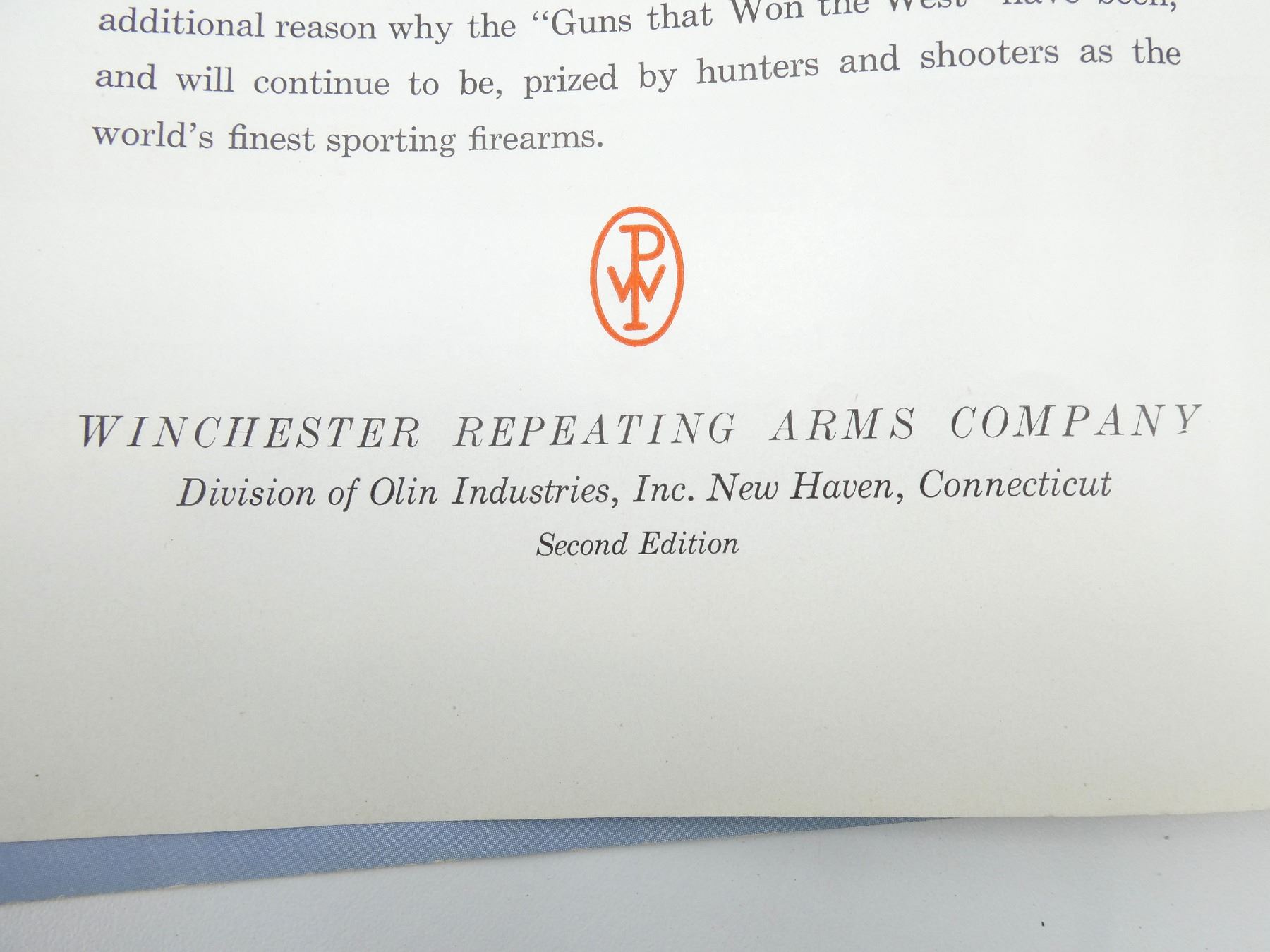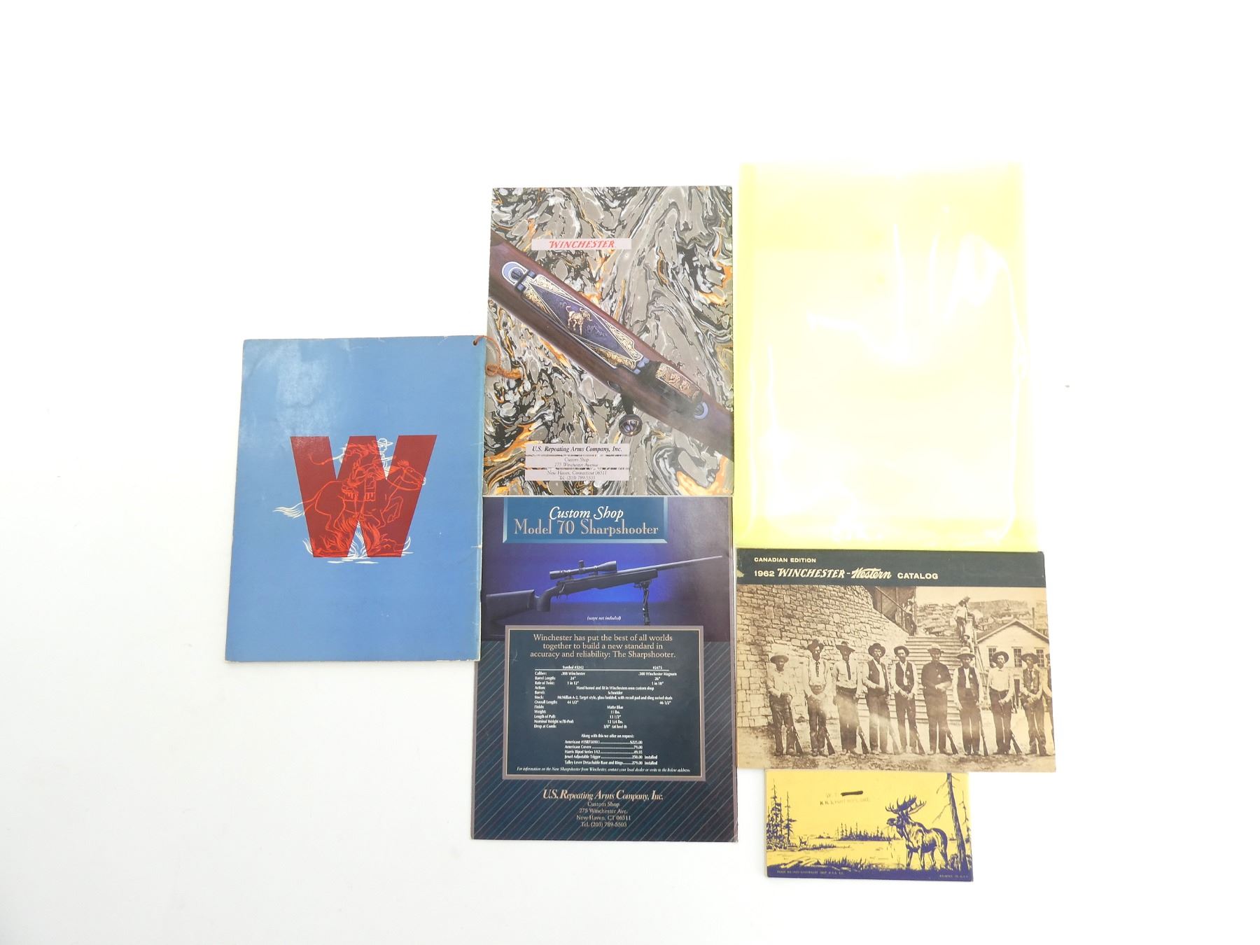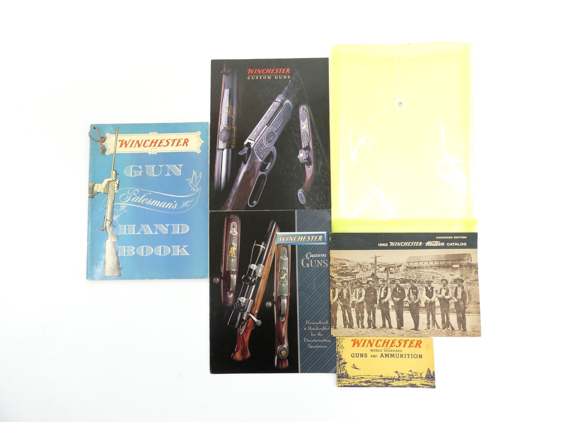 LOT INCLUDES; (1) "1962 WINCHESTER - WESTERN CATALOG", BY OLIN WINCHESTER-WESTERN LTD., SOFT COVER, COPYRIGHT 1962, (2) "WINCHESTER CUSTOM GUNS", BY U.S. REPEATING ARMS COMPANY, INC., SOFT COVER, (1) "WINCHESTER WORLD STANDARD GUNS AND AMMUNITION", BY W.R.A. CO., SOFT COVER, COPYRIGHT 1937 & (1) "WINCHESTER GUN SALESMAN'S HAND BOOK", BY WINCHESTER REPEATING ARMS COMPANY, SOFT COVER. SEE PHOTOS.