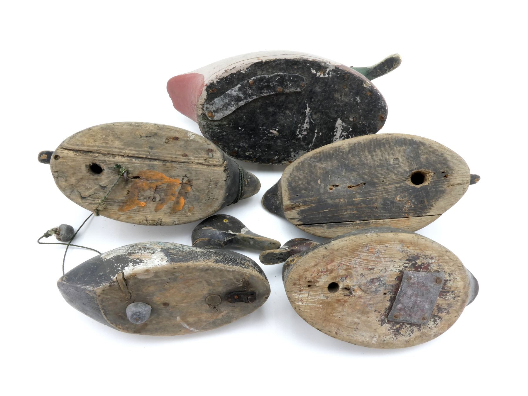 LOT INCLUDES; (5) WOODEN DUCK DECOYS, VARIOUS SIZES, SOME WITH WEIGHTS / SOME WITHOUT, VARIOUS COLOURS / PAINTED, SOME WITH VARIOUS ETCHINGS / MARKINGS, SHOWS WEAR / TEAR. SEE PHOTOS.