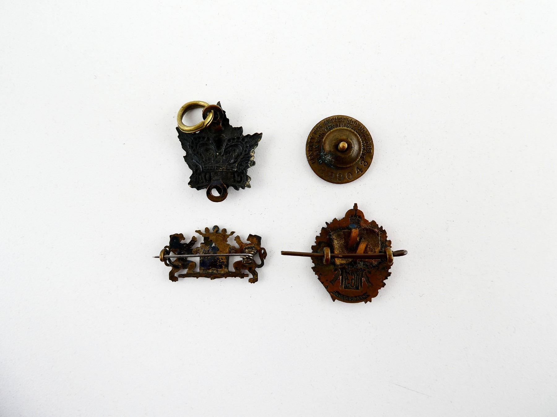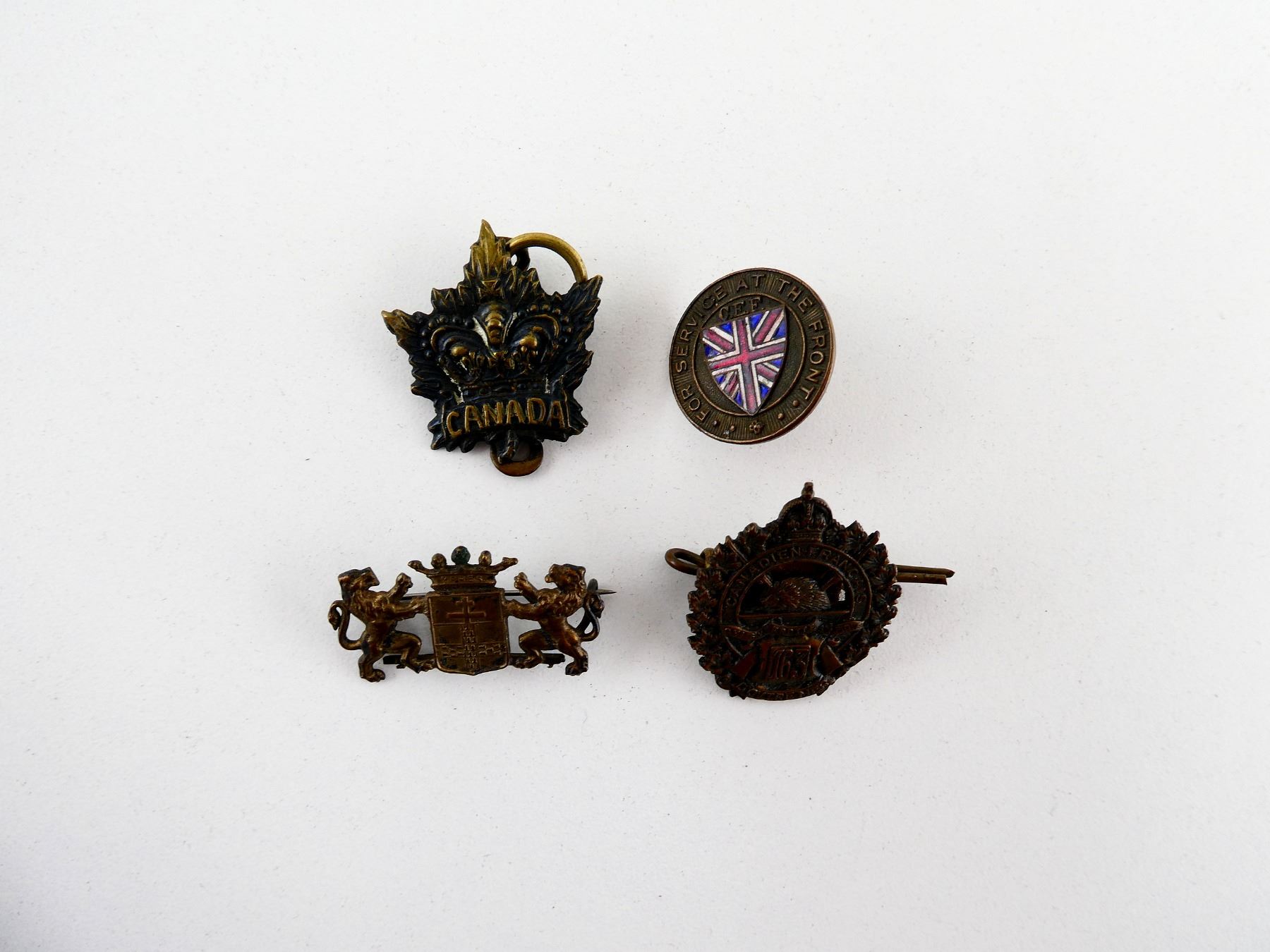 LOT INCLUDES; (1) 163RD BATTALION (FRENCH-CANADIAN) CEF CAP BADGE, (1) CEF "FOR SERVICE AT THE FRONT" PIN, BACK MARKED: "299043" ETC., (1) WWI STYLE MAPLE LEAF BADGE MARKED "CANADA" & (1) WWI ERA YPRES SOUVENIR PIN. SEE PHOTOS.