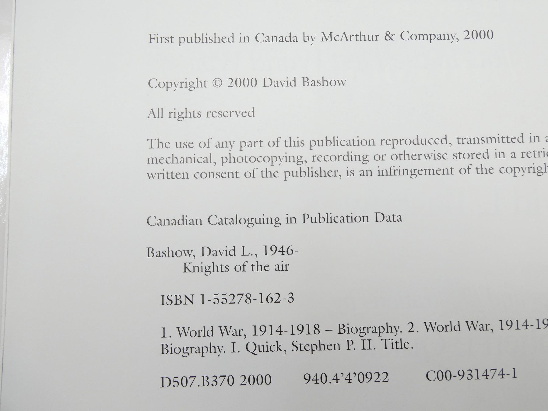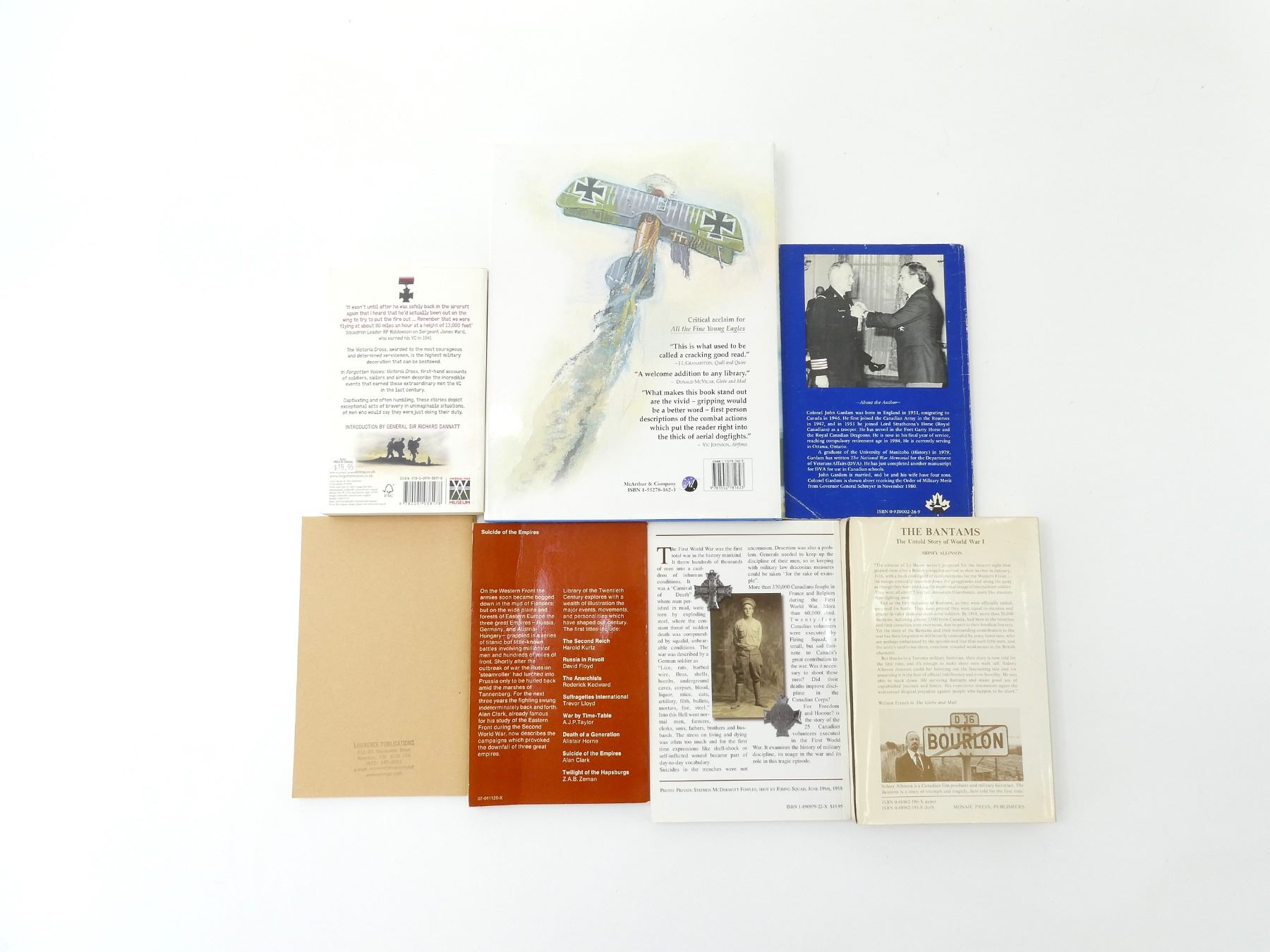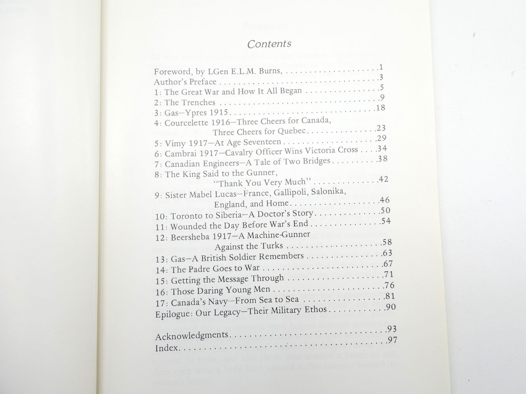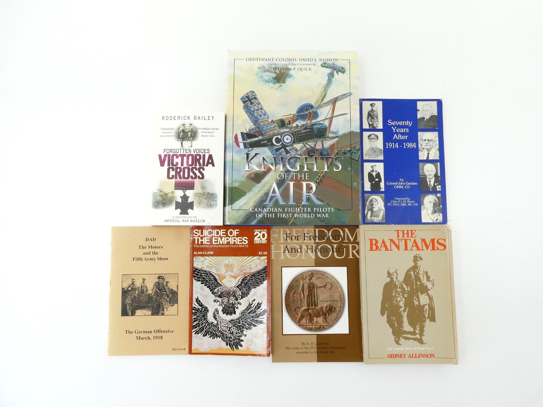 LOT INCLUDES; (1) "KNIGHTS OF THE AIR, CANADIAN FIGHTER PILOTS IN THE FIRST WORLD WAR" BOOK BY DAVID L. BASHOW, HARD COVER WITH DUST COVER, ISBN: 1-55278-162-3, (1) "SEVENTY YEARS AFTER 1914-1984" BOOK BY COLONEL JOHN GARDAM OMM, CD, SOFT COVER, ISBN: 0-920002-26-9, (1) "THE BANTAMS, THE UNTOLD STORY OF WORLD WAR I" BOOK BY SIDNEY ALLINSON, SOFT COVER, ISBN: 0-88962-190-X, (1) "FOR FREEDOM AND HONOUR?" BOOK BY A.B. GODEFROY, SIGNED BY AUTHOR, SOFT COVER, ISBN: 1-896979-22-X, (1) "SUICIDE OF THE EMPIRES, THE BATTLES ON THE EASTERN FRONT 1914-18" BOOK BY ALAN CLARK, SOFT COVER, ISBN: 07-011126-X, (1) "DAD, THE MOTORS AND THE FIFTH ARMY SHOW" BOOK BY ALEX LYNCH, 2ND EDITION, SOFT COVER, COPYRIGHT 2003 & (1) "FORGOTTEN VOICES, VICTORIA CROSS" BOOK BY RODERICK BAILEY, SOFT COVER, ISBN: 978-0-0919-3817-8. SEE PHOTOS.