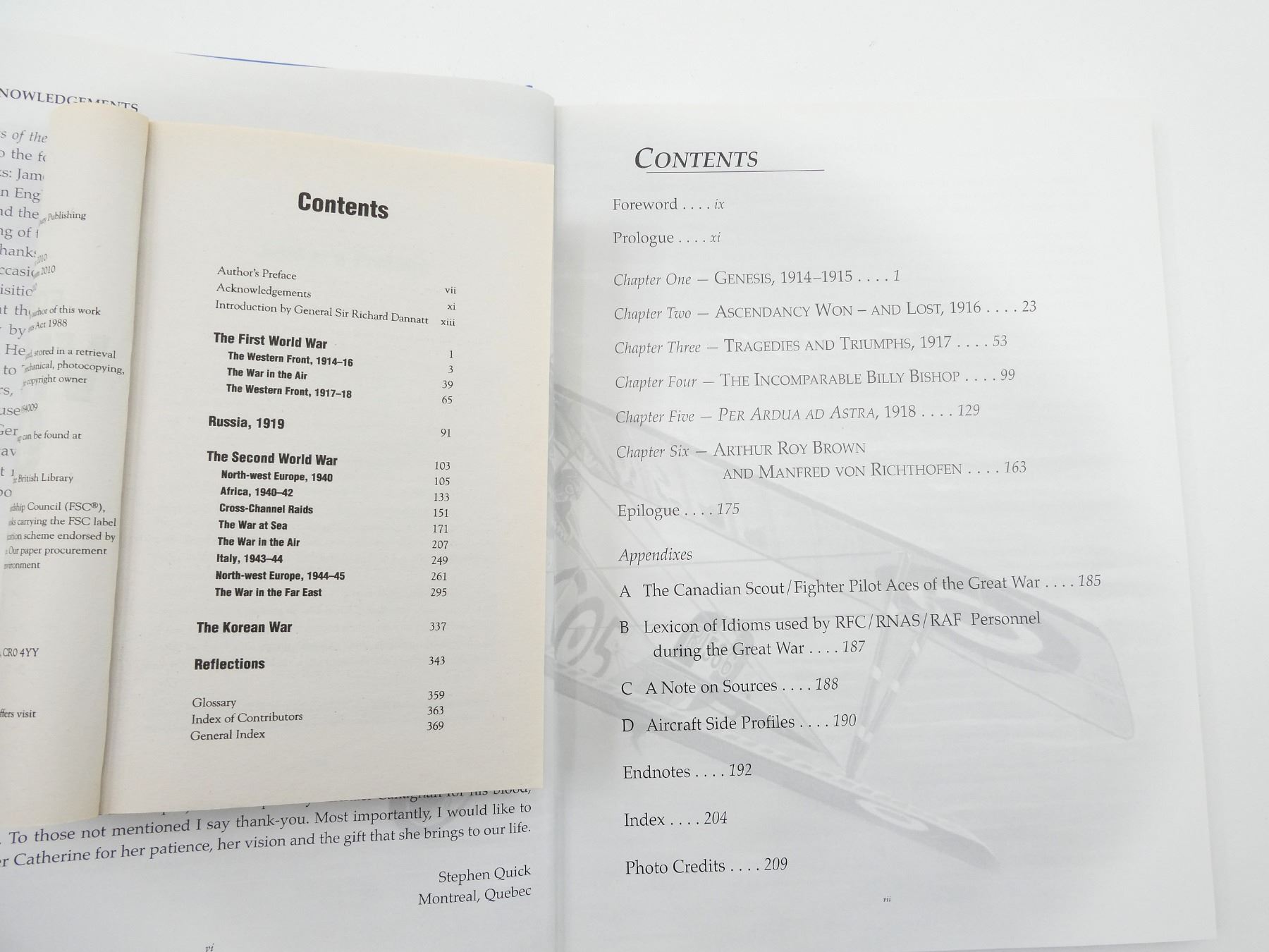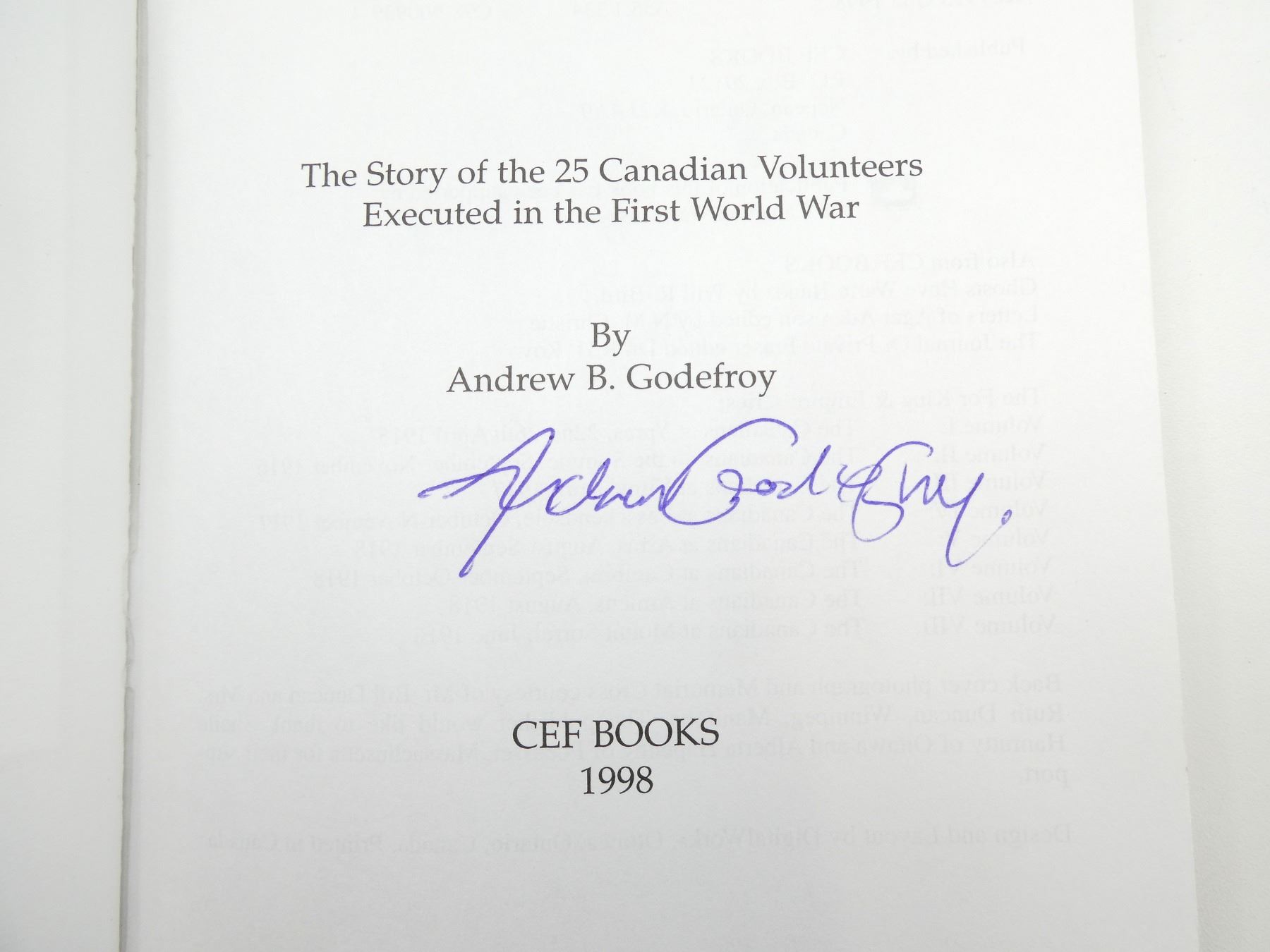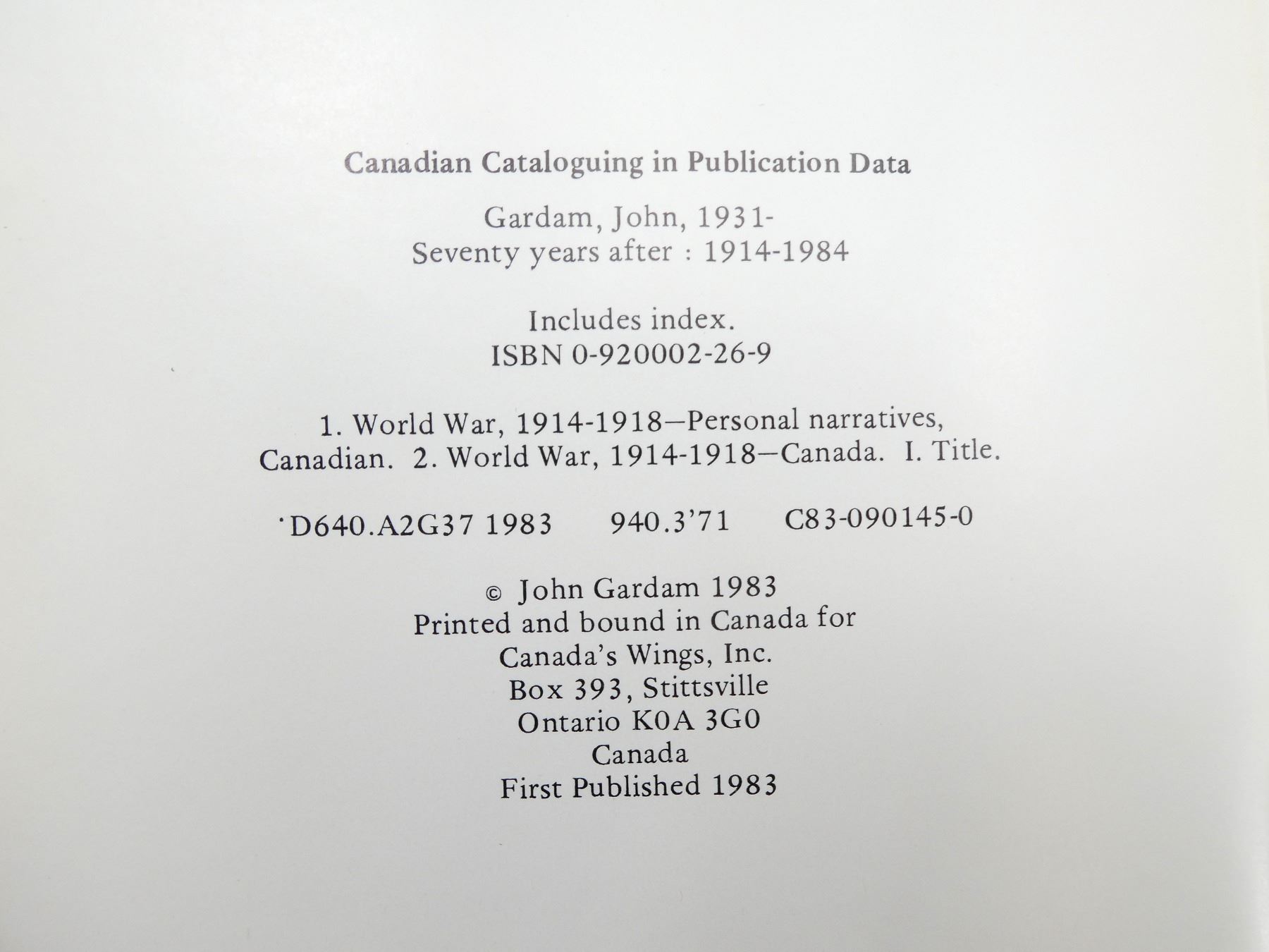 LOT INCLUDES; (1) "KNIGHTS OF THE AIR, CANADIAN FIGHTER PILOTS IN THE FIRST WORLD WAR" BOOK BY DAVID L. BASHOW, HARD COVER WITH DUST COVER, ISBN: 1-55278-162-3, (1) "SEVENTY YEARS AFTER 1914-1984" BOOK BY COLONEL JOHN GARDAM OMM, CD, SOFT COVER, ISBN: 0-920002-26-9, (1) "THE BANTAMS, THE UNTOLD STORY OF WORLD WAR I" BOOK BY SIDNEY ALLINSON, SOFT COVER, ISBN: 0-88962-190-X, (1) "FOR FREEDOM AND HONOUR?" BOOK BY A.B. GODEFROY, SIGNED BY AUTHOR, SOFT COVER, ISBN: 1-896979-22-X, (1) "SUICIDE OF THE EMPIRES, THE BATTLES ON THE EASTERN FRONT 1914-18" BOOK BY ALAN CLARK, SOFT COVER, ISBN: 07-011126-X, (1) "DAD, THE MOTORS AND THE FIFTH ARMY SHOW" BOOK BY ALEX LYNCH, 2ND EDITION, SOFT COVER, COPYRIGHT 2003 & (1) "FORGOTTEN VOICES, VICTORIA CROSS" BOOK BY RODERICK BAILEY, SOFT COVER, ISBN: 978-0-0919-3817-8. SEE PHOTOS.