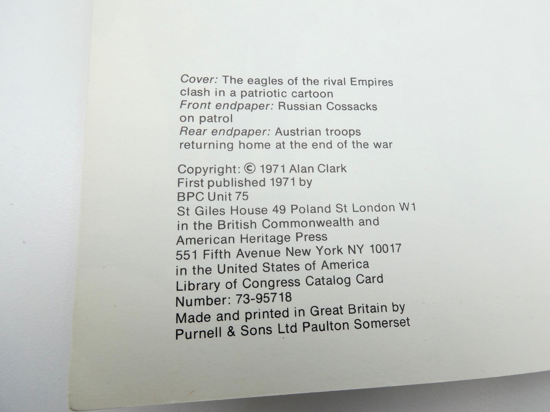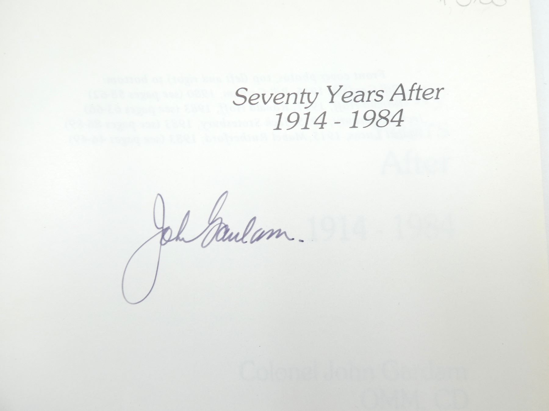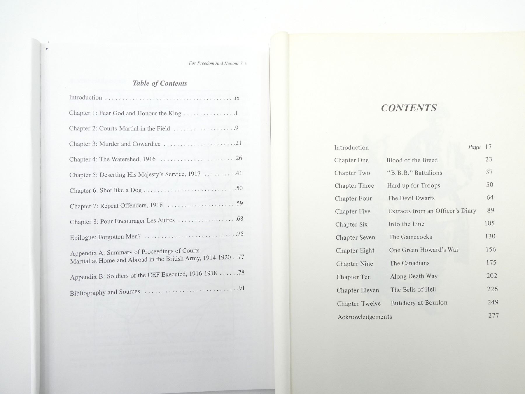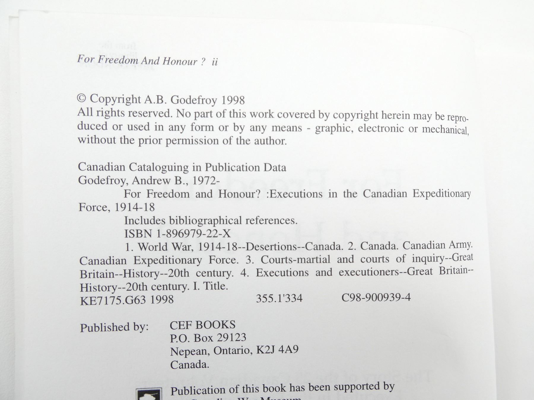 LOT INCLUDES; (1) "KNIGHTS OF THE AIR, CANADIAN FIGHTER PILOTS IN THE FIRST WORLD WAR" BOOK BY DAVID L. BASHOW, HARD COVER WITH DUST COVER, ISBN: 1-55278-162-3, (1) "SEVENTY YEARS AFTER 1914-1984" BOOK BY COLONEL JOHN GARDAM OMM, CD, SOFT COVER, ISBN: 0-920002-26-9, (1) "THE BANTAMS, THE UNTOLD STORY OF WORLD WAR I" BOOK BY SIDNEY ALLINSON, SOFT COVER, ISBN: 0-88962-190-X, (1) "FOR FREEDOM AND HONOUR?" BOOK BY A.B. GODEFROY, SIGNED BY AUTHOR, SOFT COVER, ISBN: 1-896979-22-X, (1) "SUICIDE OF THE EMPIRES, THE BATTLES ON THE EASTERN FRONT 1914-18" BOOK BY ALAN CLARK, SOFT COVER, ISBN: 07-011126-X, (1) "DAD, THE MOTORS AND THE FIFTH ARMY SHOW" BOOK BY ALEX LYNCH, 2ND EDITION, SOFT COVER, COPYRIGHT 2003 & (1) "FORGOTTEN VOICES, VICTORIA CROSS" BOOK BY RODERICK BAILEY, SOFT COVER, ISBN: 978-0-0919-3817-8. SEE PHOTOS.