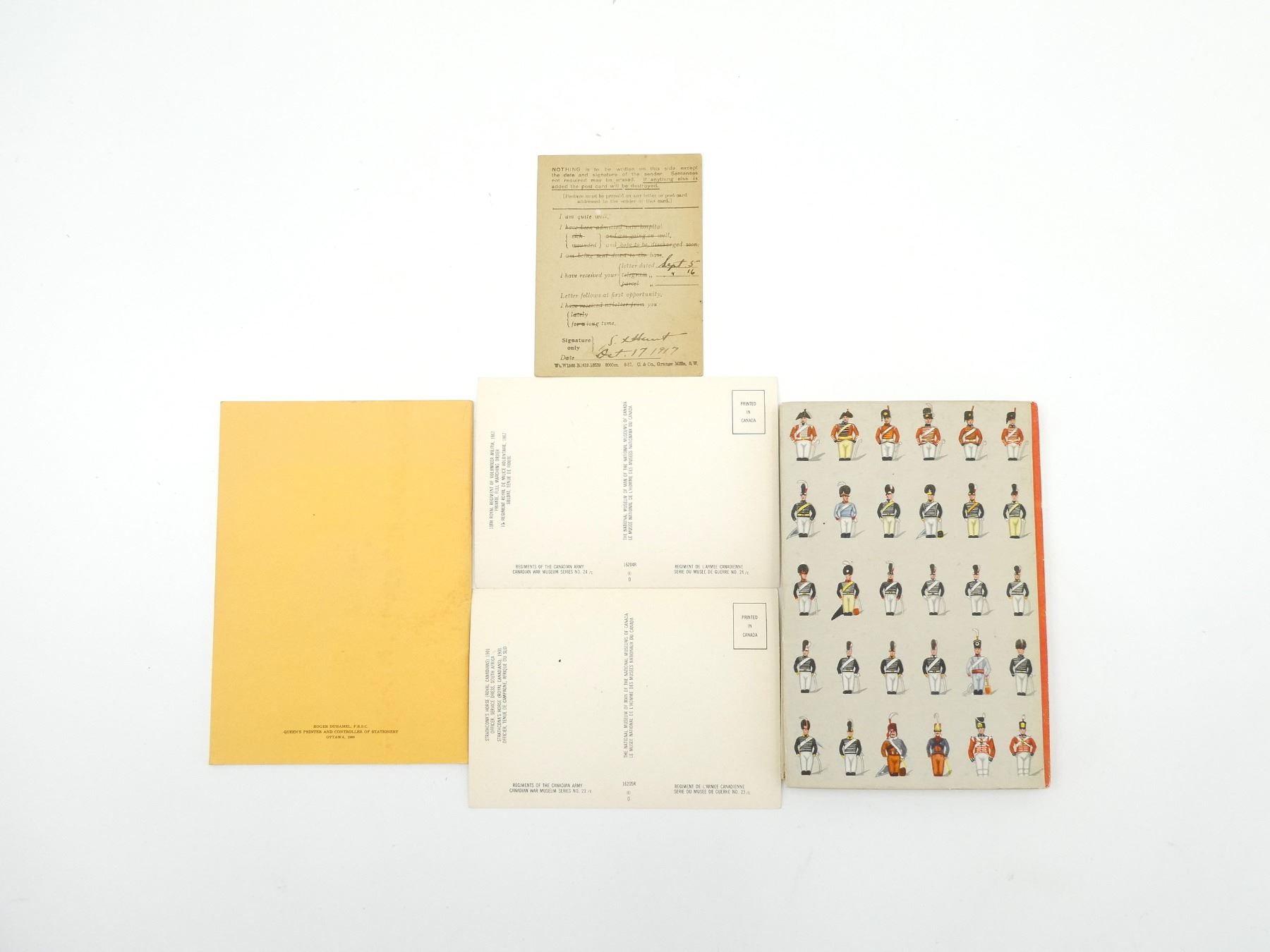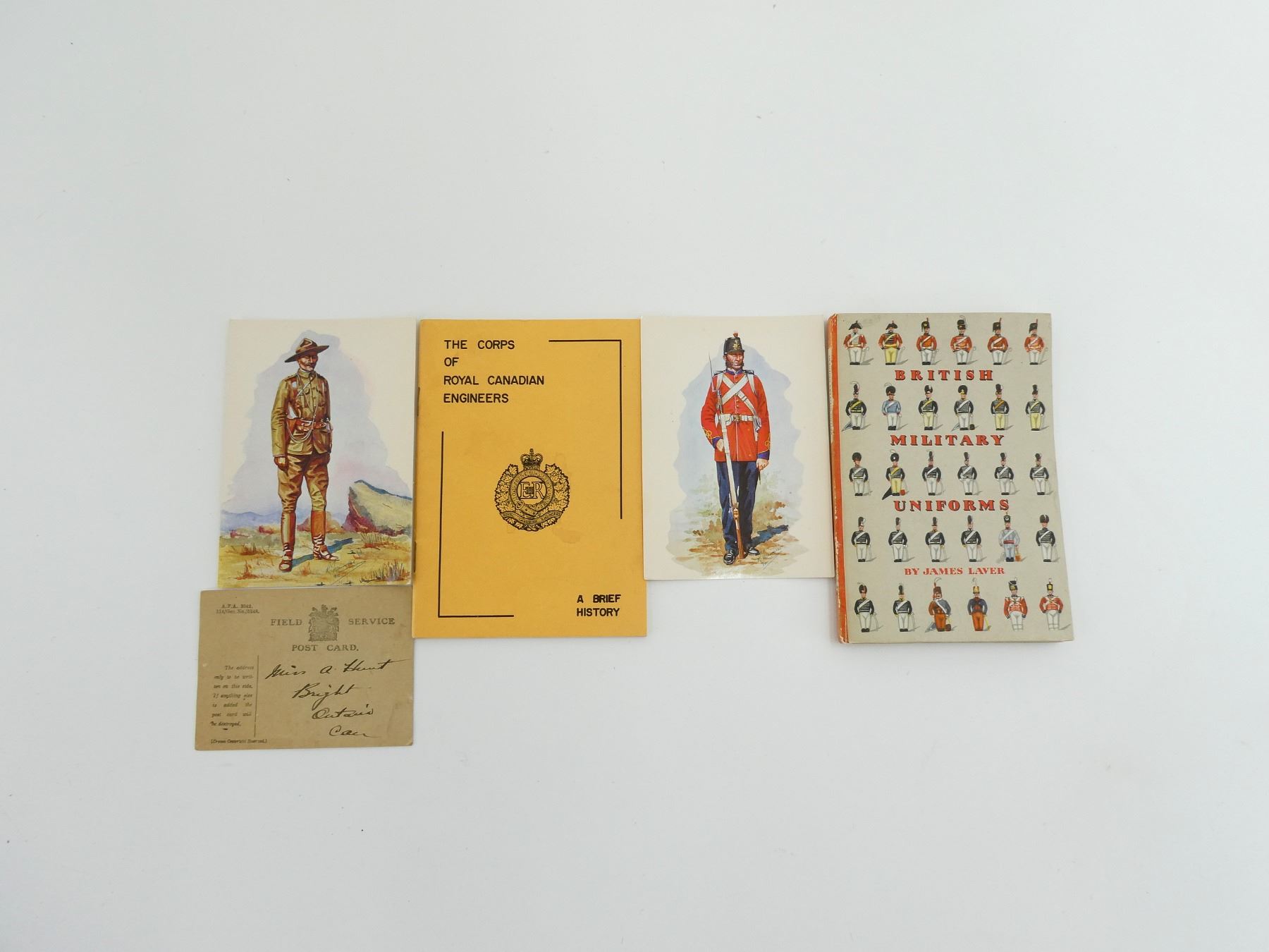 LOT INCLUDES; (1) WWI CANADIAN ARMY FIELD SERVICE POST CARD, DATED OCT 17 1917, (1) 10TH ROYAL REGIMENT OF VOLUNTEER MILITIA, 1867 PRIVATE, FULL MARCHING ORDER CANADIAN POST CARD, (1) STRATHCONA'S HORSE (ROYAL CANADIANS) 1901 OFFICER, SERVICE DRESS, SOUTH AFRICA CANADIAN POST CARD, (1) "THE CORPS OF ROYAL CANADIAN ENGINEERS, A BRIEF HISTORY" BOOKLET, SOFT COVER, 1960 & (1) "BRITISH MILITARY UNIFORMS" BOOK BY JAMES LAVER, HARD COVER, 1948. SEE PHOTOS.