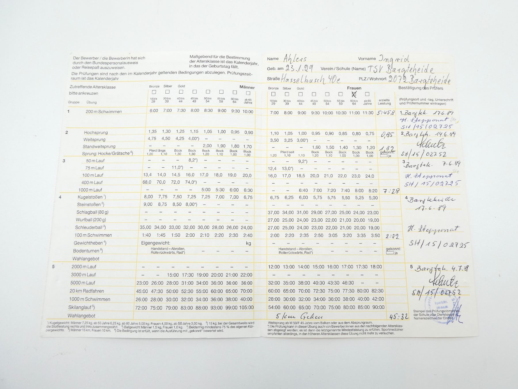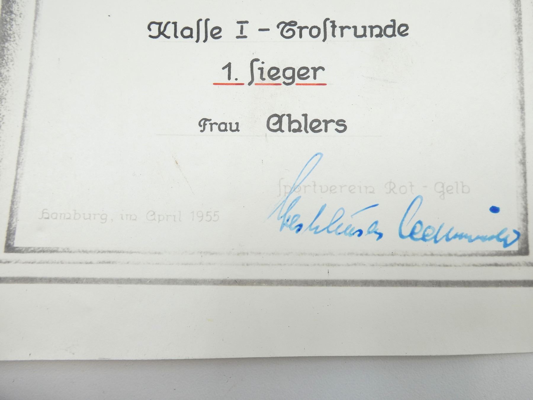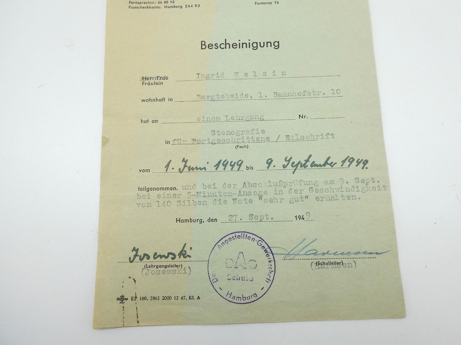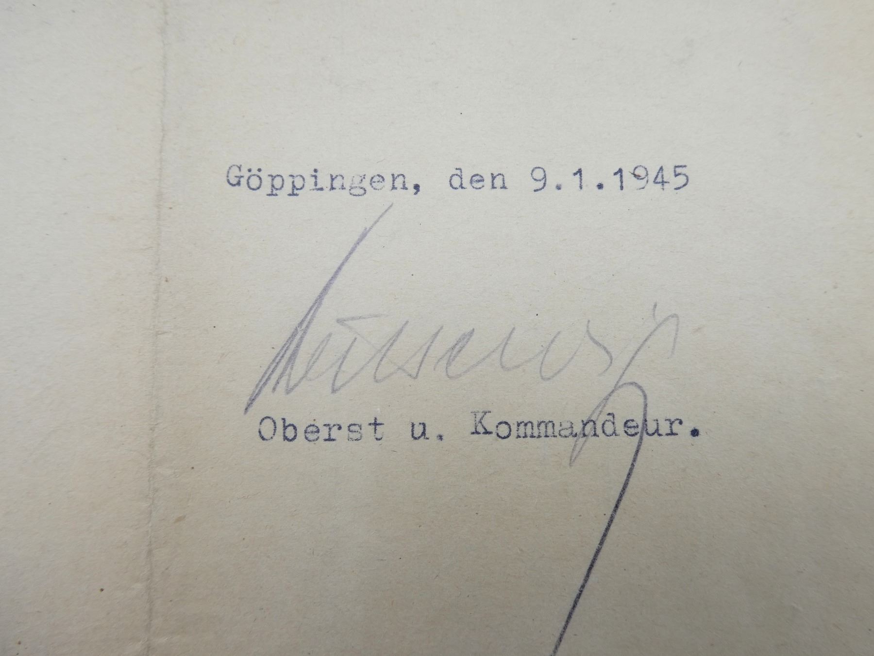 APPROX. (15) PIECES, MOST PIECES IN GERMAN, INCLUDES; NOMINATION LIST FOR WAR MERIT CROSS 1ST CLASS OF FLIGHT SCHOOL (A) 116 SIGNED BY FLIGHT SCHOOL COMMANDER / DATED 9.1.1945, "GEWEHR 43 (G 43), MIT GEWEHR-ZIELFERNROHR 4-FACH (GW ZF 4-FACH)" FIELD MANUAL, "DIE PANZERFAUST-60M" BOOKLET DATED OCTOBER 25 1943, GERMAN SHELL COMPANY RESIGNATION LETTERS FOR AN INGRID AHLERS DATED 30.6.1968, SCHOOL CERTIFICATES FOR AN INGRID WELZIN DATED 1949, THREE MARINES / BUNDESWEHR STICKERS, ETC. SEE PHOTOS.