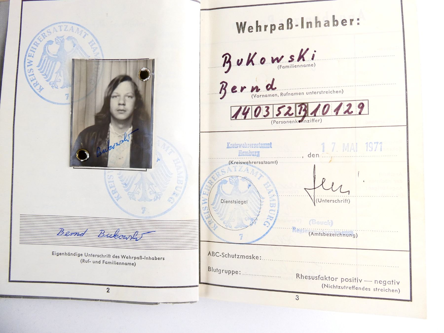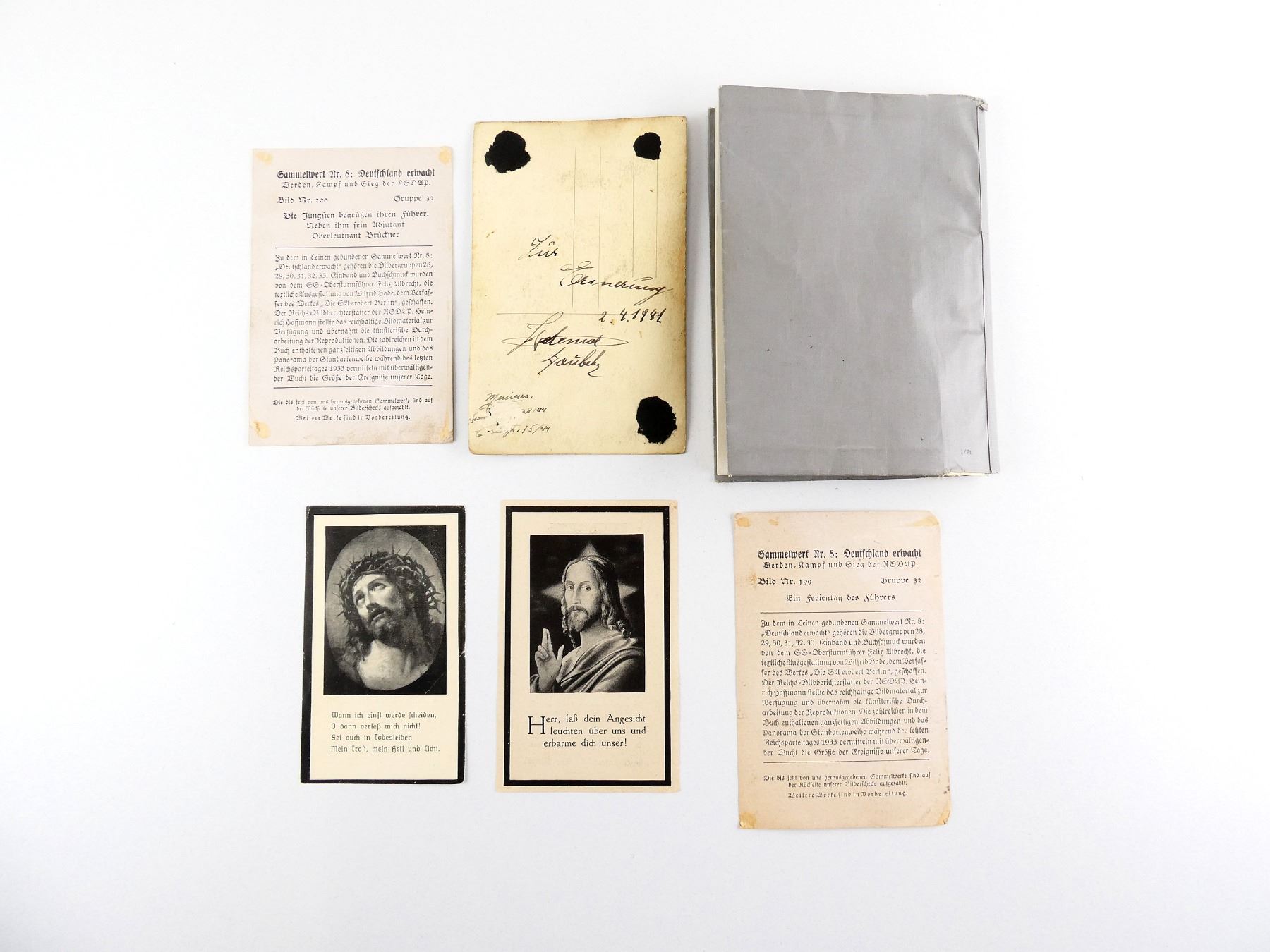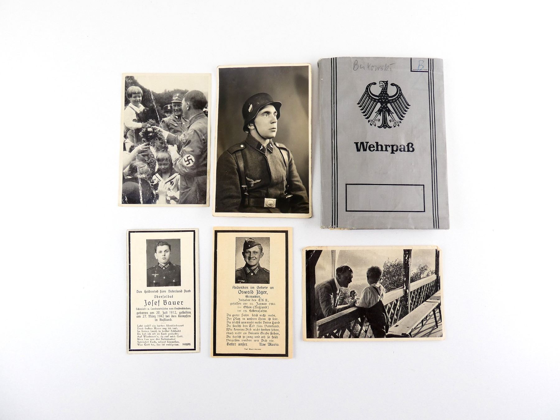 LOT INCLUDES; (2) WWII DEATH CARDS WITH PICTURES OF THE DECEASED SOLDIERS, JOSEF BAUER DIED 27 MARCH 1942, OSWALD JAGER DIED 14 JANUARY 1944, (1) WWII GERMAN LUFTWAFFE SOLDIER PICTURE POSTCARD, DATED 2. 4. 1941 WITH VARIOUS HAND-WRITTEN MARKINGS, (2) WWII COLLECTION NO. 8 GERMANY AWAKENS PROPAGANDA PHOTOS, GROUP 32 IMAGE NUMBERS 199 & 200, PHOTOS OF HITLER & (1) 1970'S GERMAN MILITARY RECORDS BOOK, NAMED TO: "BERND BUKOWSKI", DATED MAY 17 1971. SEE PHOTOS.