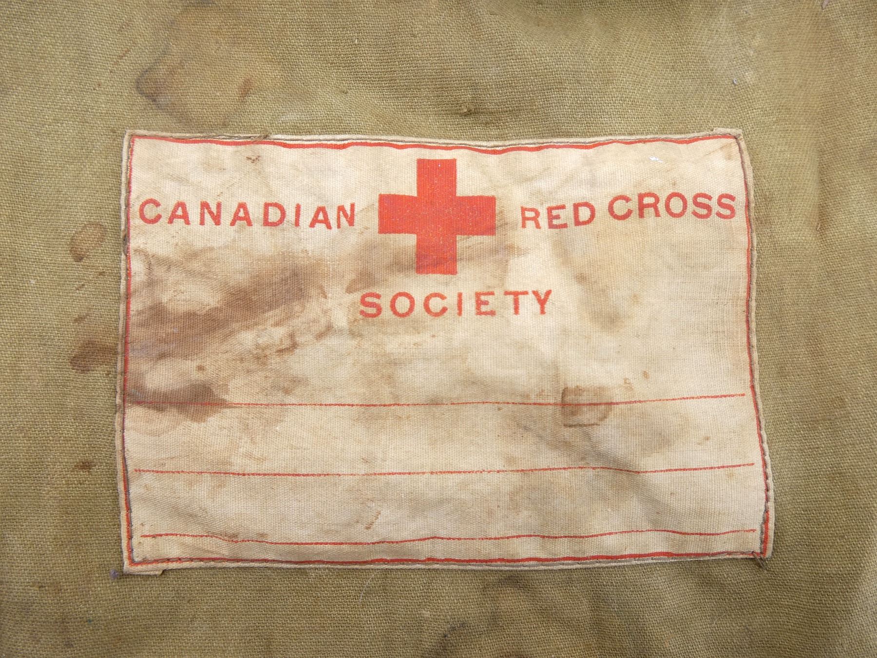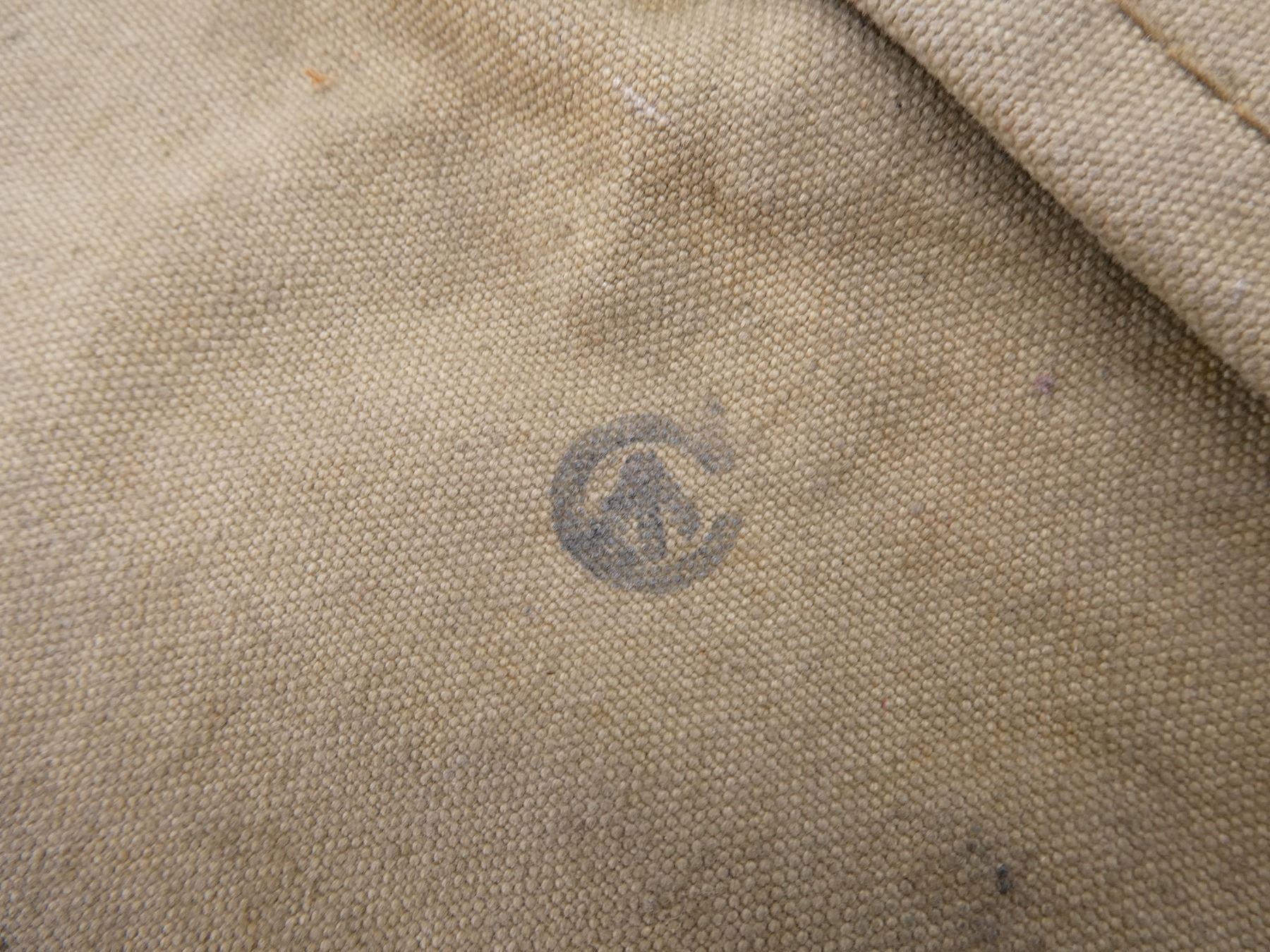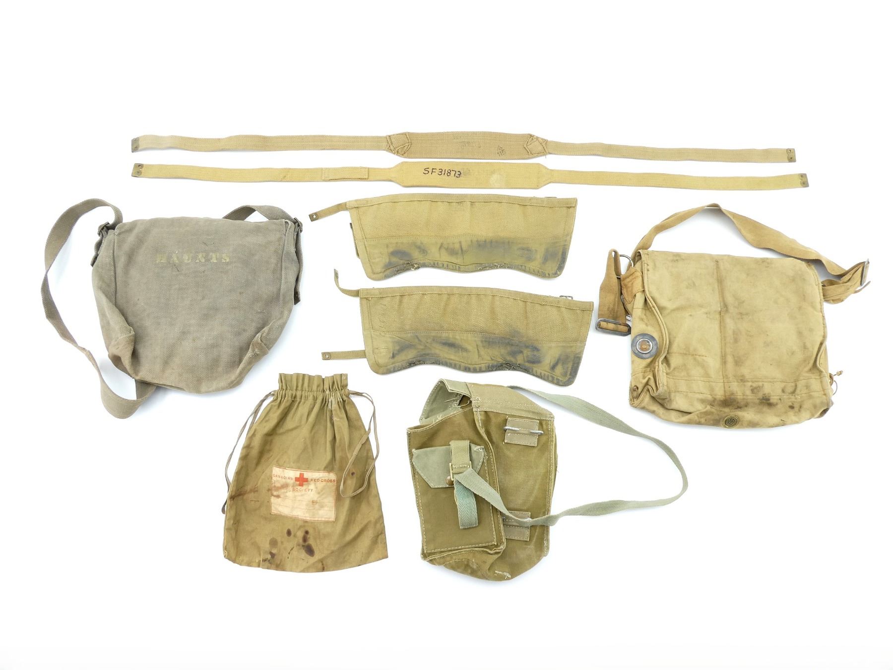 LOT INCLUDES; (1) WWII CANADIAN GREY / BLUE P37 WEB CANVAS SMALL FIELD PACK, MARKED: "C.C.L., AM 1941" WITH FAINT C-BROAD ARROW, BROAD ARROW OVER "78", VARIOUS HAND-WRITTEN MARKINGS, WITH SHOULDER STRAP, SHOWS AGE / WEAR, (1) WWII CANADIAN GAS MASK BAG, FAINTLY MARKED: "VII", "1943" WITH C-BROAD ARROW, VARIOUS OTHER FAINT / UN-CLEAR MARKINGS, VARIOUS POCKETS, TAN CANVAS SHOULDER STRAP, SHOWS AGE / WEAR, (1) TAN CANVAS DRAWSTRING BAG, MARKED: "CANADIAN RED CROSS, SOCIETY" WITH RED CROSS SYMBOL, SHOWS AGE / WEAR, (1) WWII BRITISH LIGHT GAS MASK CARRY BAG, MARKED: "M.H. & CO., 1943, LIGHT II" WITH BROAD ARROW, GREEN CANVAS SHOULDER STRAP, SHOWS AGE / WEAR, (2) TAN P37 WEB SHOULDER STRAPS, ONE MARKED WITH FAINT C-BROAD ARROW, HAND-WRITTEN: "SF31873", OTHER MARKED WITH BROAD ARROW OVER "115", VARIOUS OTHER FAINT / UN-CLEAR MARKINGS, OALS APPROX. 46.25" & (1) PAIR OF GAITERS, TAN P37 WEB, MARKED WITH C-BROAD ARROWS, SHOWS AGE / WEAR. SEE PHOTOS.
